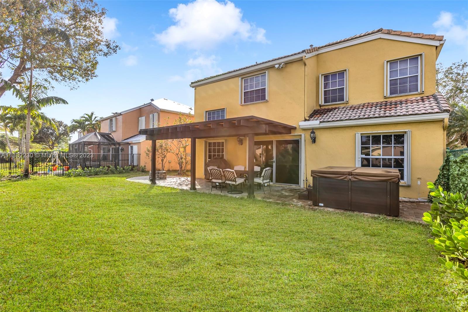 Gorgeous home with serene view of water nestled in this very desirable neighborhood, Ventana. All bedrooms are upstairs. Tastefully updated with decorator features throughout. Gourmet kitchen offers newer stainless appliances, custom backsplash, pantry pullouts, & counter seating. Enjoy a meal in the formal dining area or casual dinette area with views of the water. Formal living room boasts volume ceilings & loads of natural light throughout. Marble tile in all living areas & kitchen. New carpet in bedrooms & new wood look tile upstairs. Oversized primary suite offers a large walk-in closet & bathroom with a soaking tub, double vanity & separate shower. Enjoy a private, tropical oasis with pergola, oversized hot tub & fire-pit. Electrical panel 2016, A/C 2018. This beauty won't last!
