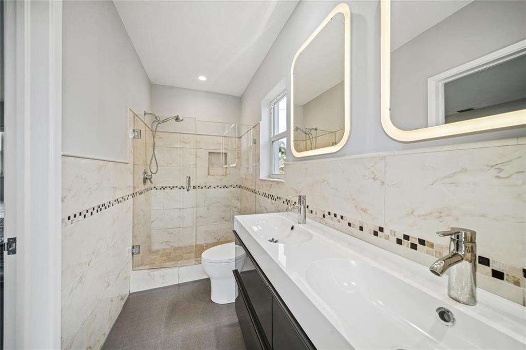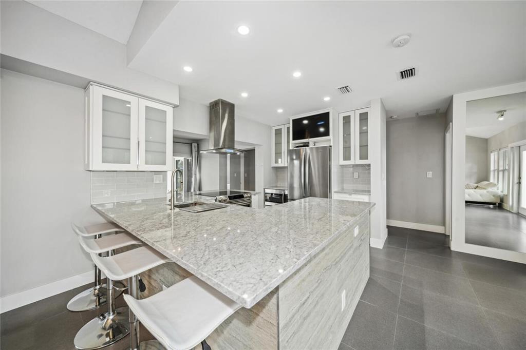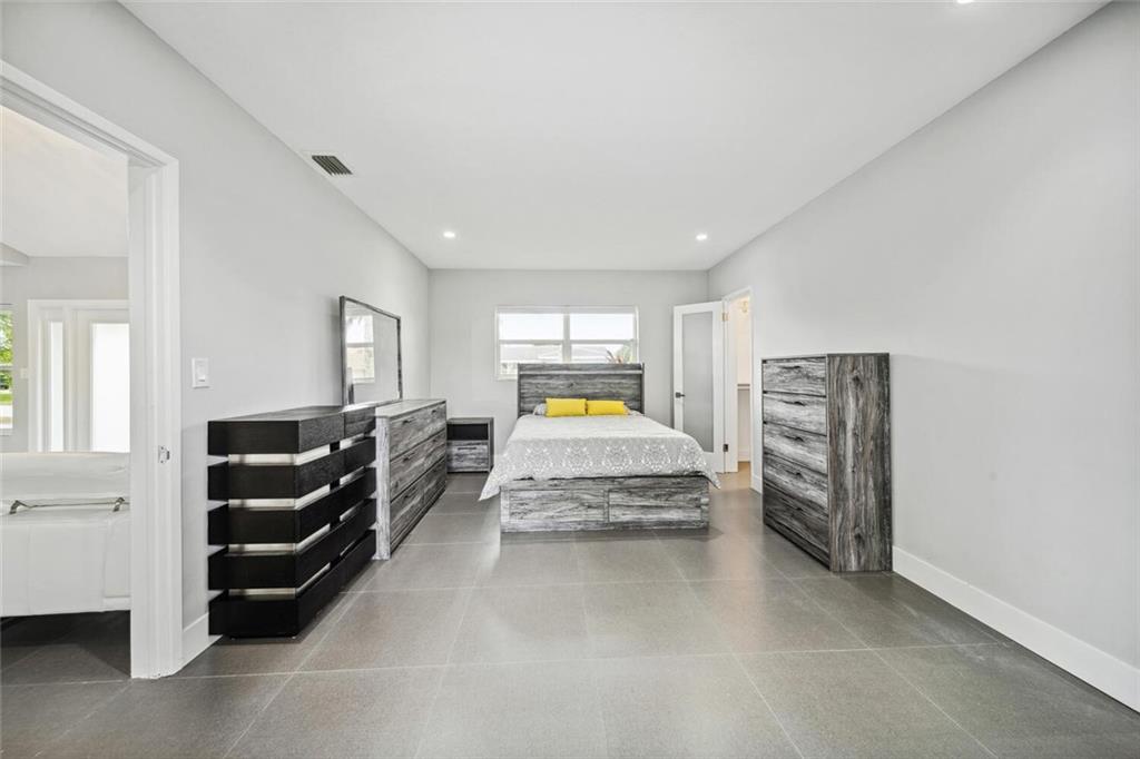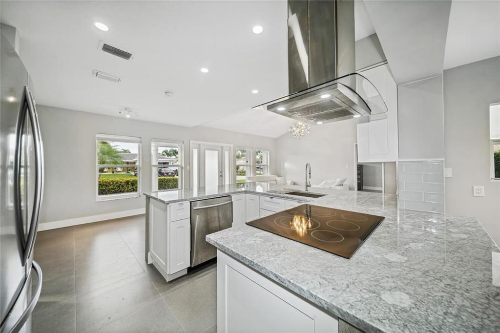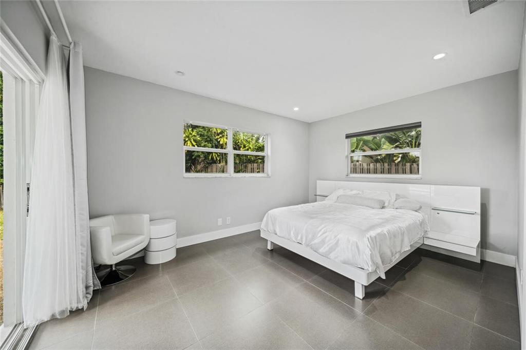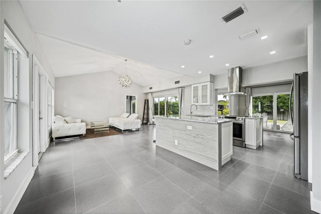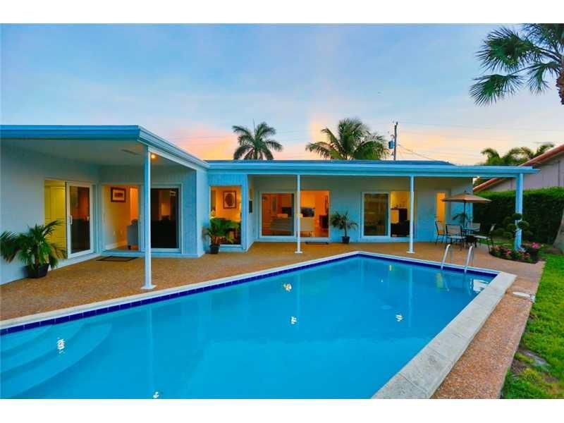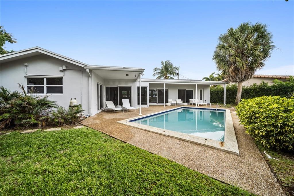 Gorgeously remodeled modern 3 bedroom and 2 bathroom waterfront pool home on an oversize lot located in desirable Coral Ridge Isles. This home features a 2 car garage, an open floor plan consisting of impact windows and doors throughout, large 26" porcelain tile consistent throughout the entire house, and a beautiful white Carrera marble eat-in kitchen. Enjoy your private backyard oasis with large covered porches, sparkling beautiful pool, and a private dock. *Square footage, room measurements, and other measurements are estimated and exact measurements should be independently measured and verified by a licensed professional.