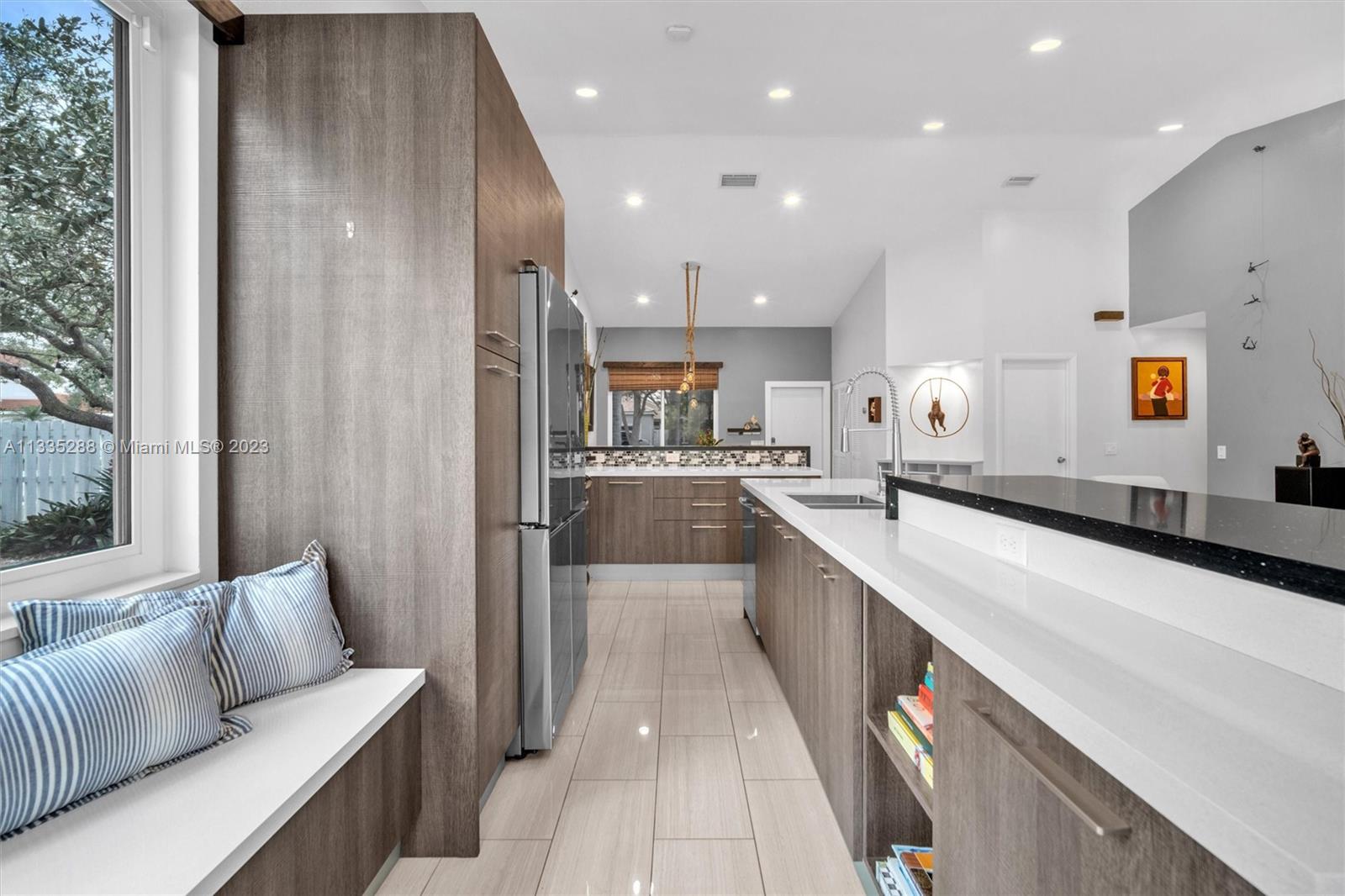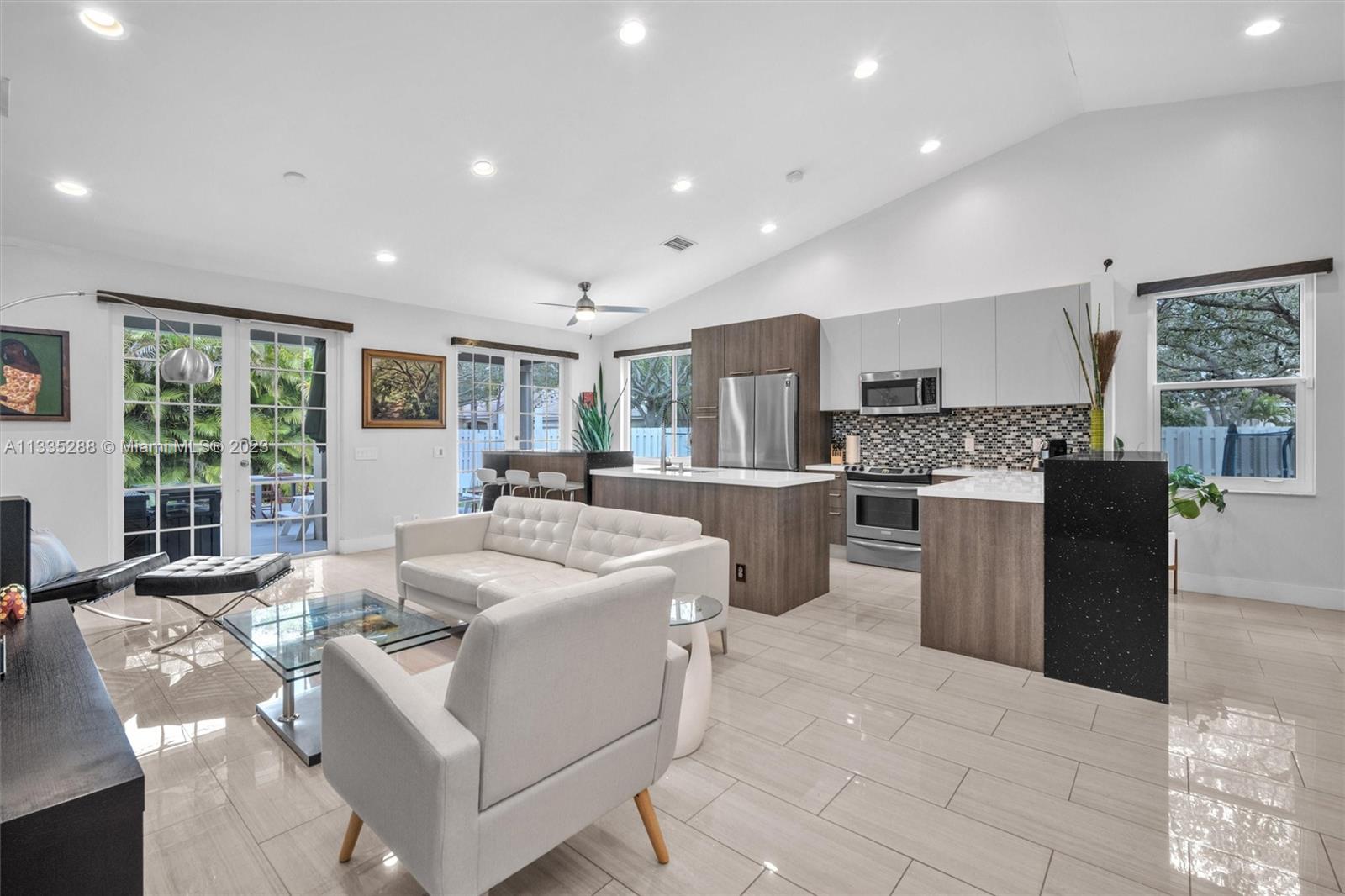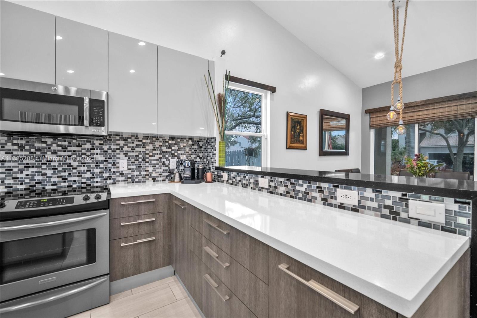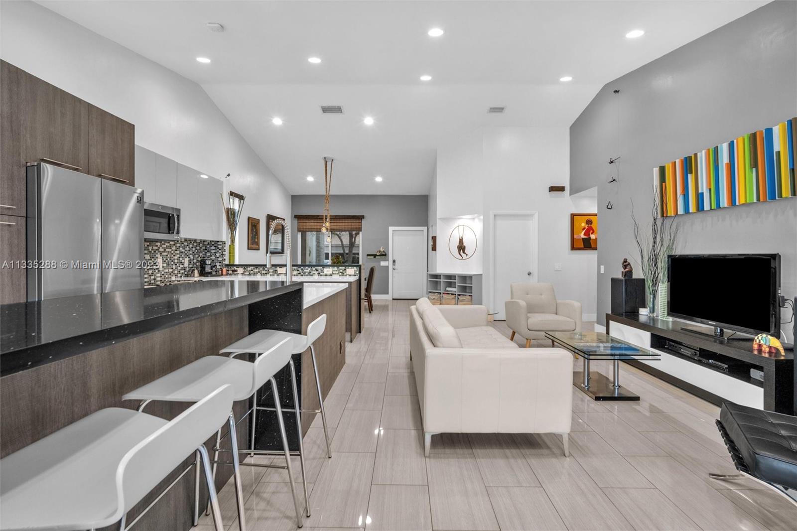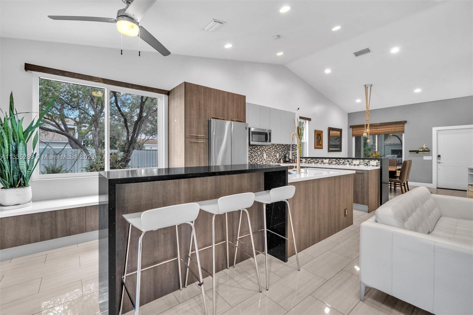 Totally renovated 3-bedrooms 2-bathroom home. ROOF & HVAC 2018. Corner lot w/ dramatic popcorn free volume ceilings, open concept Italian kitchen, designer accents including quartz waterfall edge countertops & stainless-steel appliances including new refrigerator. Tasteful porcelain floors in the main areas & the primary bedroom, laminate floors in both bedrooms. Bathrooms are updated featuring a neutral modern design. The master bathroom features a large shower with designer finishes & a dual vanity with oversized countertop space. The Falls is a 24hr surveillance-gated community, zoned for Weston's A Rated Schools. A community pool, volleyball, basketball court and tot lot complete this meticulous community. Enjoy shopping and dining all close to mayor highways for an easy commute.