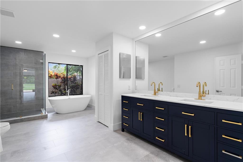 Completely renovated "Brittany" model home in the wonderful Boca Woods Country Club. New kitchen has quartz counter-tops, drawer microwave, separate oven and cook top, wine cooler, and a huge island, wide open to the spacious living and dining rooms. All bathrooms have been completely remodeled with quality fixtures and super modern design. Primary suite with views to the pool has two walk in closets and a cavernous bathroom. Second suite has a beautifully designed bath doubling as a cabana bath. Spacious garage has new epoxy floor. New AC and Diamond Brite. Country club has been totally renovated / rebuilt, with new gym, spa, locker rooms, pro shop, dining room and bar (renovation almost complete), TWO championship golf courses, 8 Har Tru tennis courts, pickle ball and bocce ball
