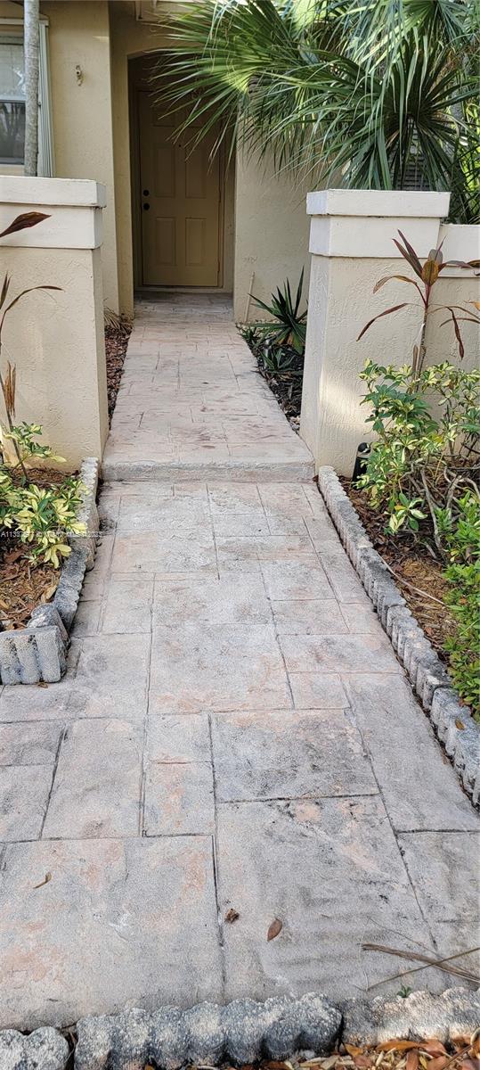 The ultimate in carefree living, inside a cozy and quiet neighborhood. This gated community enjoys a beautiful state of the art swim club, includes a heated athletic pool, family pool, kids interactive pool, jacuzzi, miniature golf, picnic/grilling area, party rooms and even a restaurant. Original Owner! Association maintained. Enjoy this secluded and private location in a relaxing patio with lots of room to roam. Lots of money spent in front landscaping and beautiful lighting with pavers in entrance walkway. 2 bedroom home, 2 bath, inviting kitchen with a convenient kitchen island. You will love the hardwood flooring throughout except the secondary bedroom. Worry free accordion shutters in every window. Brand new Air conditioning, 1 year old. High-hat lighting in main areas.