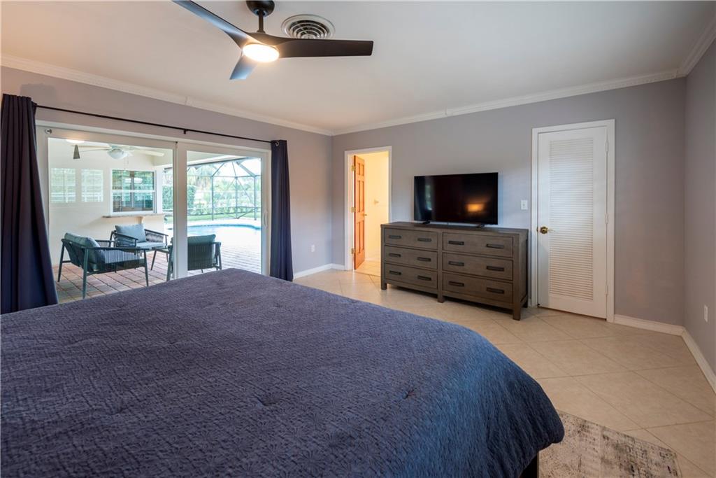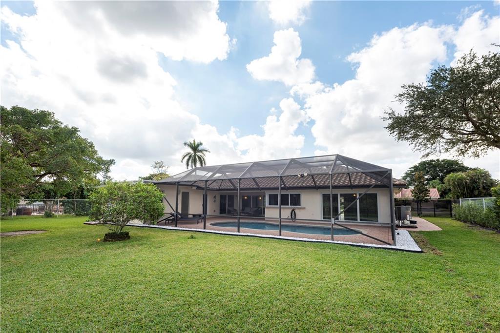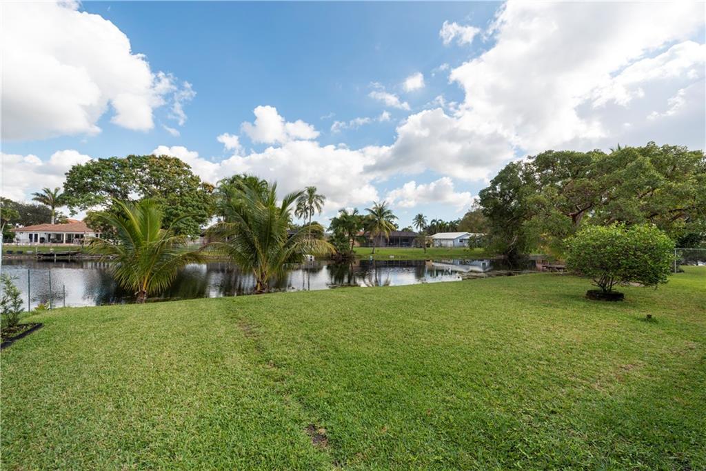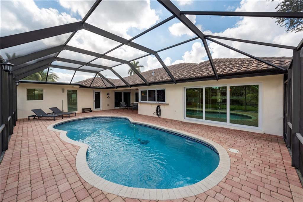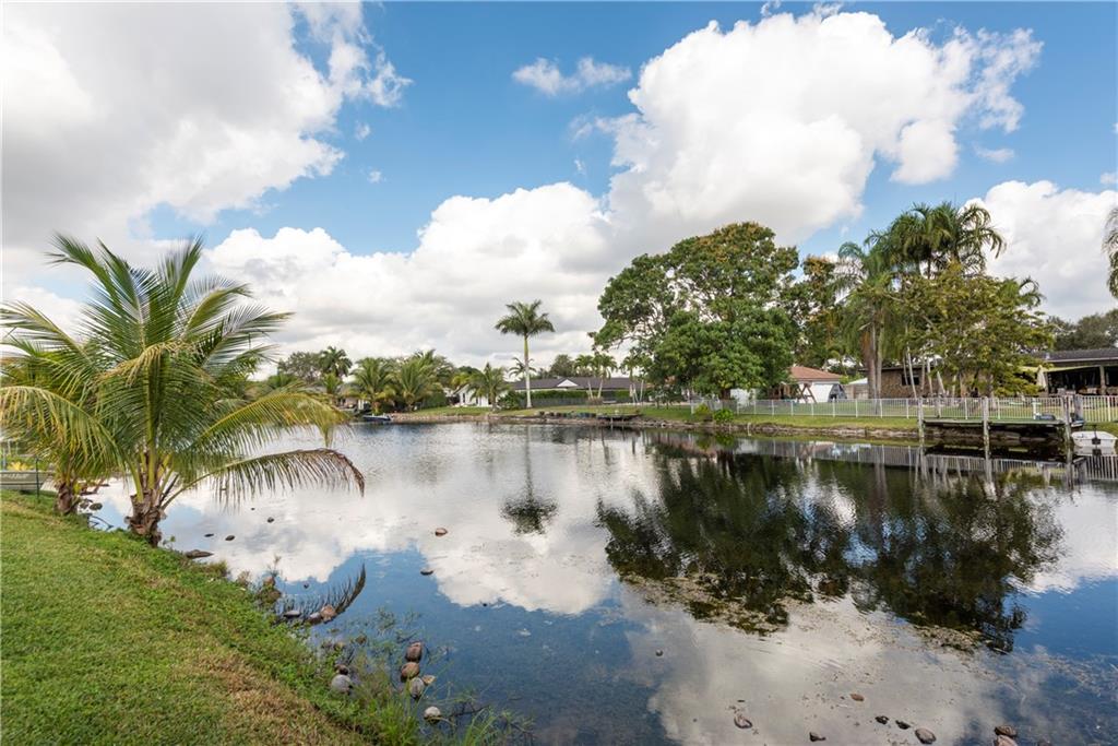 Prepare yourself for this immaculate one-story home in guard-gated Eldorado Estates. Very bright, open & airy home boasting 1/3 acre waterfront lot. Tremendous amount of beautifully landscaped front, side & back yards. Features fully screened-in patio with free form salt-chlorination heated pool & spa with exquisite water & garden views. Interior has been upgraded with full impact doors & windows, Plantation shutters, built-in closets, new ceiling fans, tankless hot water heater, & 4000 ton electronic air filtration A/C. Main bedroom with walk-in closet, bathroom with dual sinks, separate shower & Roman Tub. Other bedrooms have wood floors & home has neutral porcelain tile throughout. Spotless garage with a 240V for electric vehicles plus HUSKY metal cabinets & 6 ft work table. Must see!