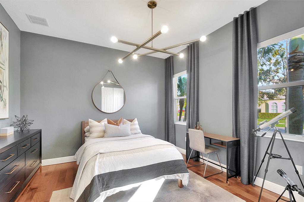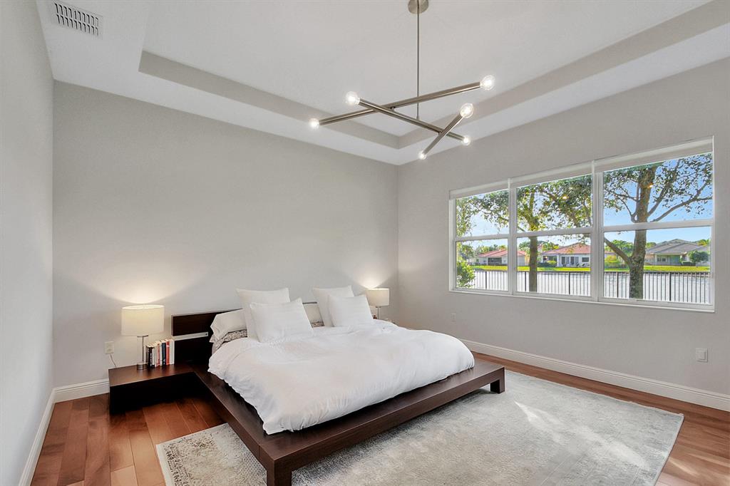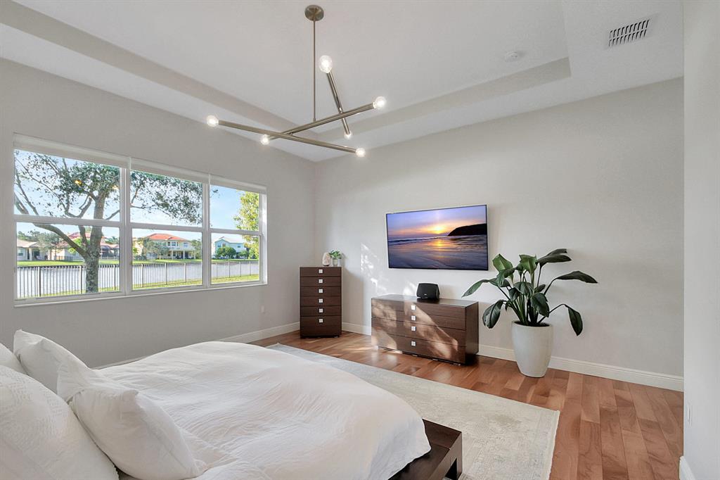 Decorator's masterpiece & elegance defines this home. 2 Master Suites! 4/4/2 + Den + 16x18 Covered Patio. Waterfront on 1/4 Acre Fenced LOT. Professionally designed & appointed. 12-10 Ft ceilings, custom Drapes, European cabinets w/pull-out drawers, luxury light fixtures(exclude dining rm chandelier), customized walk-in closets. Hide-away Home-Office in the DEN. 7 Chan blt-in KLIPSCH HTheater + THX & Marantz Receiver. Wrap-around Quartz counters & full backsplash, double oven, double wide extra deep refrigerator, Wine Fridge, Nest thermostat, built-in Pest control system thru-out, Wood Flrs in Bdrms, tile elsewhere. Tons of natural light. We are close to Downtown West Palm, PBIAirport, ALL shopping & restaurants, 2 major Hospitals, the Beach, 300 Acres park,Tpk & I95. Low HOA as well.