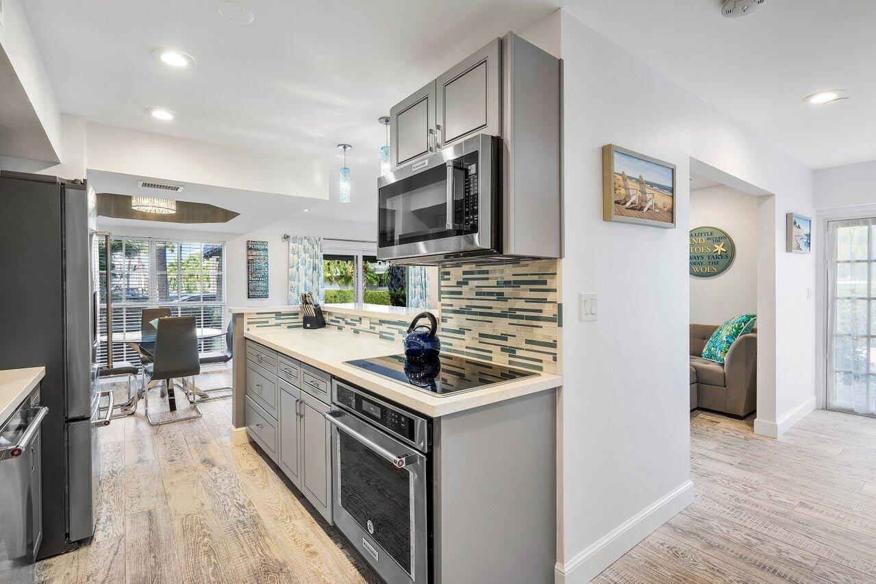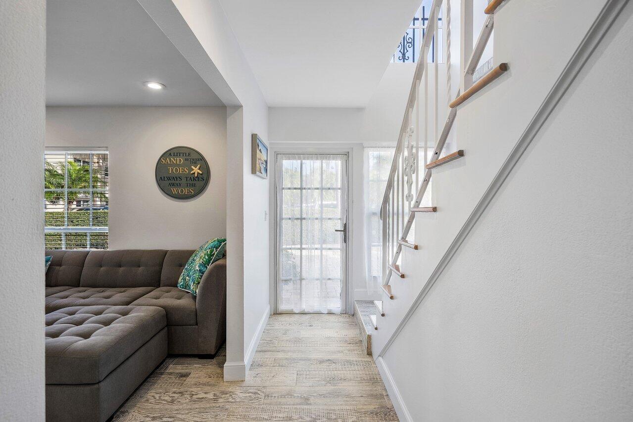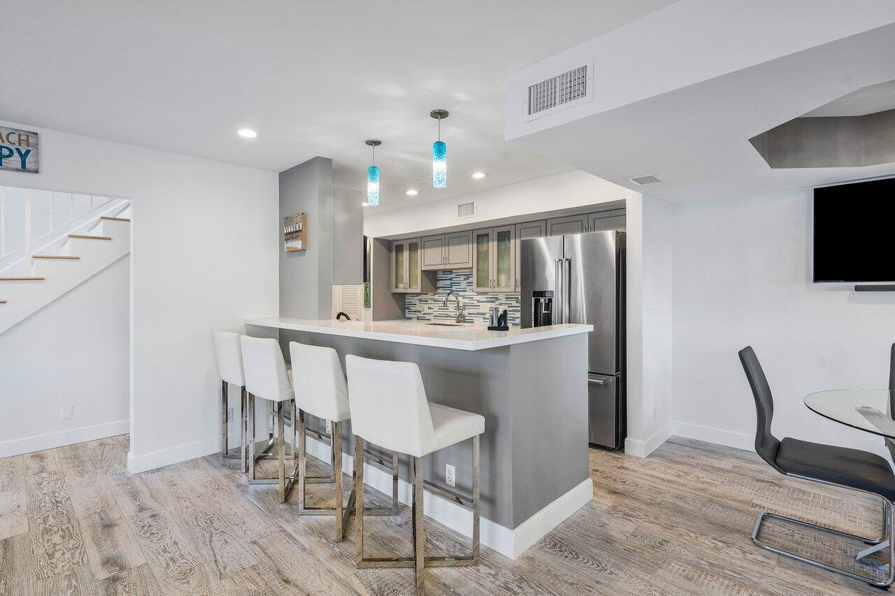 Beautiful townhome across from the Beach! This gorgeous townhome is located on the prestigious Hillsboro Mile & boasts a corner view with lots of natural light. This home is available furnished with new furniture that is decorated to compliment the home. The open kitchen floorplan has new cabinets, counter tops, & appliances. Enjoy breakfast at the kitchens island! Impact sliders open off of living room to the spacious Tiled patio. Up the wood stairway holds 3 large bedrooms. All 3 bathrooms have been tastefully upgraded. The master bathroom has a large stand in dual shower head shower & free-standing soak tub. Master also has private balcony to enjoy sunsets. This home has gorgeous wood like tile floor downstairs & Mohawk plush carpet upstairs. Fully Renovated, Impact Windows,