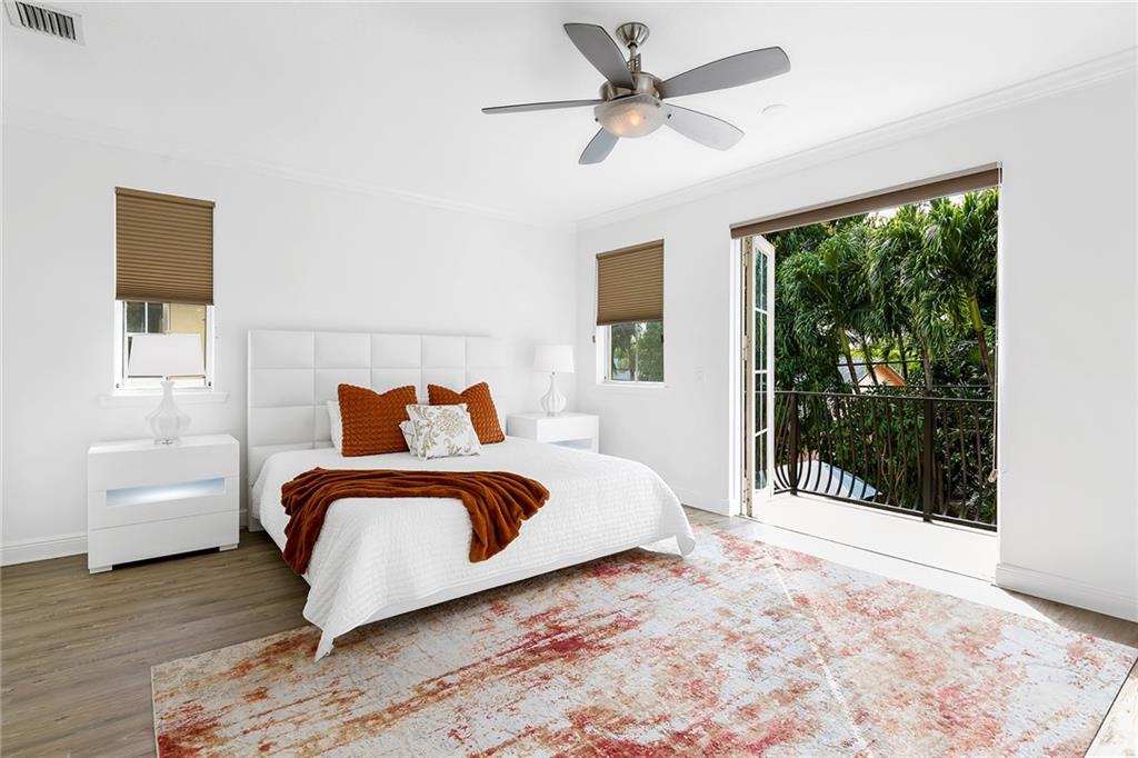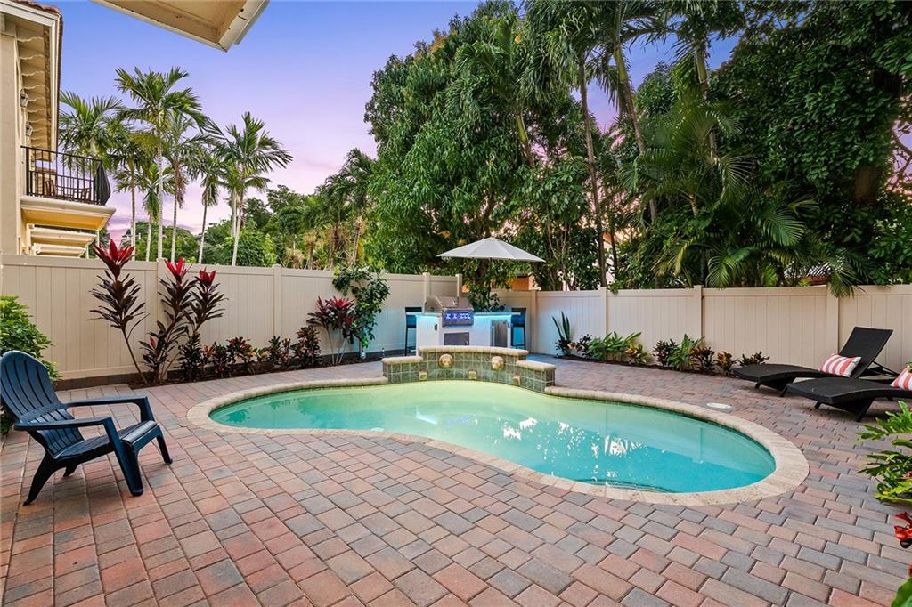 Corner Townhome, updated & inspired by contemporary design. Ideal for today's lifestyle w/a spacious & luminous open flr plan, enhanced by vol. ceilings & modern accents. The open kitchen w/tremendous counter space & snack bar overlooks the dining area, custom bar & great rm. French doors open to the oversized tropical backyard, a lrg. free form pool, patio, & custom BBQ equipped w/an entertaining area for dining, lighting & bluetooth sound system. The spacious primary suite provides the ultimate retreat w/an open balcony overlooking the pool & patio area, 2 custom walk-in closets & spa inspired bathrm w/a Jacuzzi & large walk-in shower. The Jr. Primary suite has 2 open balconies & the 3r br. is currently used as an office. Mins to shopping, restaurants, parks & the beach. Sq ft from BCPA