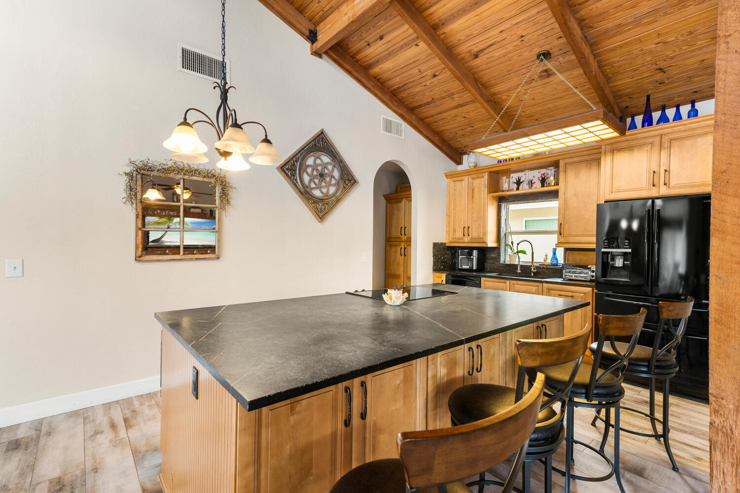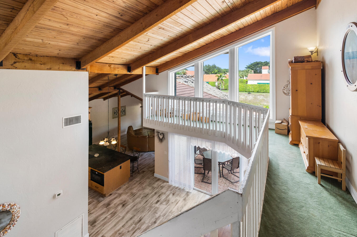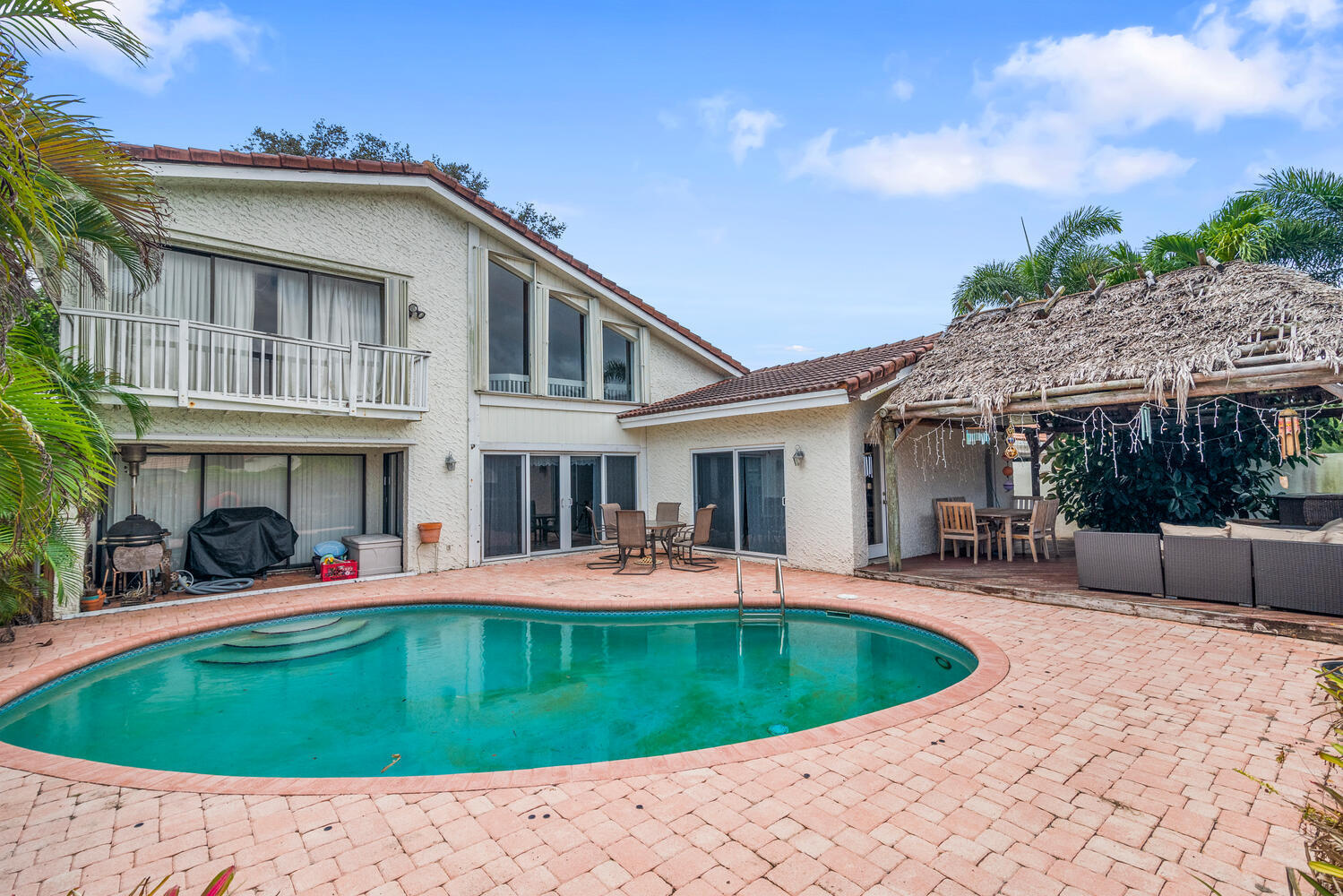 Spacious 2 story, 4 bedroom, 2 bathroom, + large loft , waterfront, pool, home on canal in desirable Amberwoods. Features include an open floor plan with separate living and family rooms, soaring exposed wood beam ceilings, custom kitchen with island, wood cabinets, and walk in pantry. The primary suite is upstairs with walk in closet and tub in bath along with large loft and wrap around interior walk way. 3 bedrooms downstairs. Finished, air conditioned garage with hurricane rated garage door and automatic opener. Accordion hurricane shutters throughout with impact windows and doors in living areas. Ideally located in an A rated school district.