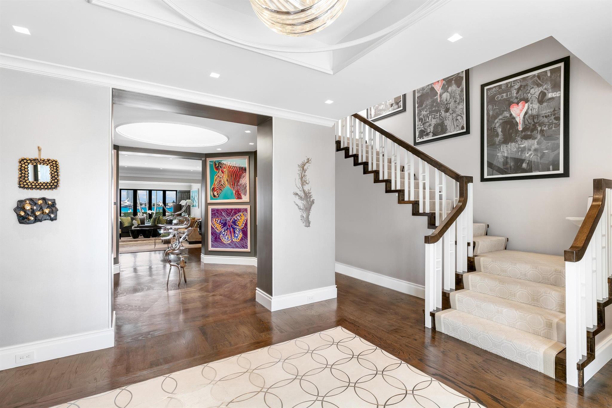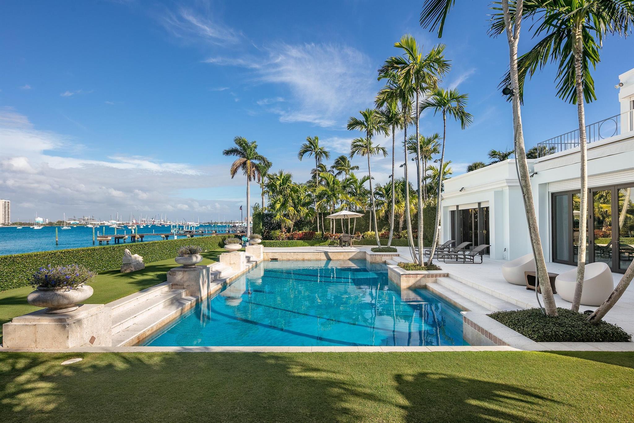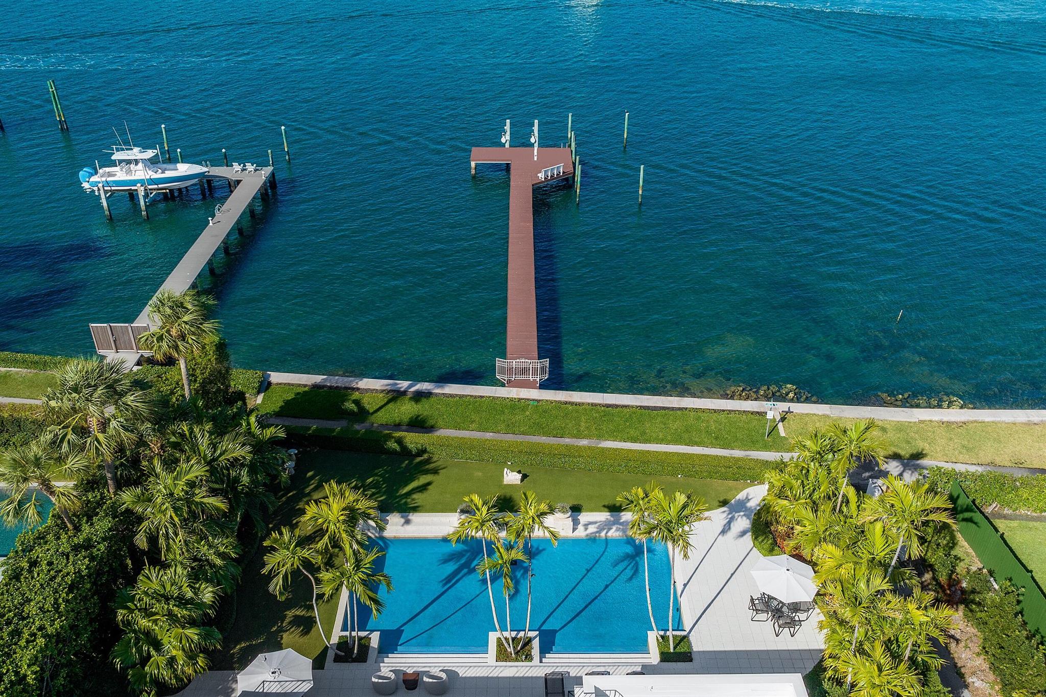 Stunning Contemporary Regency with dramatic views of the Intracoastal waterway and the motor yachts at Rybovich Marina. Excellent open floor plan perfect for indoor and outdoor entertaining. Features gracious living room, formal dining room, sunny and bright interior loggia. Family room with entertaining bar and office with beautiful views of the lake. Elevator leads to expansive second floor primary suite with sprawling, oversized terrace and dual baths. Additional highlights include chef's kitchen, staff bedrooms, and 2-car garage. Beautiful outdoor spaces with pool, Intracoastal dock, and access to the Lake Trail.