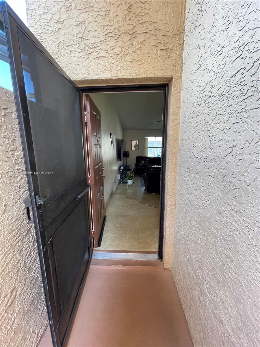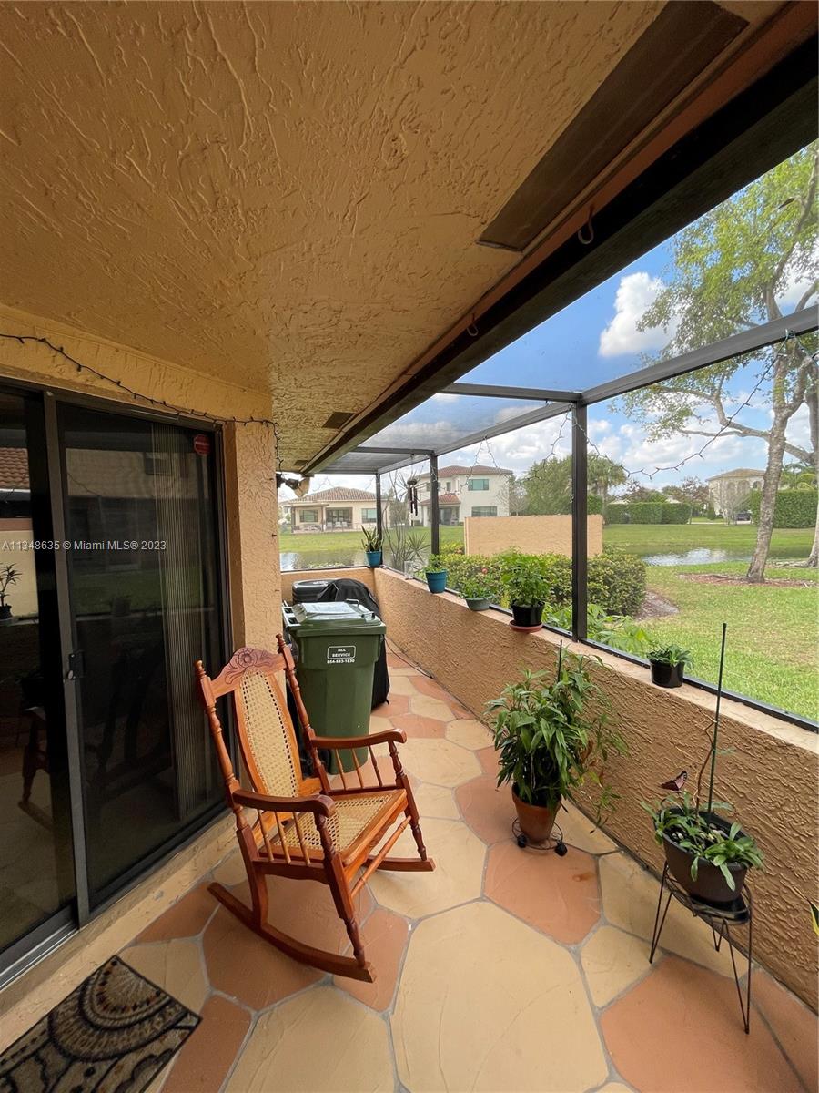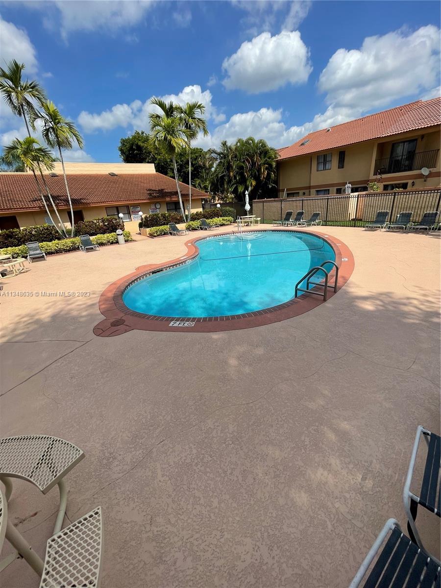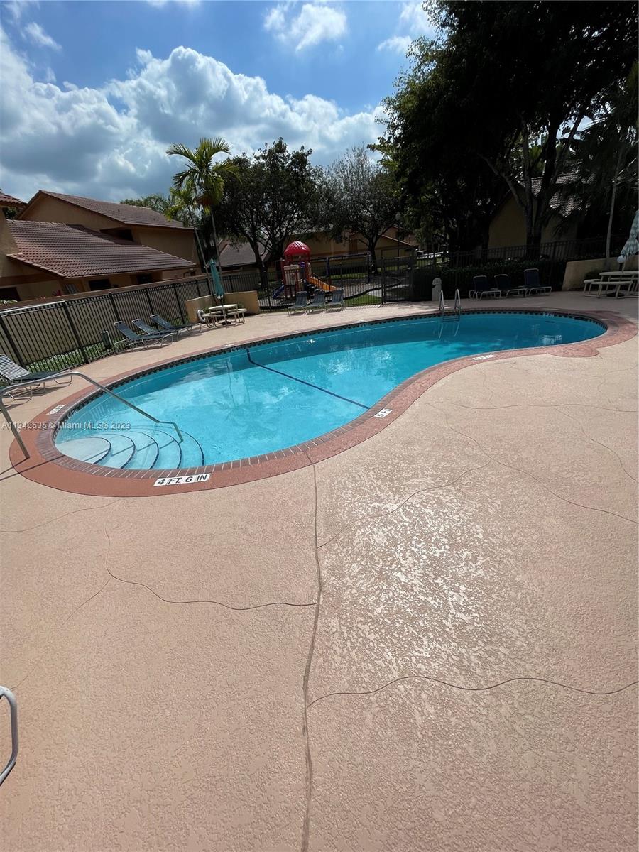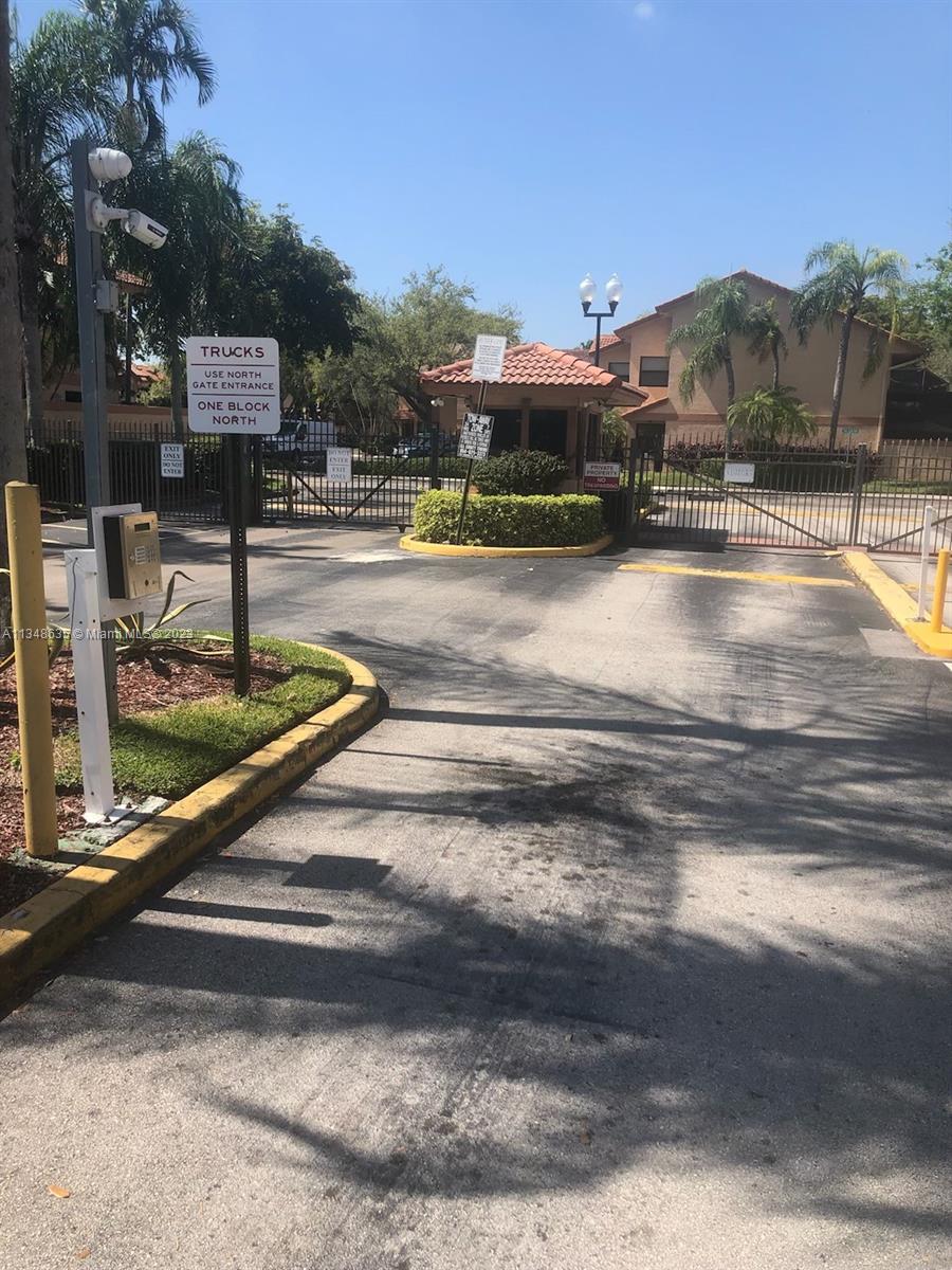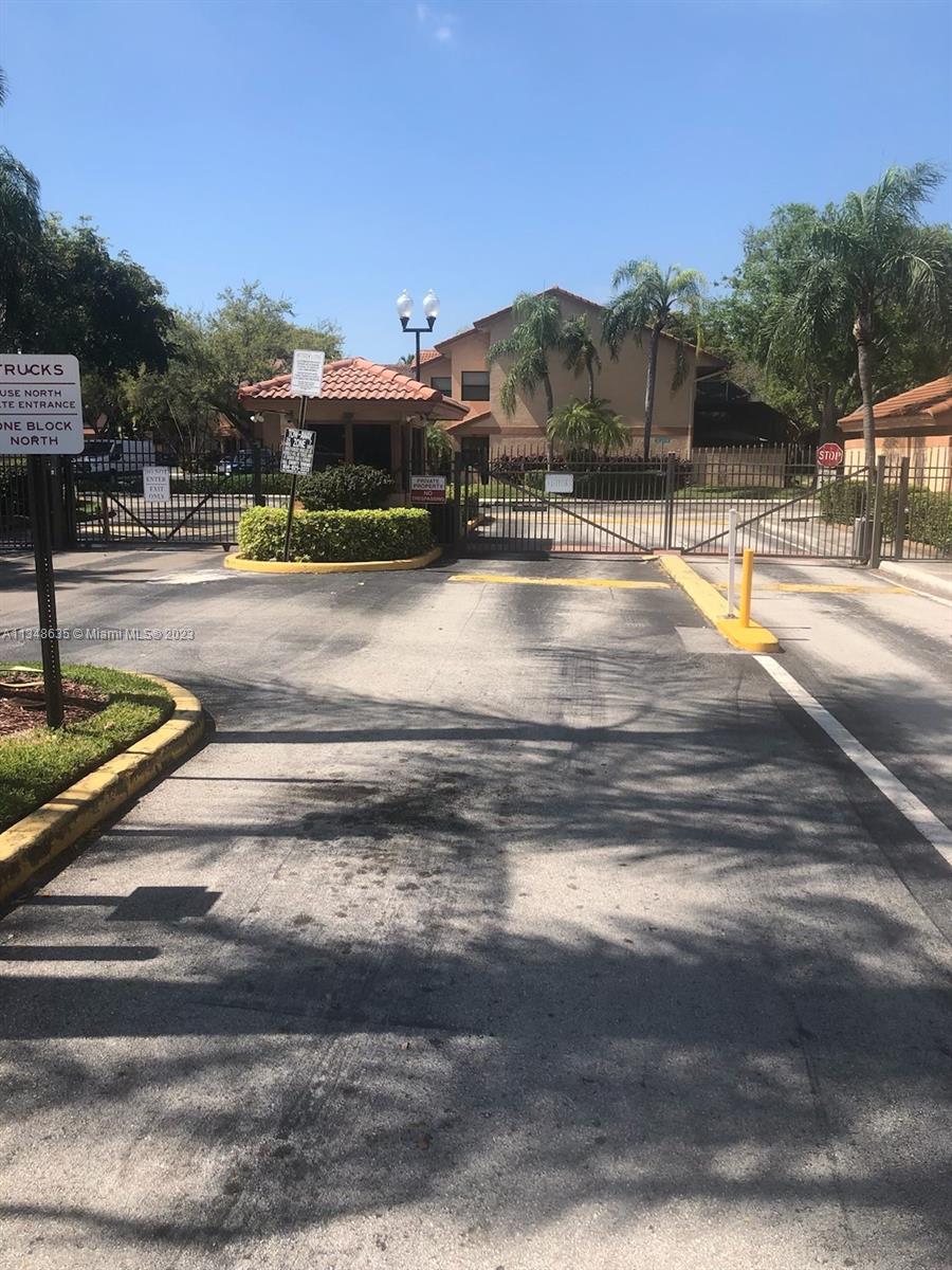 Excellent and beautiful one-story town home in strategic location a few miles from shopping, restaurants and main roads. This corner unit features two bedrooms, two baths, two assigned parking spaces, vaulted ceilings, brown wood cabinets, Laminate countertop, stainless steel appliances, marble floors and walls in bathrooms, hurricane shutters, enclosed patio with a beautiful view. This gated community features a community pool, clubhouse and playground great for family entertainment. The best part is the low HOA fee of $168 per month.