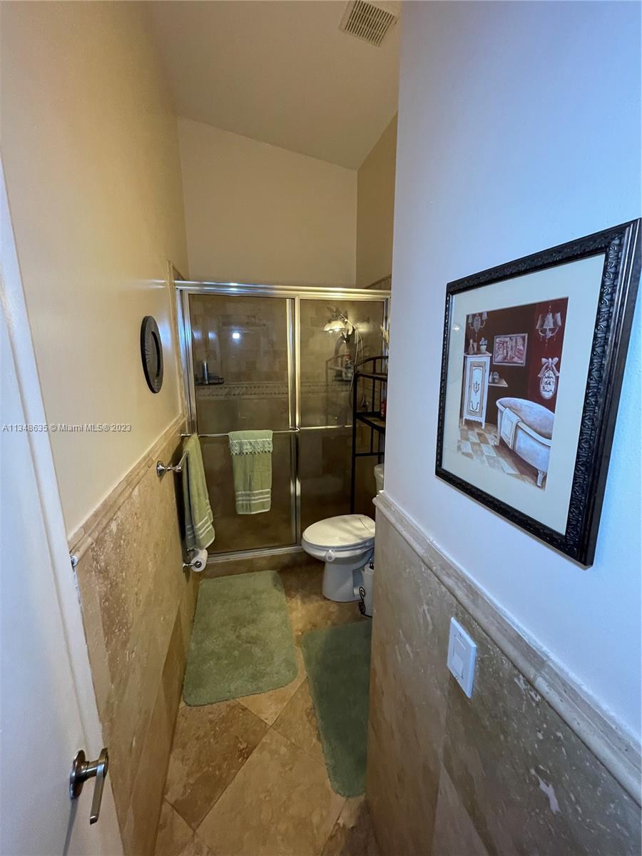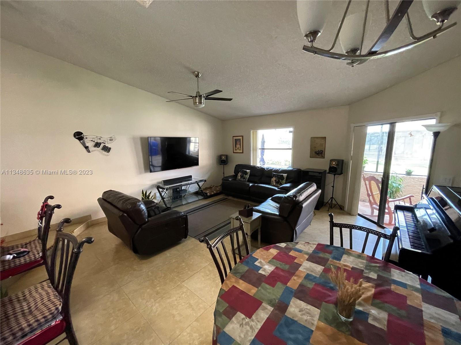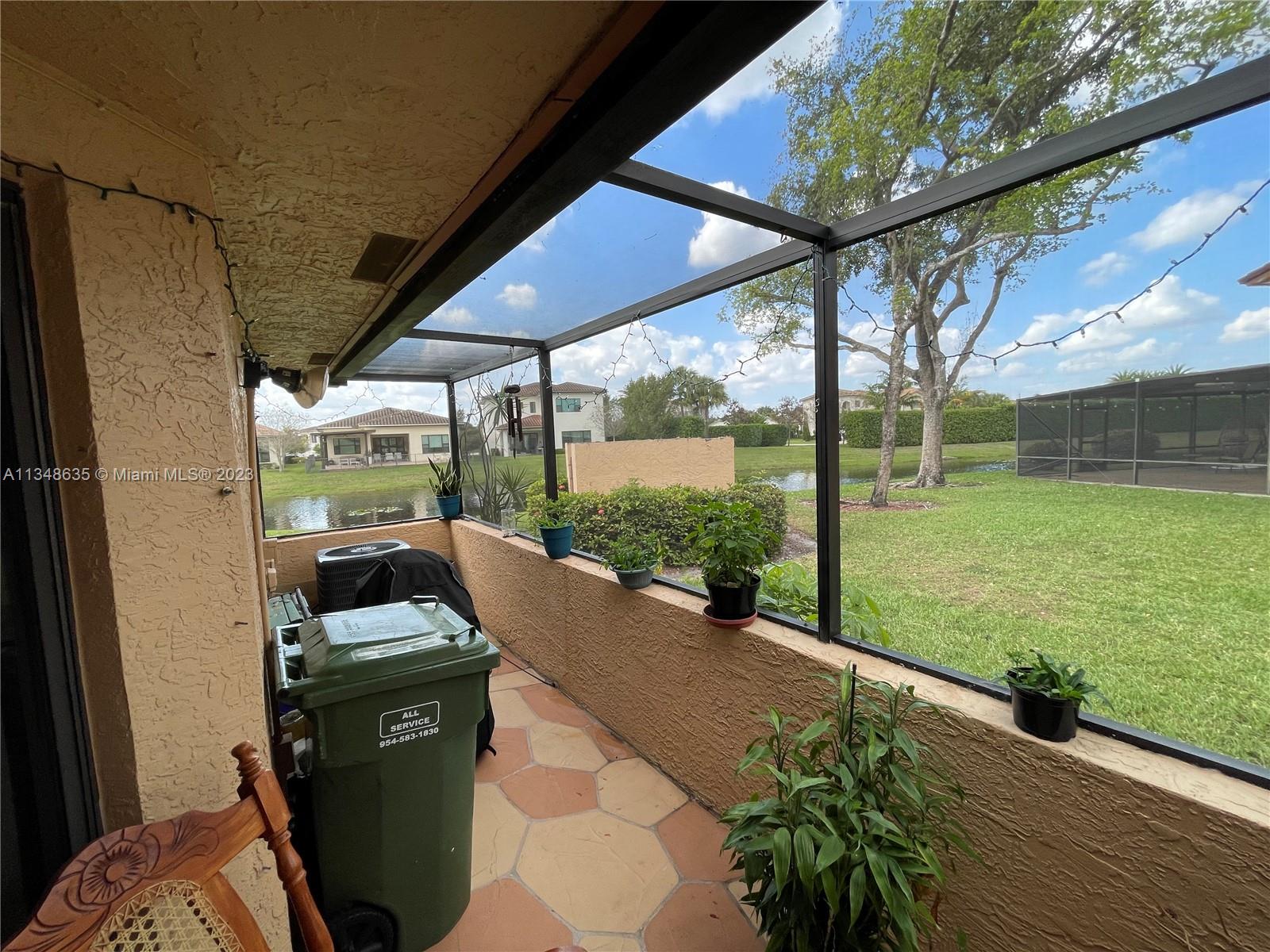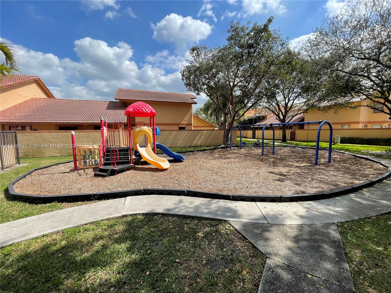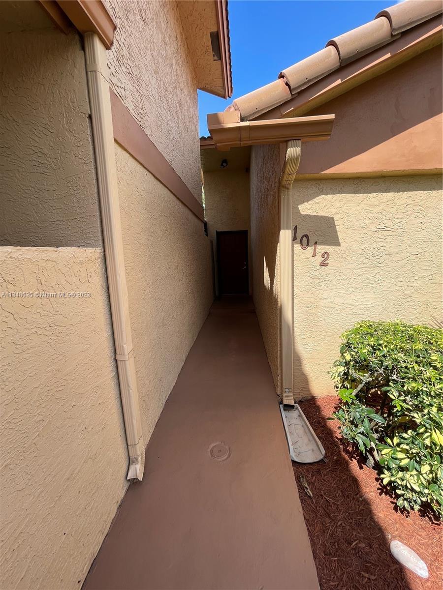 Excellent and beautiful one-story town home in strategic location a few miles from shopping, restaurants and main roads. This corner unit features two bedrooms, two baths, two assigned parking spaces, vaulted ceilings, brown wood cabinets, Laminate countertop, stainless steel appliances, marble floors and walls in bathrooms, hurricane shutters, enclosed patio with a beautiful view. This gated community features a community pool, clubhouse and playground great for family entertainment. The best part is the low HOA fee of $168 per month.