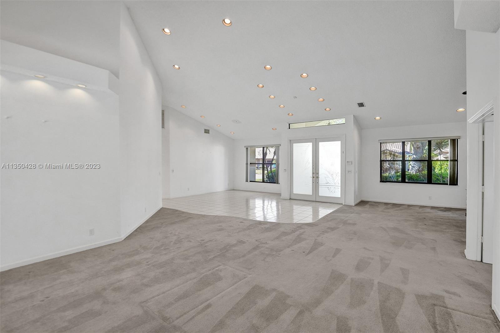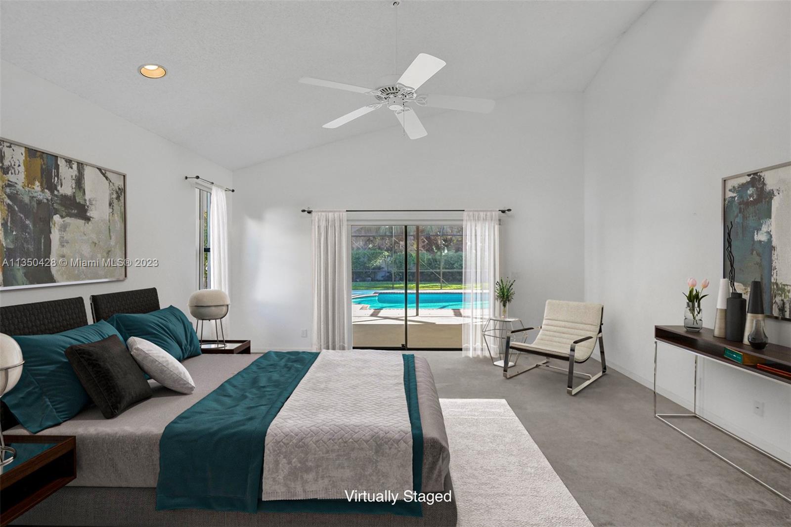 Prestigious CARRIAGE POINTE ESTATE home with 4 bedrooms & 2 bathrooms w/ lovely screened in patio and pool in 24 HOUR GUARD GATED COMMUNITY. Expansive primary suite w/ 2 closets. This already spacious home feels even larger with its vaulted ceilings. Sits on a cul de sac with minimal car activity. Kitchen has solid wood cabinets and granite counter tops w/ tranquil view of pool and backyard. Across from the kitchen is a flex room for family, kids playroom, etc. Both bathrooms have dual sinks. Large windows let in tons of natural light. METAL ROOF that looks like clay tile. AC is 2021. Brand NEW CARPET in 3 rooms. Enjoy pure backyard privacy as the lot backs to Sandy Ridge Preserve. This home was well cared for and clean as a whistle and ready for you to make it your own.