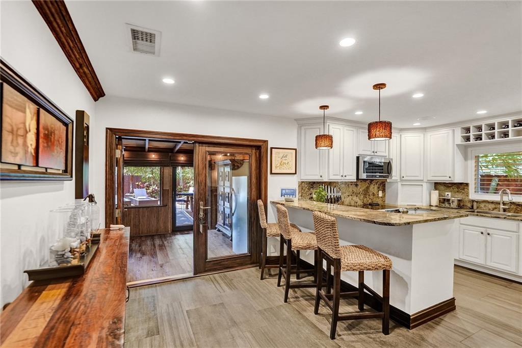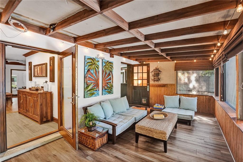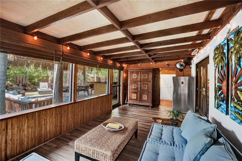 This gorgeous & meticulously maintained home in highly desirable Shady Banks neighborhood is surrounded by a tropical paradise & mature oak trees. Custom Kitchen, Granite Counters w/ Breakfast Bar, Updated bathroom features a rain shower & handheld shower, copper sink, imported shell stone tile & countertop w/ teak vanity. Solid oak doors w/ antique hardware reclaimed vintage hardwood floors, plantation shutters, “smart light switches/outlets”, walk-in closets, interior & garden sound system, impact windows. Exterior w/ desirable living space for entertaining, large tiki hut, full size bar w/ ice machine & 2 fridges, ceiling fans & sink, large composite deck w/oversized hot tub. Minutes to Downtown Las Olas, the Beach, 2 Parks w/Tennis Volleyball Fitness Equip& Riverfront Nature Preserve
