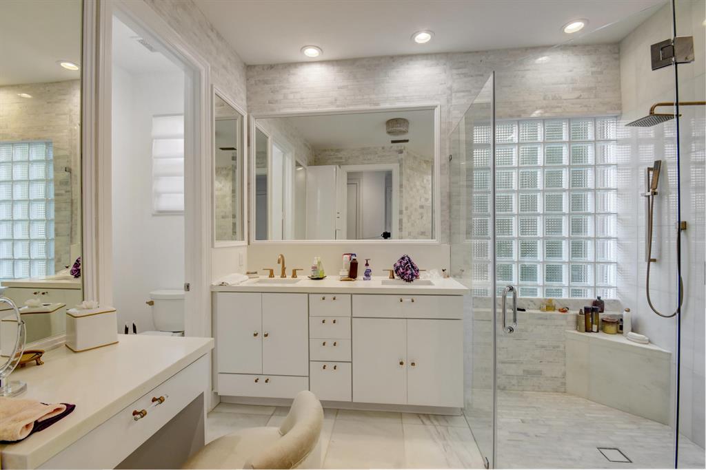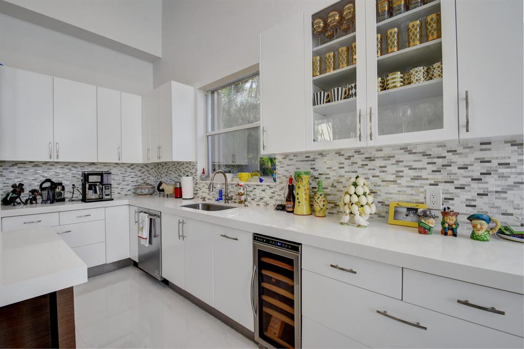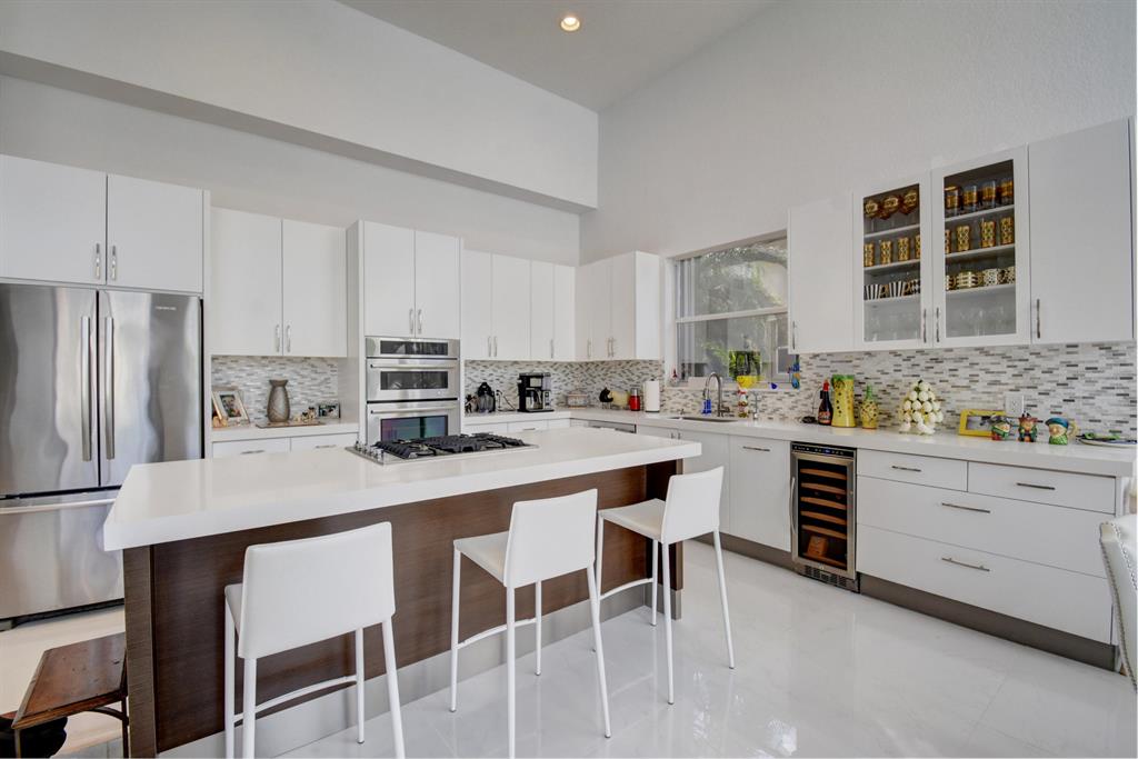 JUST REDUCED! Move right in & enjoy lake vistas the moment you enter this remodeled 2-story home of 6 bedrooms & 6 baths + loft featuring contemporary finishes-volume ceilings; white porcelain tile of carrera marble design & dark wood floors;an open gourmet island kitchen with white 42'' cabinets,white quartz counters,backsplash of glass,tile & metal,high-end stainless steel appliances,wine cooler & a charming breakfast nook;a lovely bedroom/office with built-in desk & closetry;beautifully upgraded contemporary master & secondary bathrooms throughout & so many more interior details.The backyard overlooks the lake offering a covered patio & an open area with a freeform pool that has been resurfaced & tiled. A combination of accordion shutters & impact glass provide hurricane protection.