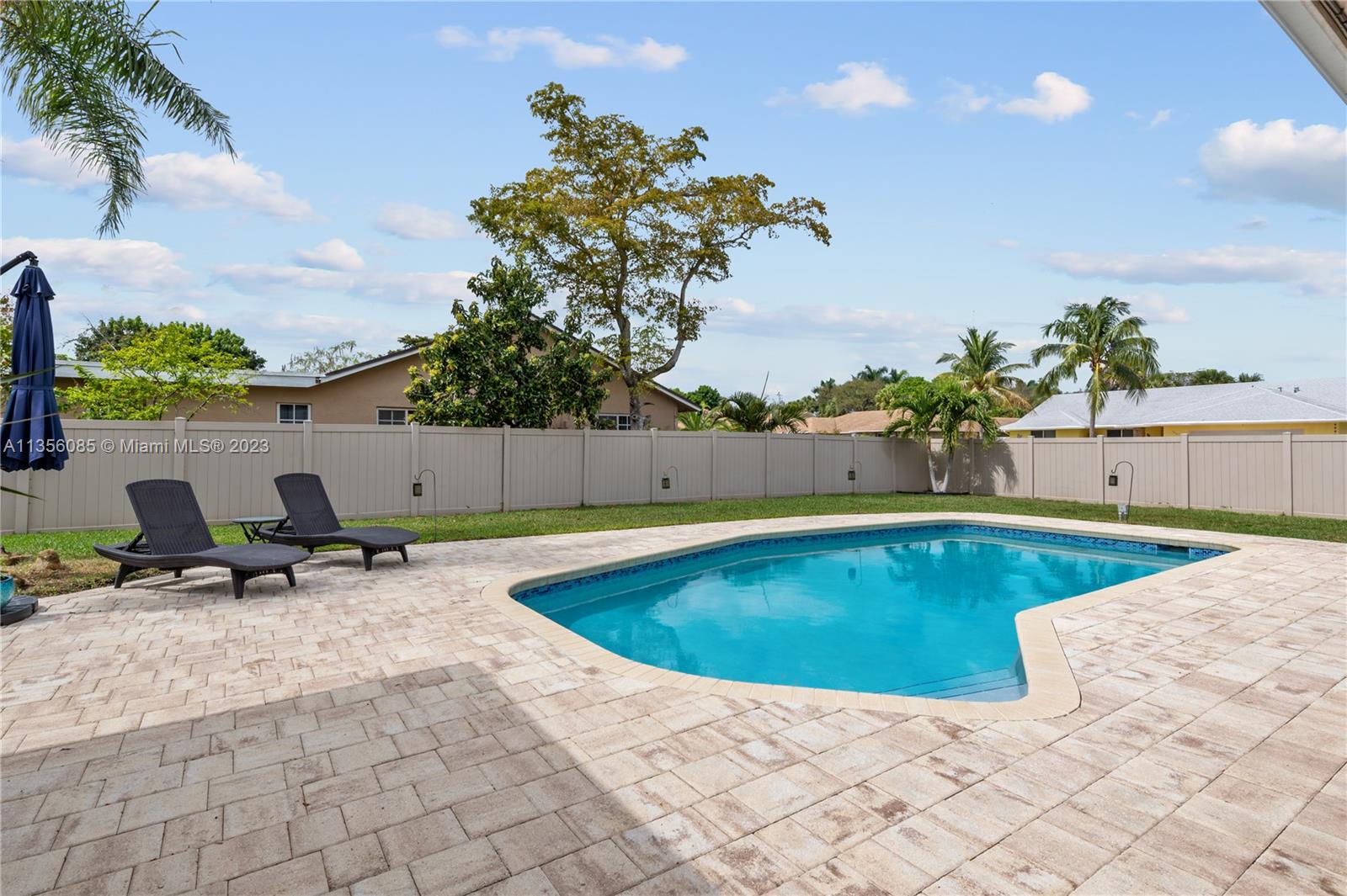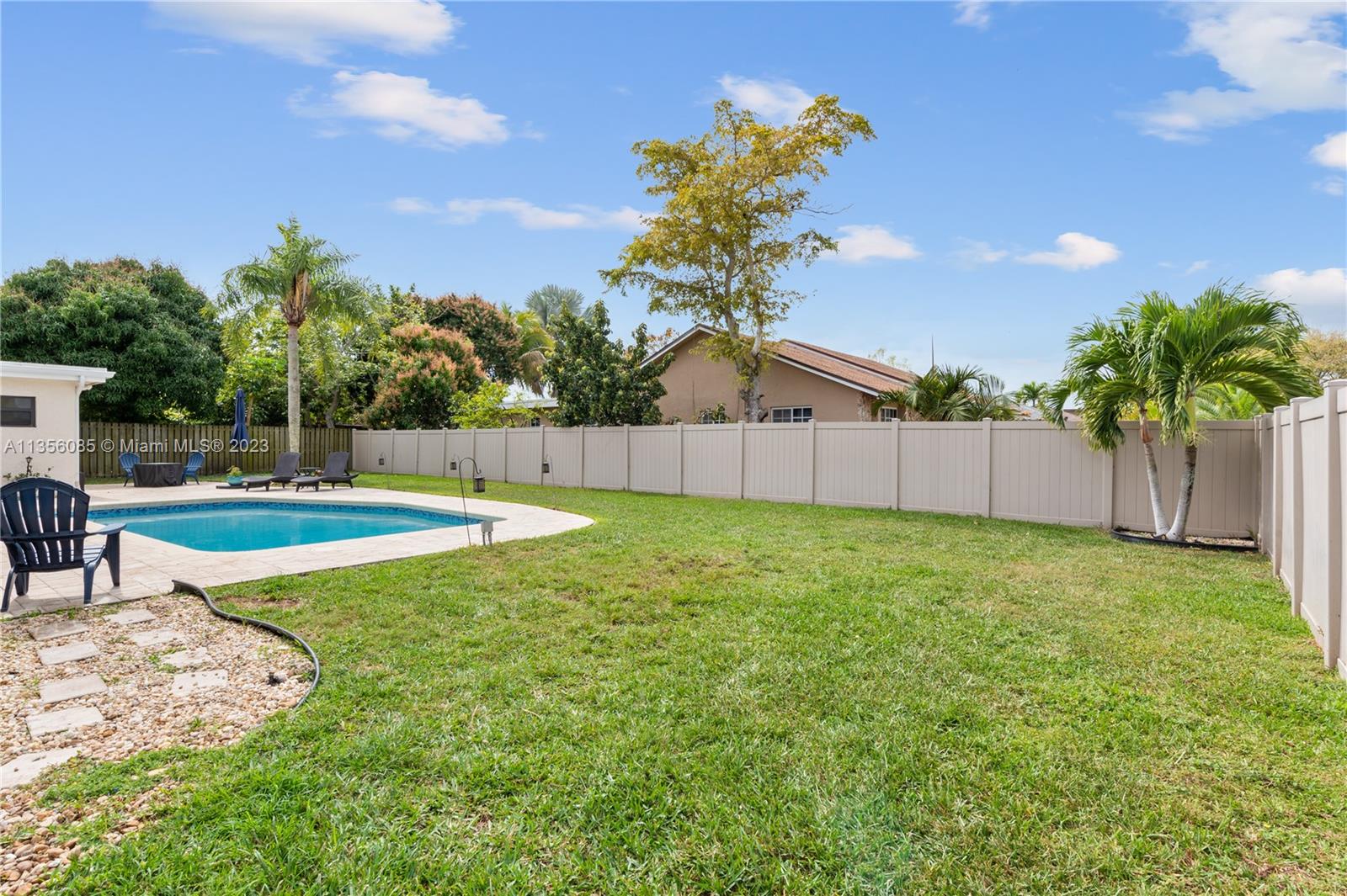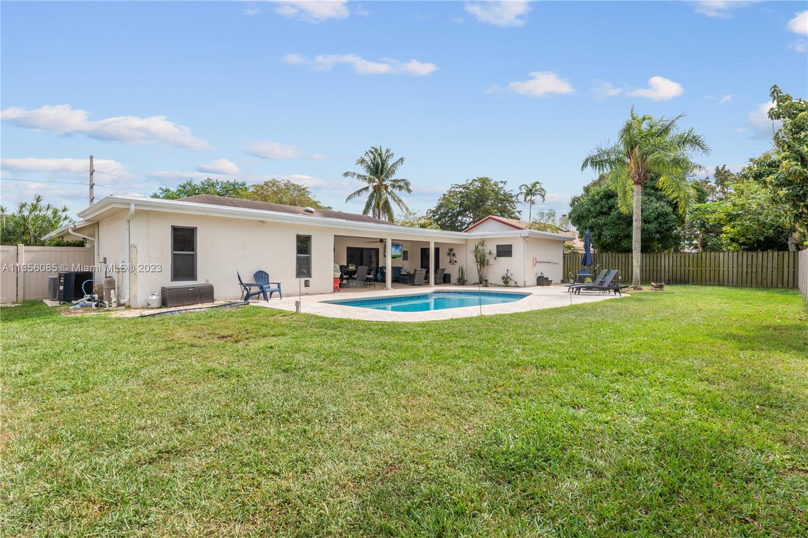 Nestled on over a ¼ acre lot in Marcano Estates, this beautiful home is situated on a private, corner lot and features 4 bedrooms, 2 ½ bathrooms (1 of which is a Cabana Bath), 2-car garage, pool, new impact windows and sliders, formal living & dining, tile floor throughout main living areas & wood laminate flooring in the bedrooms. The spacious kitchen features wood cabinetry, tile backsplash, stainless steel appliances and opens to the Family Room. The Primary bedroom features 2 walk-in closets, sliding door access to the covered patio area & ensuite w/ dual vanities & shower. Additional features include a laundry room, plantation shutters, spacious covered patio area overlooking the pool & yard, 2 driveways w/ ample room for a boat/RV, and a 6ft privacy-fenced back yard and no HOA.