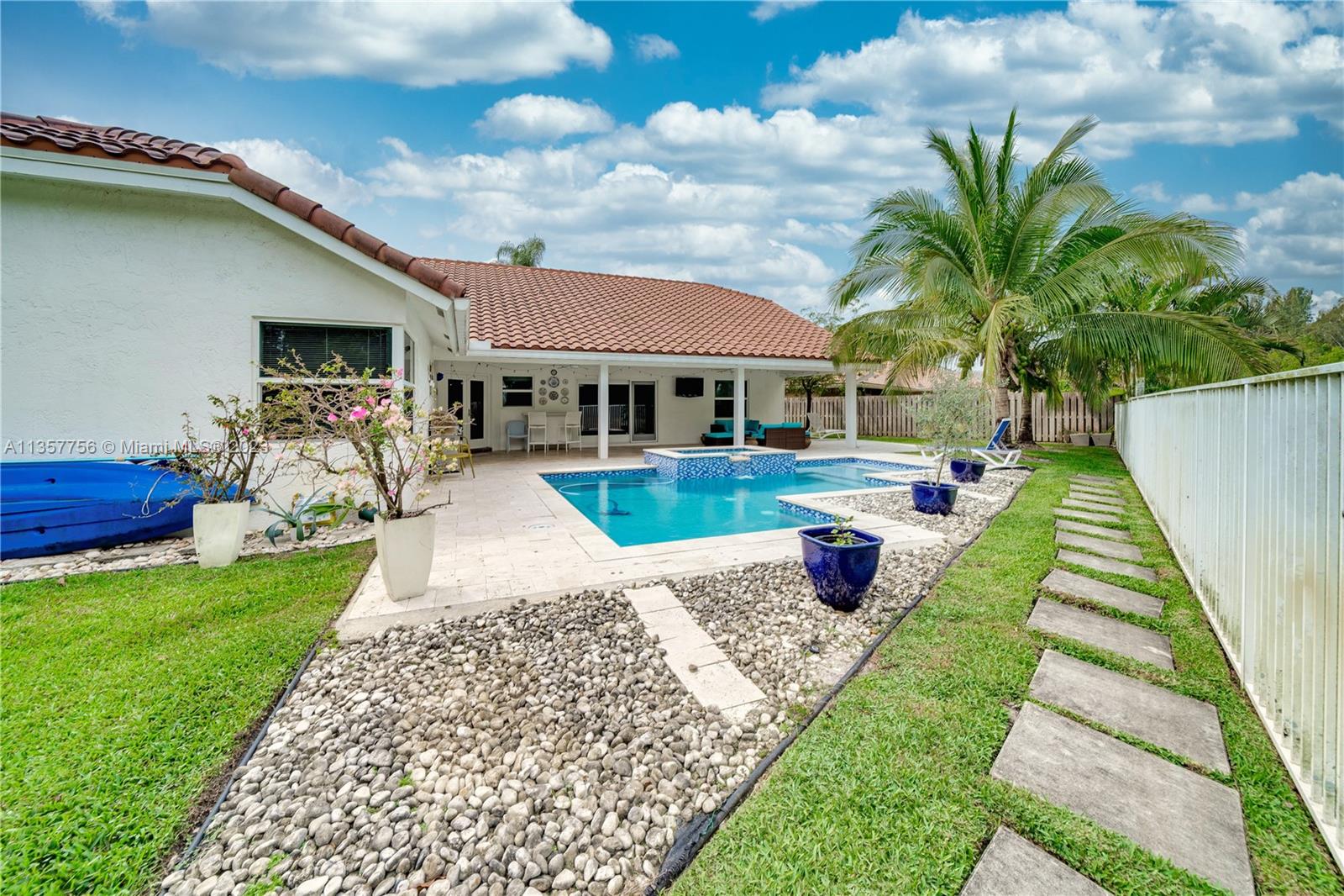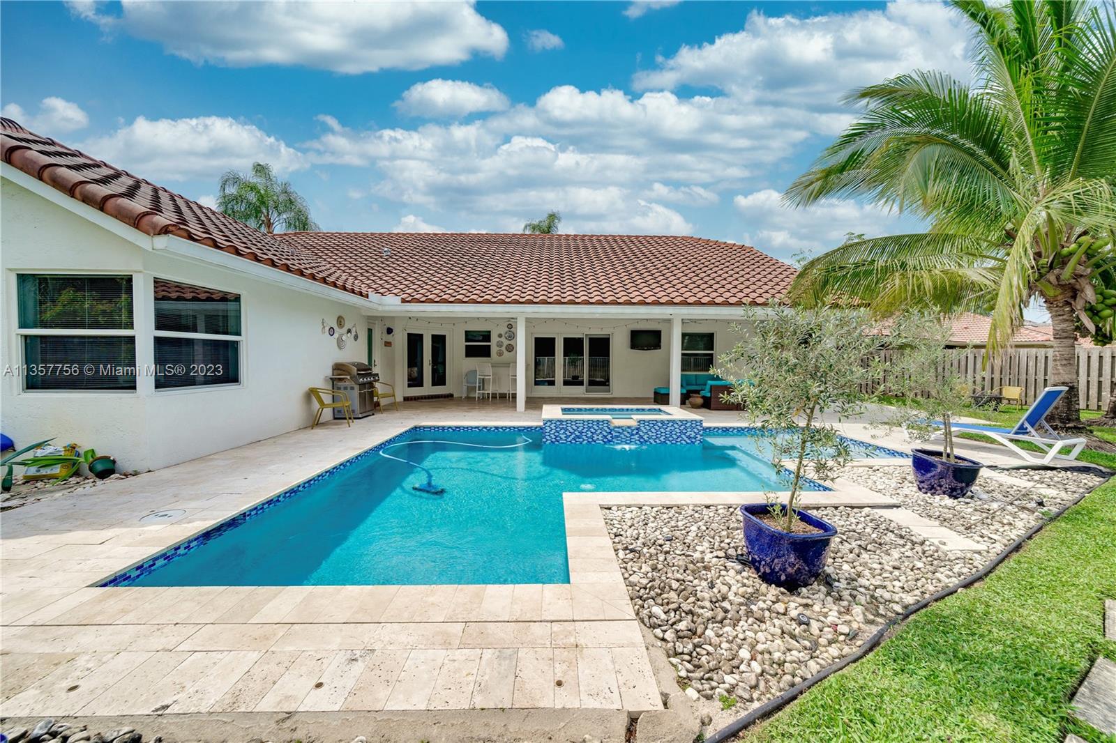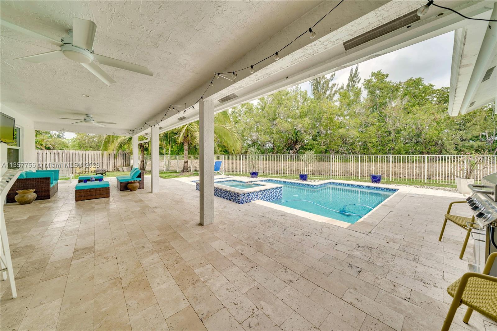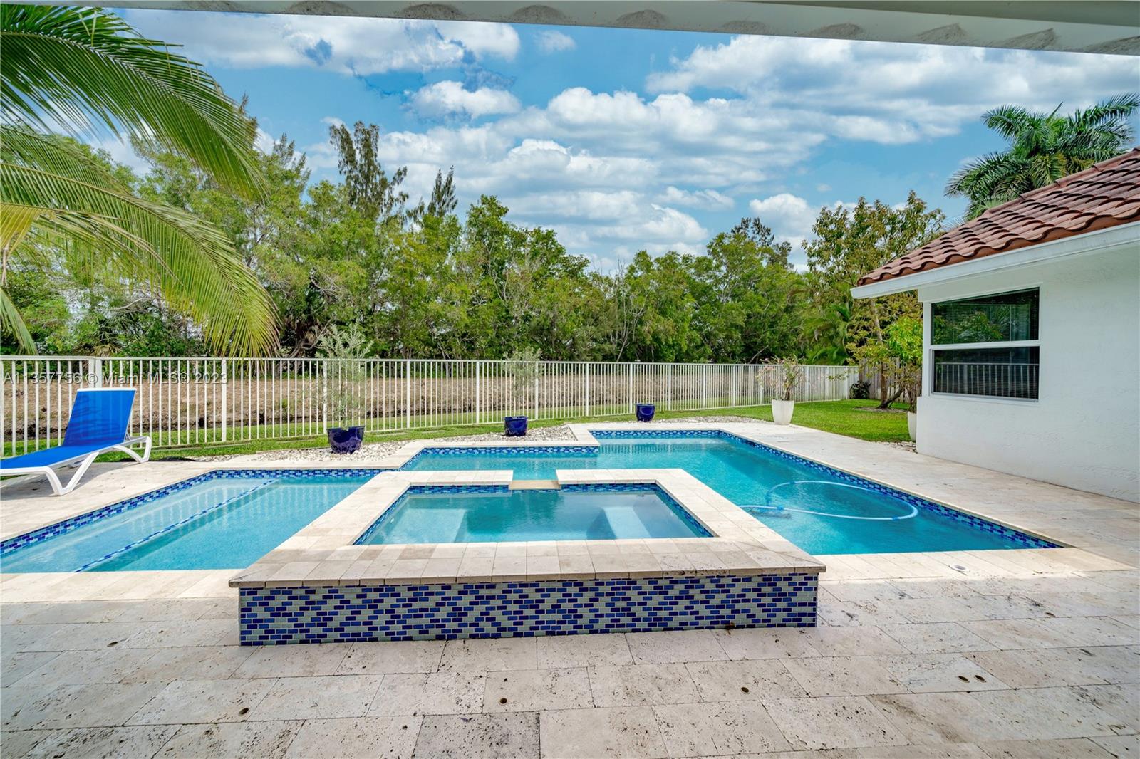 Immaculate, 4 BR, 2.5 BA, 2310 sq ft ranch home in highly sought after Fox Run at Jacaranda in established Plantation, FL, located on water, rear of community, privacy and serenity, complete modern renovation, split bedroom, open floor plan w/volume ceilings, impact windows, spacious kitchen/great room w/upgraded appliances, built in bar, quartz countertops, extended island; custom wood cabinetry, closets, and doors; upgraded ceiling fans and LED lighting, master bedroom en suite w/soaking tub, walk in laundry room w/sink, 2 car garage, covered outdoor living space to entertain, custom pool built 2019 w/lounging pad, waterfall, bench swim-out, LED lighting, travertine deck, avocado and tamarind trees, lush coconut palms, close to local parks, shopping, dining, sports and So FL lifestyle.