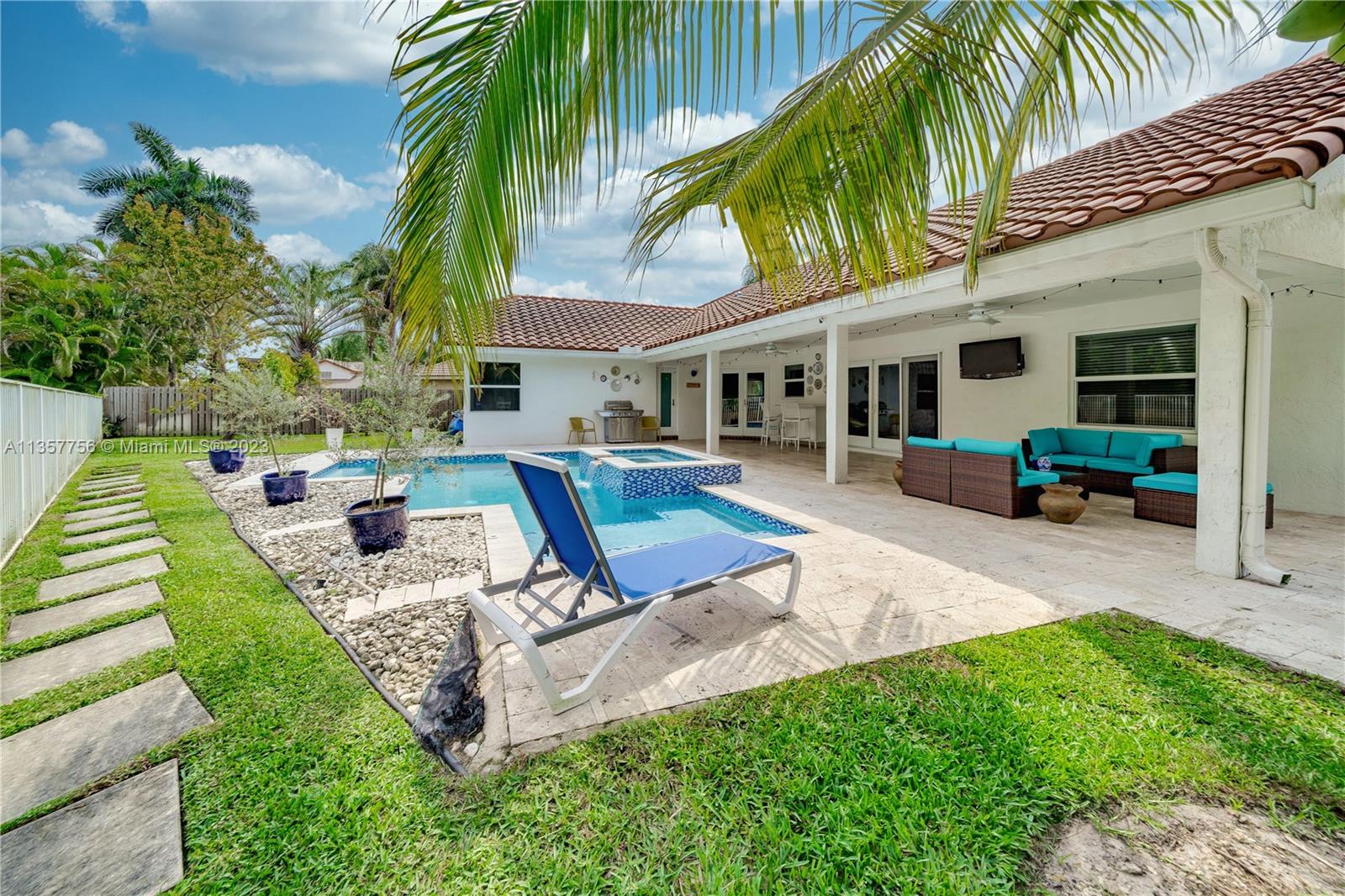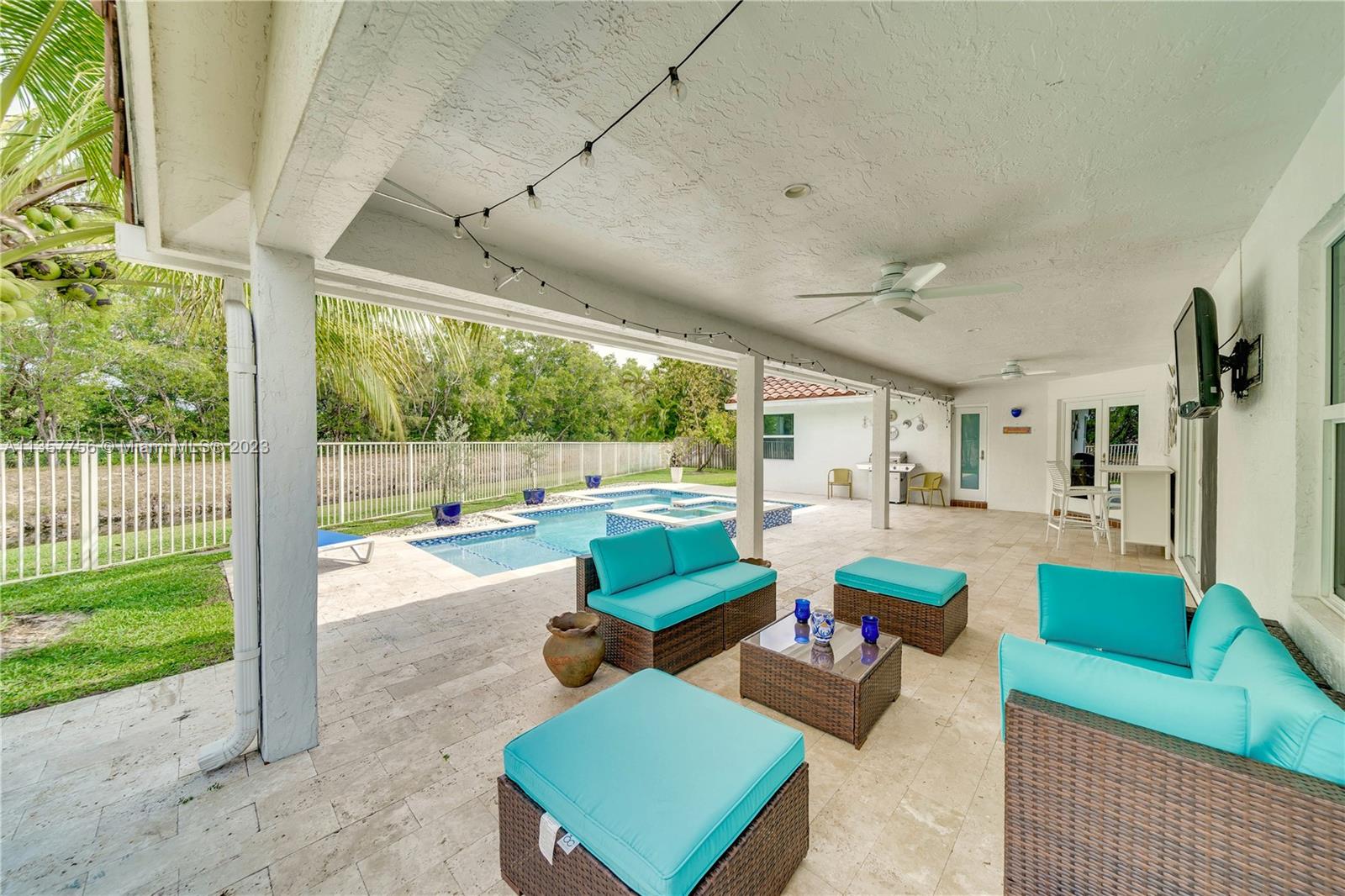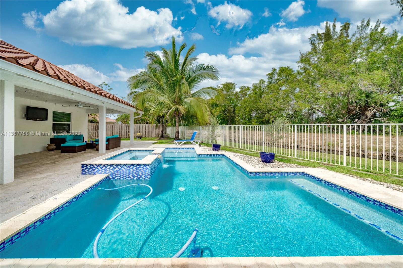 Immaculate, 4 BR, 2.5 BA, 2310 sq ft ranch home in highly sought after Fox Run at Jacaranda in established Plantation, FL, located on water, rear of community, privacy and serenity, complete modern renovation, split bedroom, open floor plan w/volume ceilings, impact windows, spacious kitchen/great room w/upgraded appliances, built in bar, quartz countertops, extended island; custom wood cabinetry, closets, and doors; upgraded ceiling fans and LED lighting, master bedroom en suite w/soaking tub, walk in laundry room w/sink, 2 car garage, covered outdoor living space to entertain, custom pool built 2019 w/lounging pad, waterfall, bench swim-out, LED lighting, travertine deck, avocado and tamarind trees, lush coconut palms, close to local parks, shopping, dining, sports and So FL lifestyle.