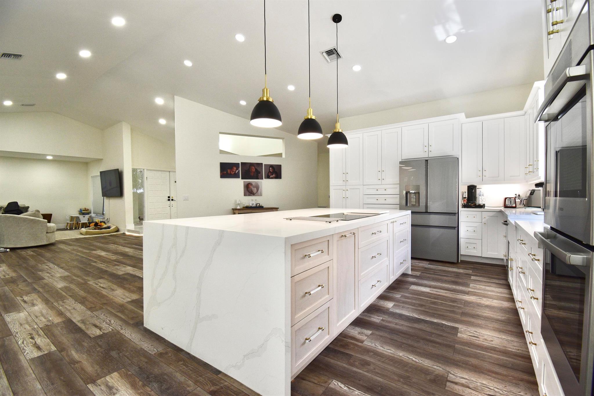 Boca pointe country club beautiful 3 bedroom 2 1/2 bath home with open brand new kitchen and waterfall island quartz countertops. New glass door refrigerator and induction cooktop from GE Cafe line. Double wall oven. New LED lighting throughout the home. All new floors and door moldings new ceiling fans throughout the house roof replaced in 2016. This is a great home not to be missed!