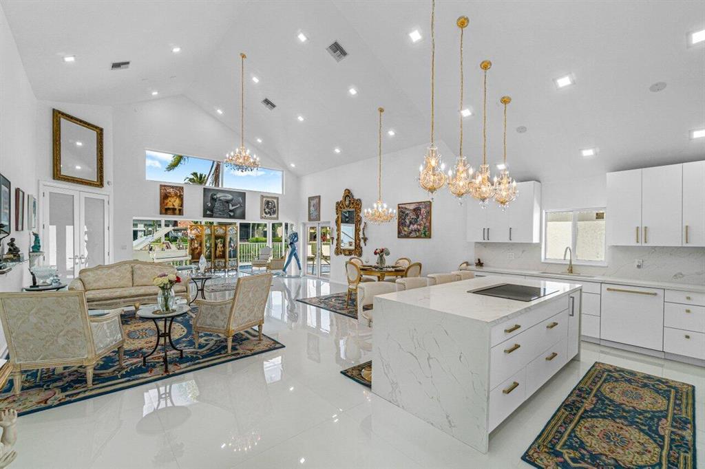 An impeccable home awaits in The Polo Club! Renovated to the highest standards, the luxury finishes and details throughout are stunning. Entering the home, you are greeted with voluminous ceilings and a light, calming color pallet. The open concept layout features large 48x48 white porcelain floors throughout to enhance the consistent contemporary feel. The chef's kitchen offers white European style cabinets and glass shelving for your most precious objects. Highlighted by a stunning double waterfall-edge Calcutta Quartz island, the kitchen flows seamlessly into the dining area. The spacious living areas provide the perfect backdrop to relax or entertain. Large impact windows and doors throughout illuminate the space, where you can enjoy the calm lake views. Take note of the elegant