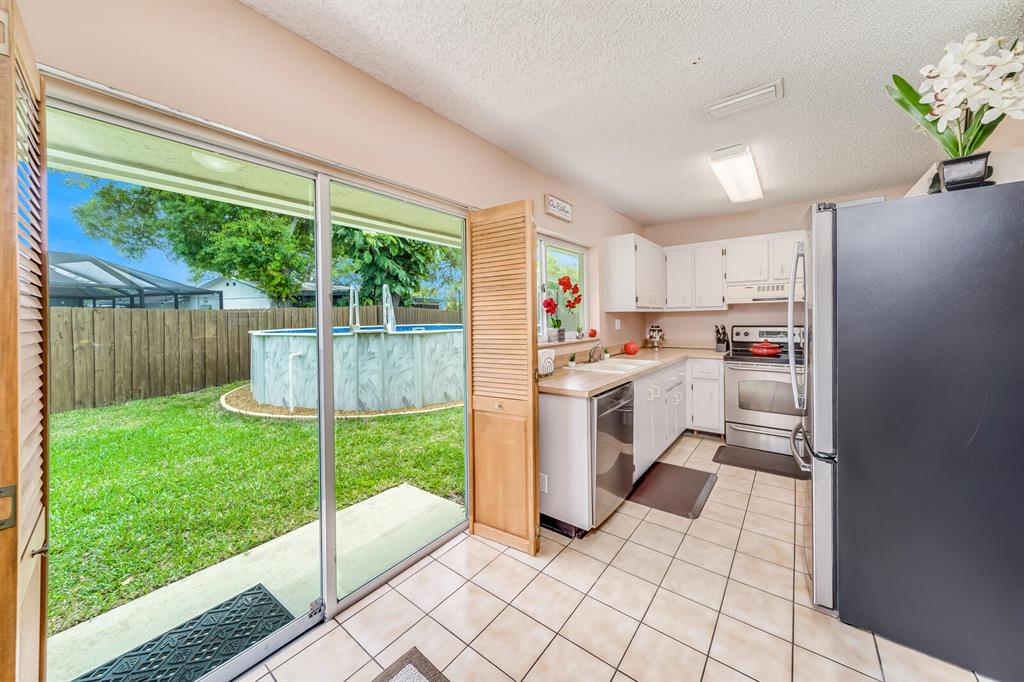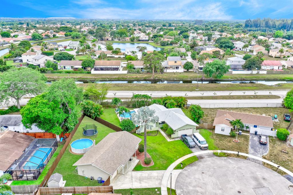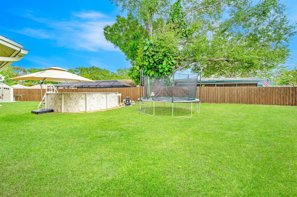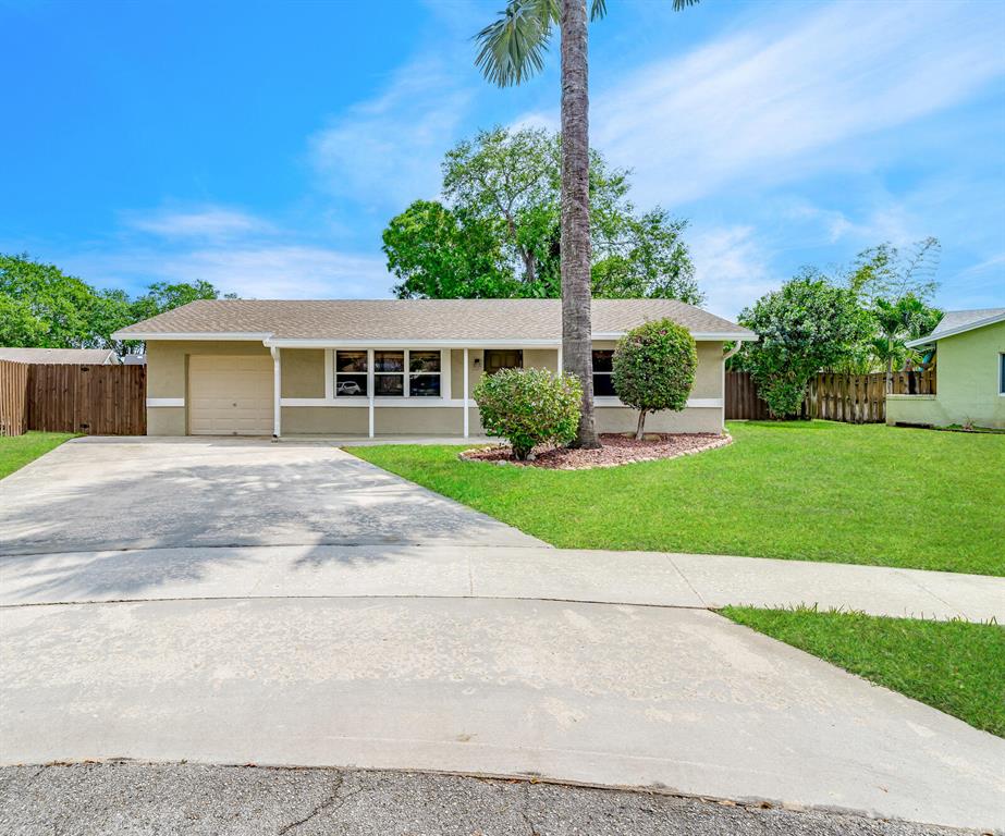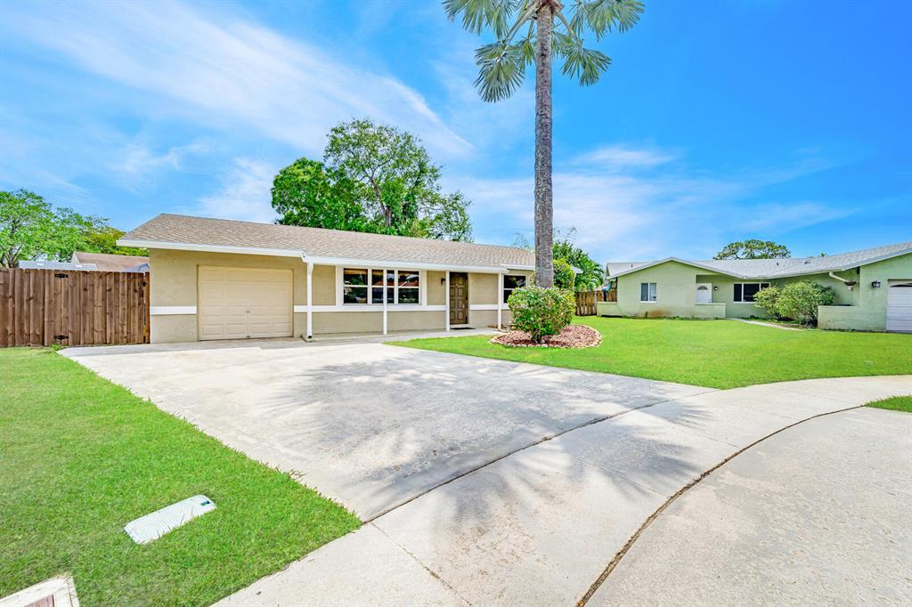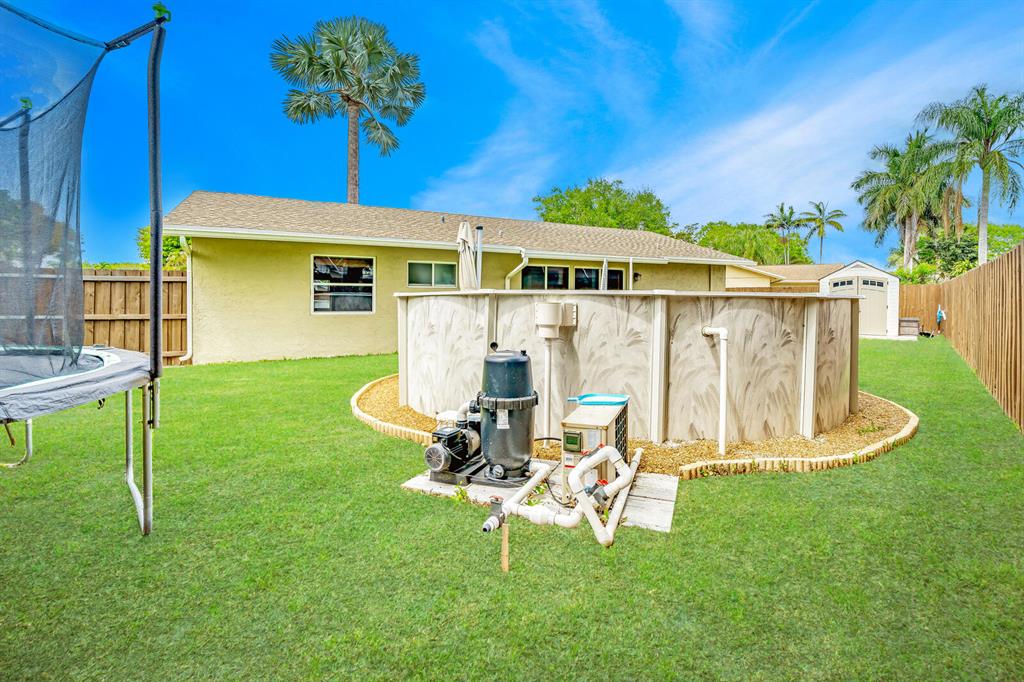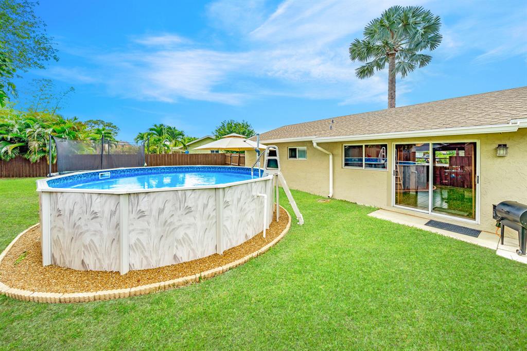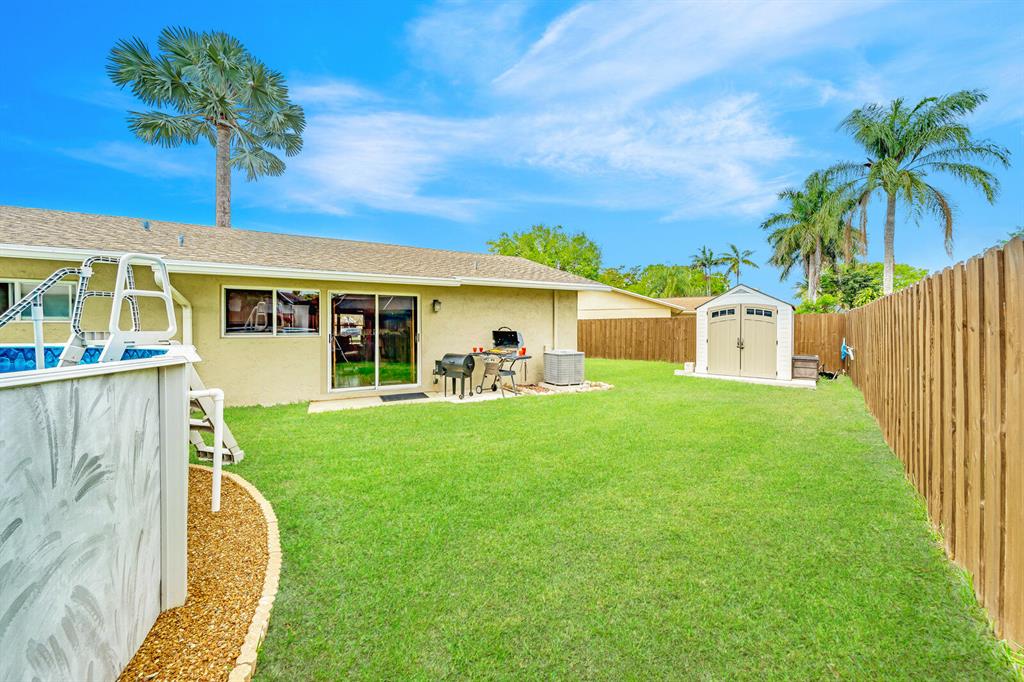 WOW! Located on a cul-de-sac with an oversized 6,911 sf lot this 2 bedroom, 1 bathroom, 1 car garage, pool, huge backyard single family home in Saddlebrook/Spanish Isles in Boca Raton with amazing Boca schools! Large upgraded concrete driveway that fits 4 cars with ease. Huge backyard that has a new fence from 2020 with wood stain (not paint). Not your ordinary above ground pool here. Pool is 18' round by 4' deep. Twin bottom drains, twin return jets, leaf skimmer, 1.5 HP two speed pump, 150 sq ft cartridge filter, FH120 heat pump with chiller, dolphin robotic cleaner, and removable safety steps. Plus a 10' by 10' purple leaf cantilever umbrella conveys as well. Rainbird Wi-Fi sprinkler system puts full control of your sprinkler system in the palm of your hand. 7' by 7' shed on