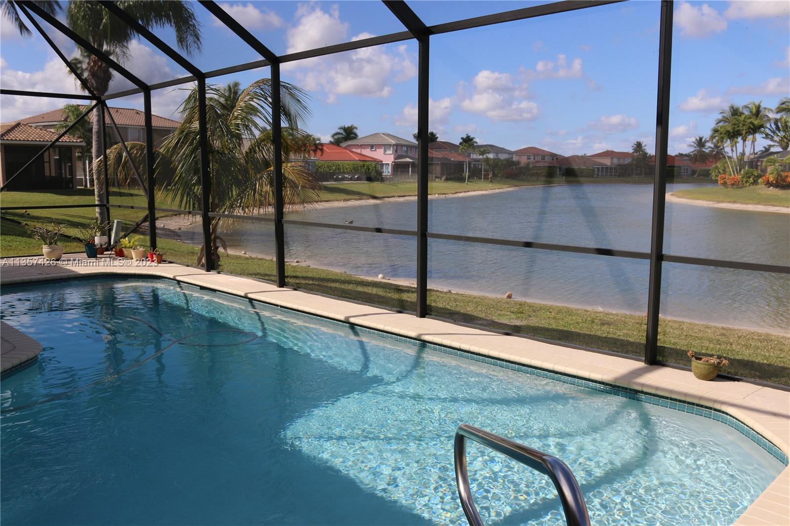 Breath taking LAKE views from the moment you step in this beautiful UPDATED one-story POOL home on a CUL DE SAC: 4 bedroom (3 bedrooms+Huge Den) 2.5 bathrooms. Enjoy the wide lake view sitting in the ENCLOSURE pool patio. HIGH ceilings, fully updated kitchen and bathrooms with granite counter tops and S.S. appliances. Beautiful tile all throughout the house. Huge master bedroom with his and hers walk-in closets, master bath with tub, shower, and double vanity. The house is fully protected with hurricane graded openings. 2 car garage and paved driveway that fits 4 cars. New roof 2020. Excellent schools! Community offers club house, two pools, tennis, and basketball courts. Pets are welcome.