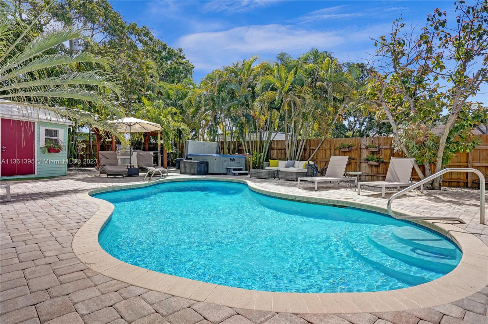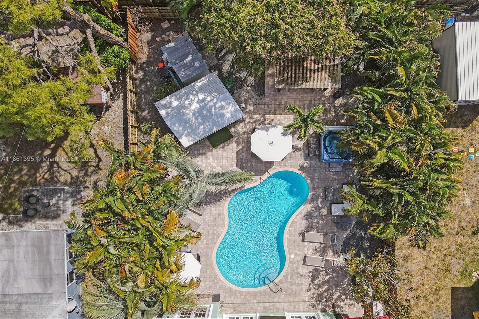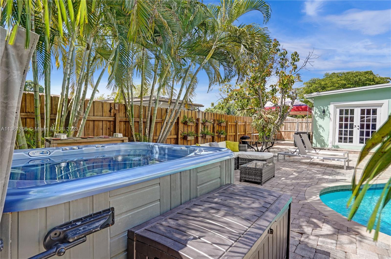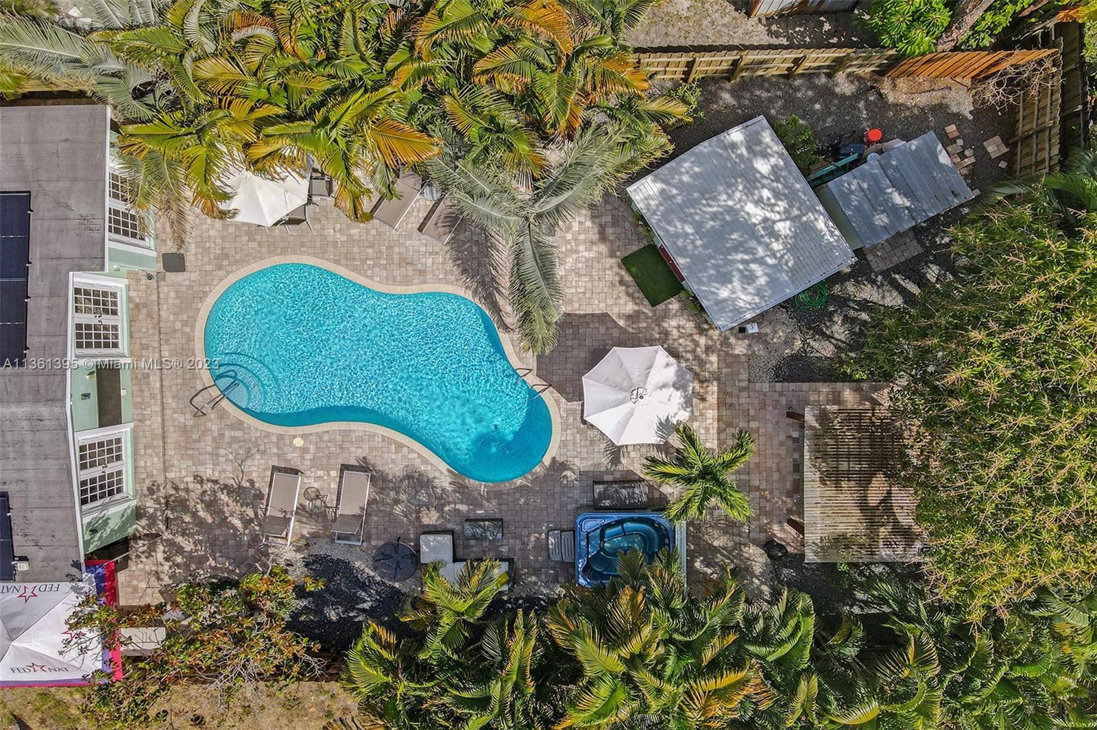 Live or Air B & B the Florida dream in this beautifully renovated 3/2 Pool Home plus cottage. This one has it all: 3 bedrooms 2 baths plus cottage, open plan, stunning updated kitchen and baths, large pool with heater and chiller, Hot Springs Spa, impact windows & doors & accordion panels, Tropical Kitchen, roof top whole house solar panels, car charging station, on demand tankless hot water, low maintenance tropical rock garden, 7 car parking. Open flexible living space and chef’s kitchen with stainless steel appliances and granite counters. The split bedroom plan ensures privacy for the primary bedroom. French doors from the Primary bedroom, main living, and guest bedroom lead to the garden oasis where you will splash, soak, relax, barbecue and dine amongst exotic palms and fruit trees.