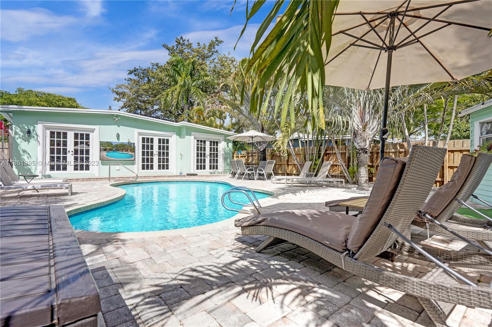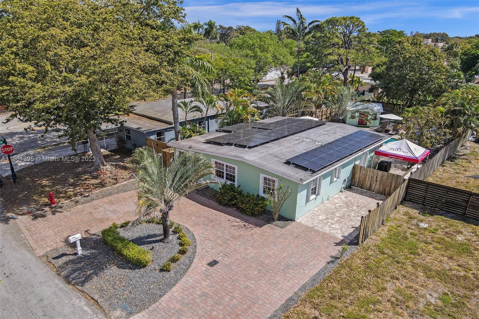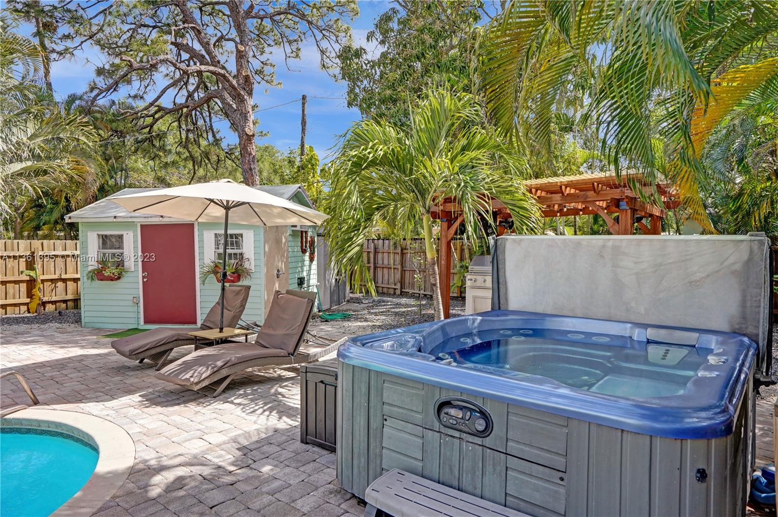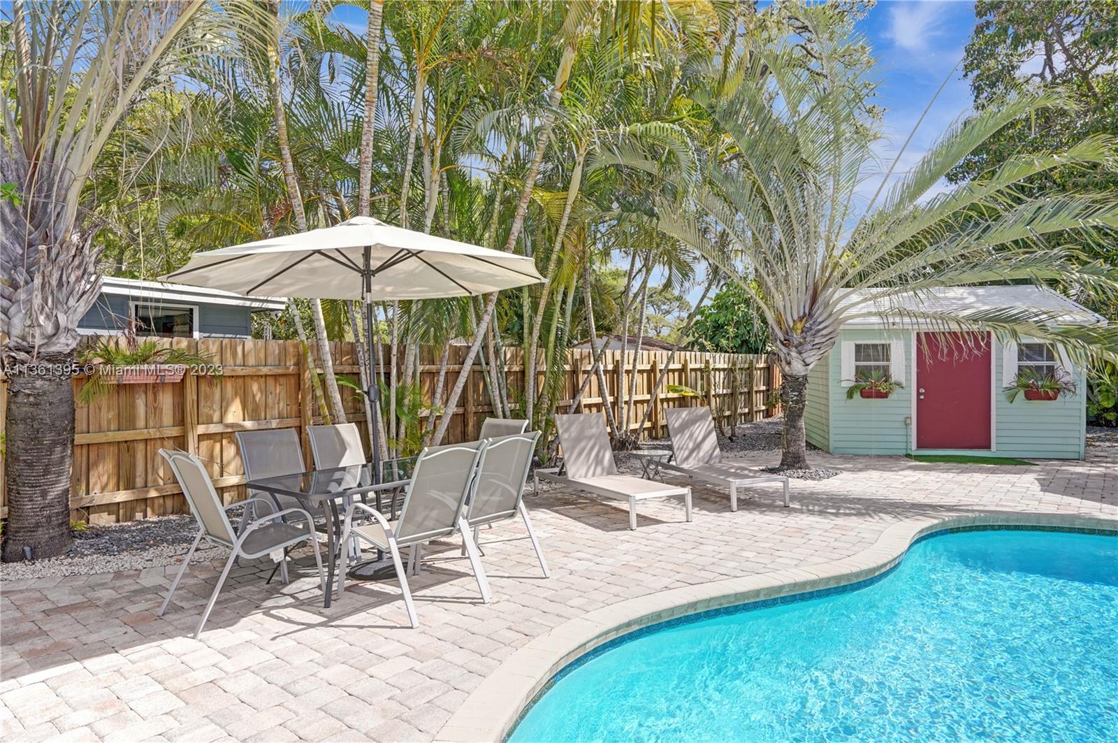 Live or Air B & B the Florida dream in this beautifully renovated 3/2 Pool Home plus cottage. This one has it all: 3 bedrooms 2 baths plus cottage, open plan, stunning updated kitchen and baths, large pool with heater and chiller, Hot Springs Spa, impact windows & doors & accordion panels, Tropical Kitchen, roof top whole house solar panels, car charging station, on demand tankless hot water, low maintenance tropical rock garden, 7 car parking. Open flexible living space and chef’s kitchen with stainless steel appliances and granite counters. The split bedroom plan ensures privacy for the primary bedroom. French doors from the Primary bedroom, main living, and guest bedroom lead to the garden oasis where you will splash, soak, relax, barbecue and dine amongst exotic palms and fruit trees.
