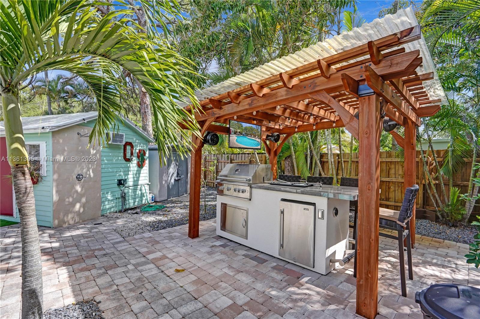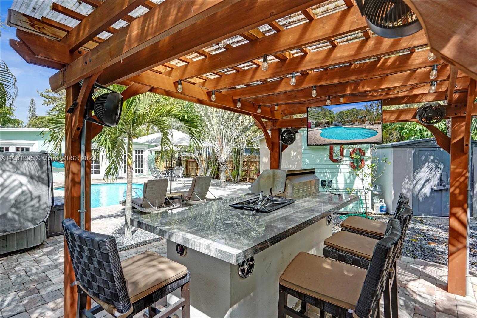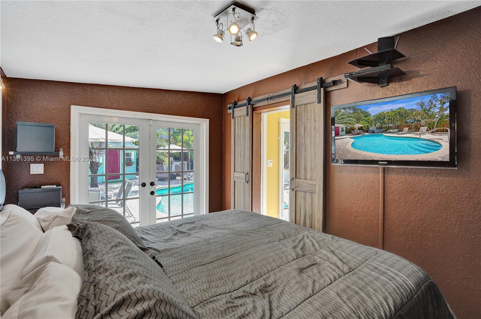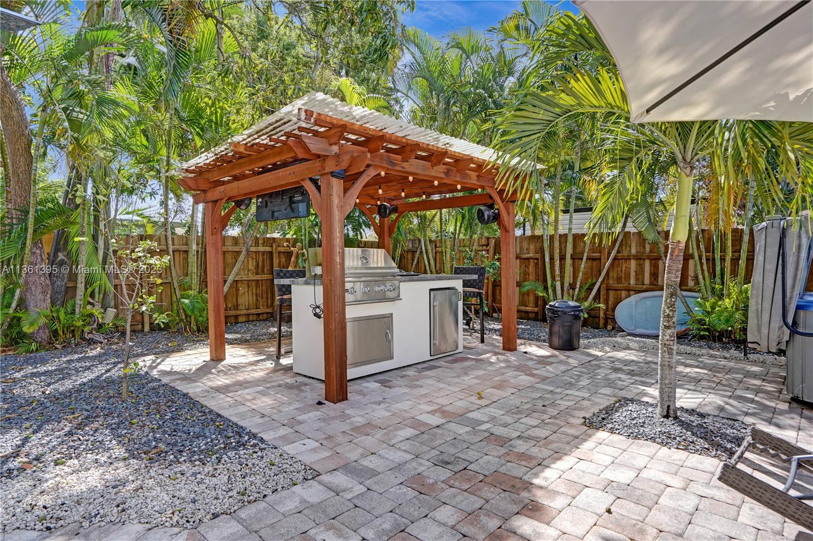 Live or Air B & B the Florida dream in this beautifully renovated 3/2 Pool Home plus cottage. This one has it all: 3 bedrooms 2 baths plus cottage, open plan, stunning updated kitchen and baths, large pool with heater and chiller, Hot Springs Spa, impact windows & doors & accordion panels, Tropical Kitchen, roof top whole house solar panels, car charging station, on demand tankless hot water, low maintenance tropical rock garden, 7 car parking. Open flexible living space and chef’s kitchen with stainless steel appliances and granite counters. The split bedroom plan ensures privacy for the primary bedroom. French doors from the Primary bedroom, main living, and guest bedroom lead to the garden oasis where you will splash, soak, relax, barbecue and dine amongst exotic palms and fruit trees.