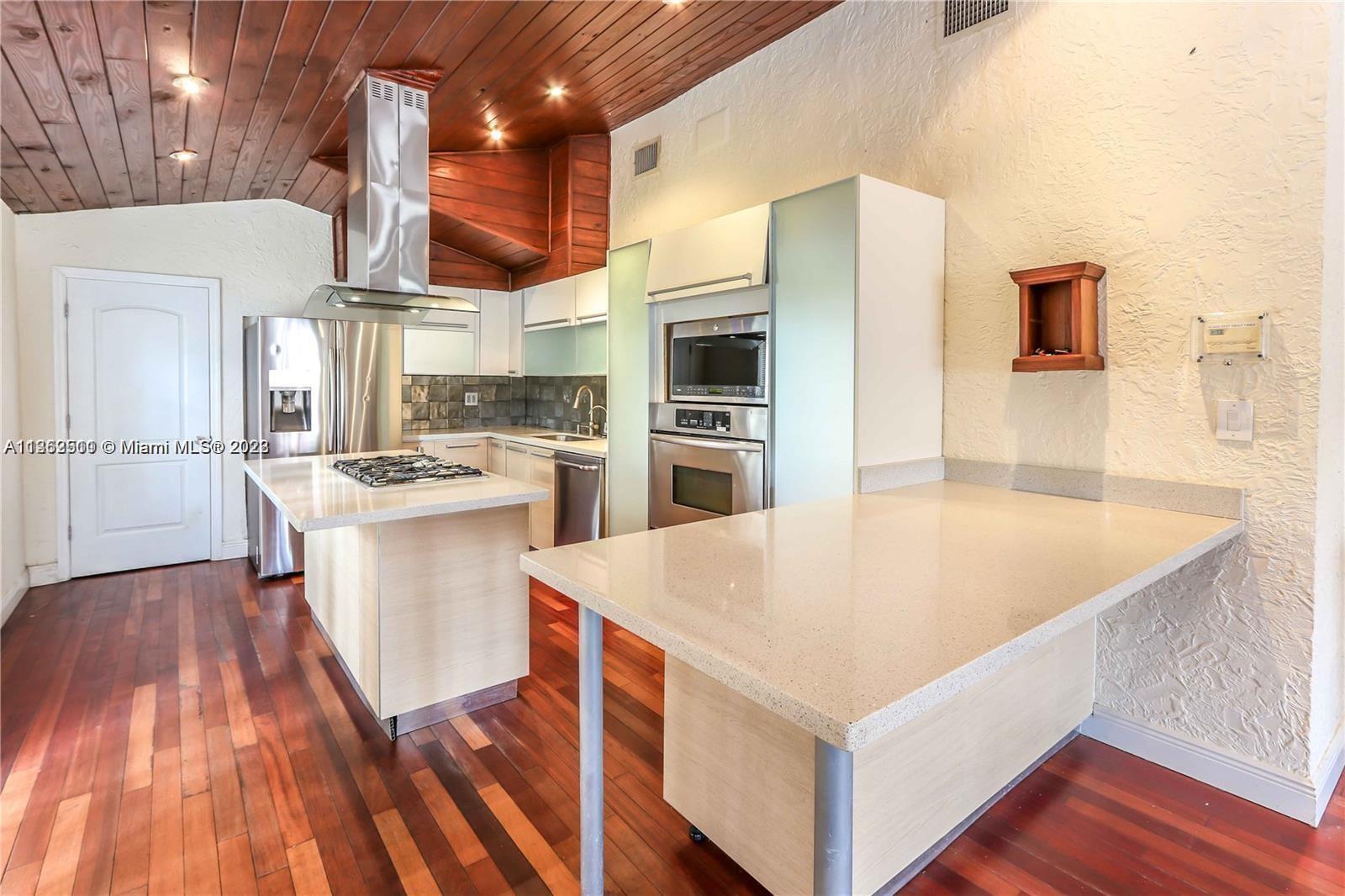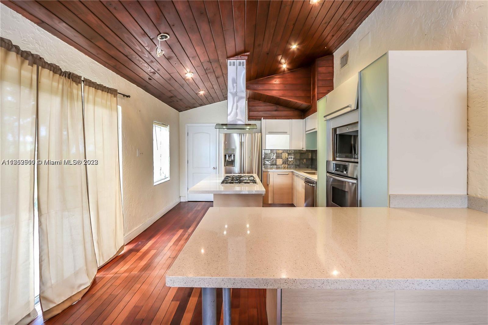 This 4 bed 3 bath home is on a double lot in a quiet neighborhood. It features exposed wood ceilings with recessed lighting. The kitchen is equipped with a hooded counter top gas stove and stainless steel appliances. Large bedrooms with updated bathrooms. The yard is fenced in with a pool and outdoor kitchen. There is plenty of room to park an RV or Boat. Please see Broker’s remarks for showing instructions