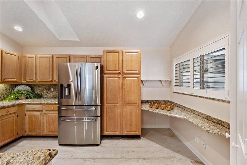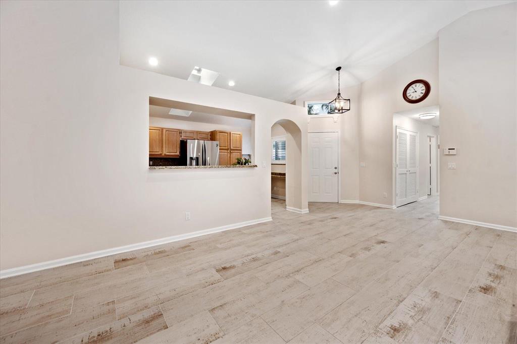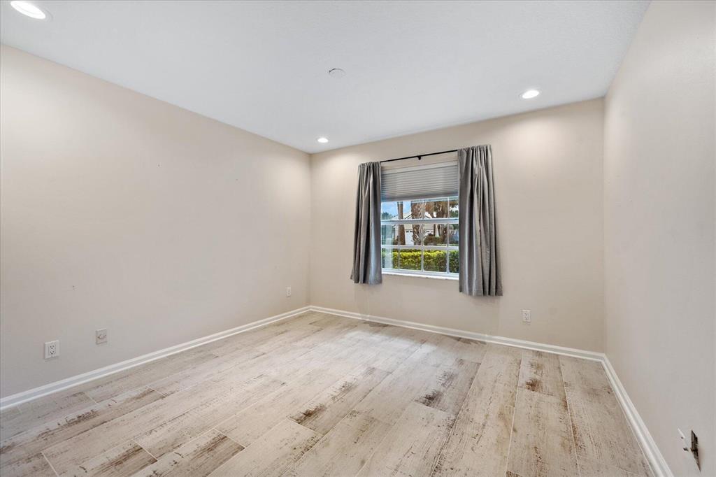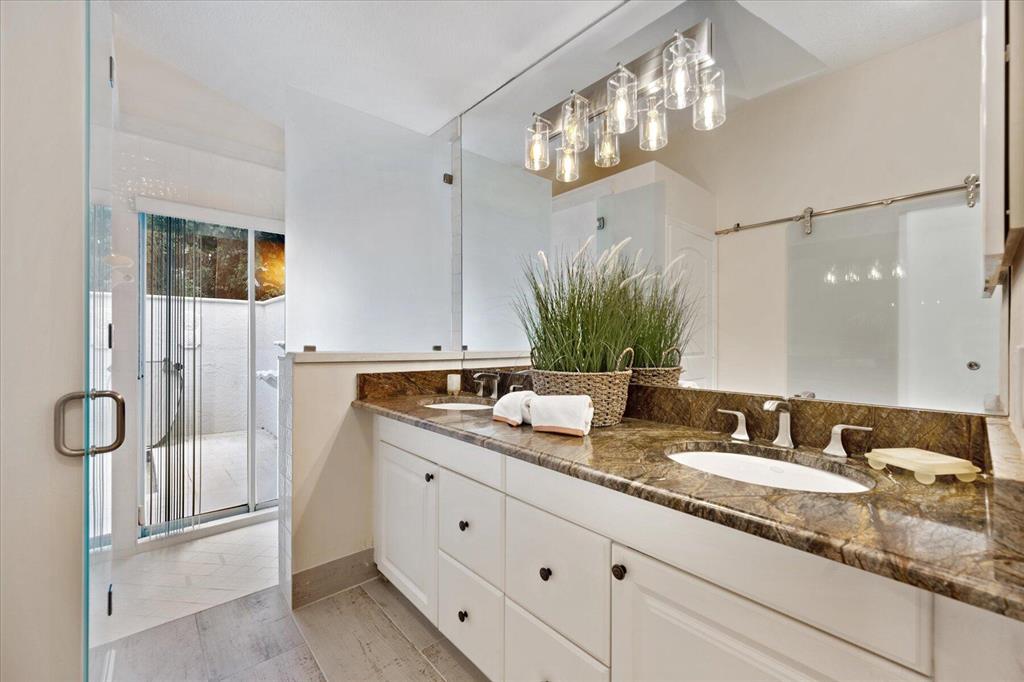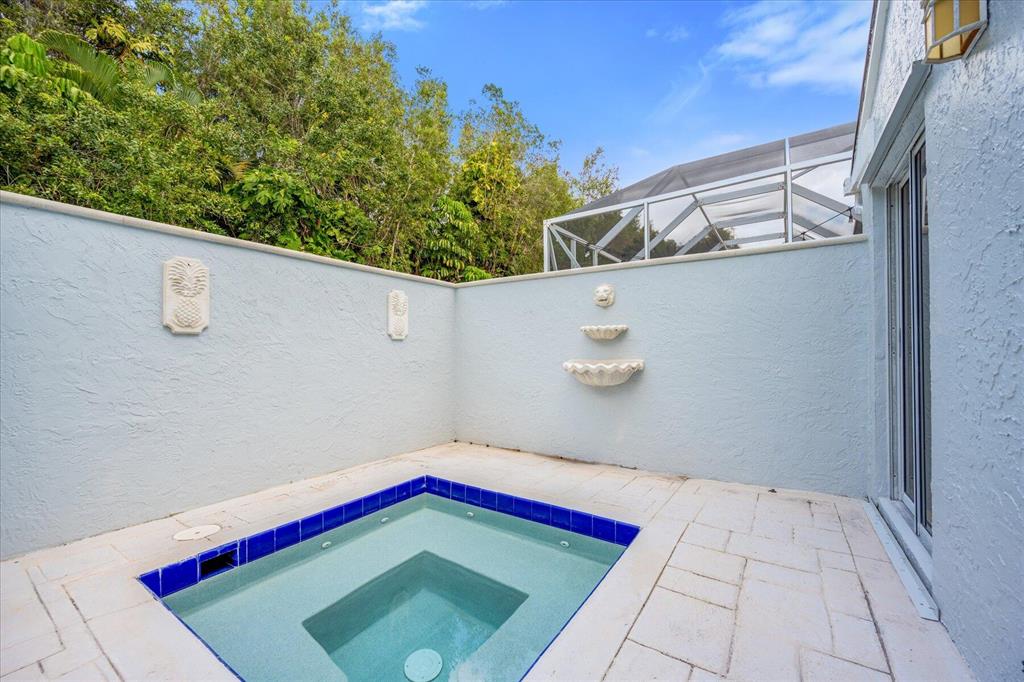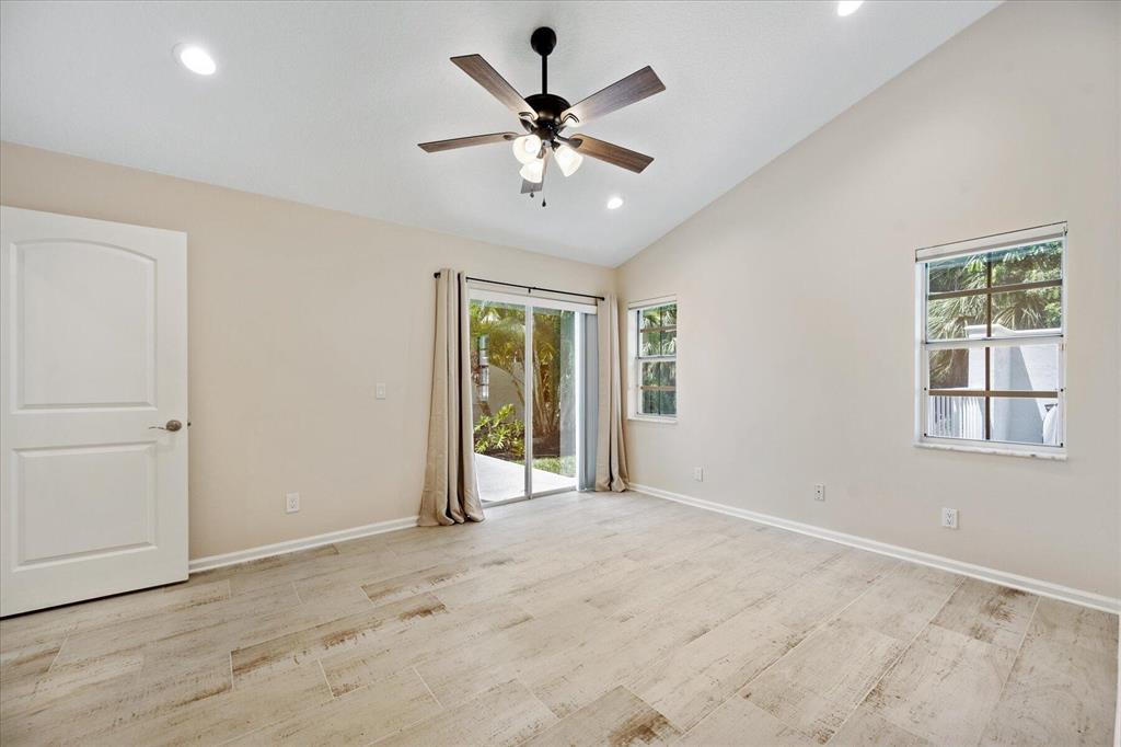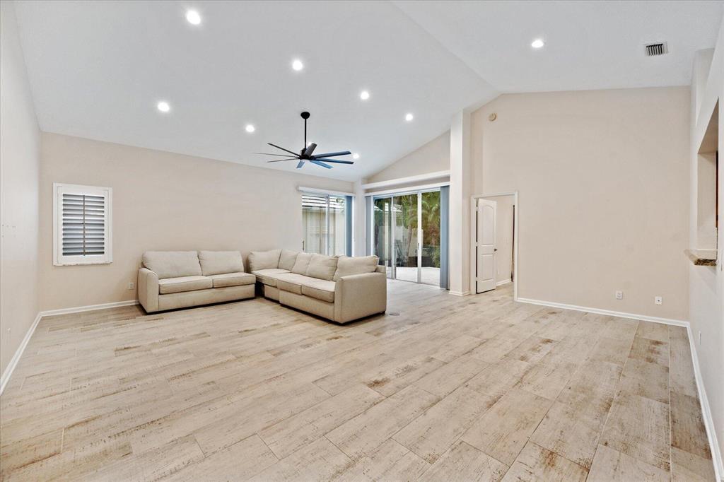 West Palm Beach's desirable gated community--Breakers West! Lovely home available in the popular Colony neighborhood with 3 Bedrooms, 2 Baths, 2 car garage with almost 1,600 AC Living Area. Freshly painted interior and exterior. New porcelain tile wood plank flooring thru out (no carpet in this house!) Great Room with vaulted ceilings opens to patio with private treed yard. Primary Suite has vaulted ceilings and will accommodate a king-size bed. Modern frosted-glass sliding barn door leads into Primary Bath with its marble vanity w/2 sinks, new frosted frameless glass shower door & lg walk-in closet. Or step out into In-Ground Spa surrounded by privacy wall. Popular split floor plan gives the 2 guest bedrooms privacy & ample space. Bedroom 2 & 3 share a lovely bath with tub/shower combo.