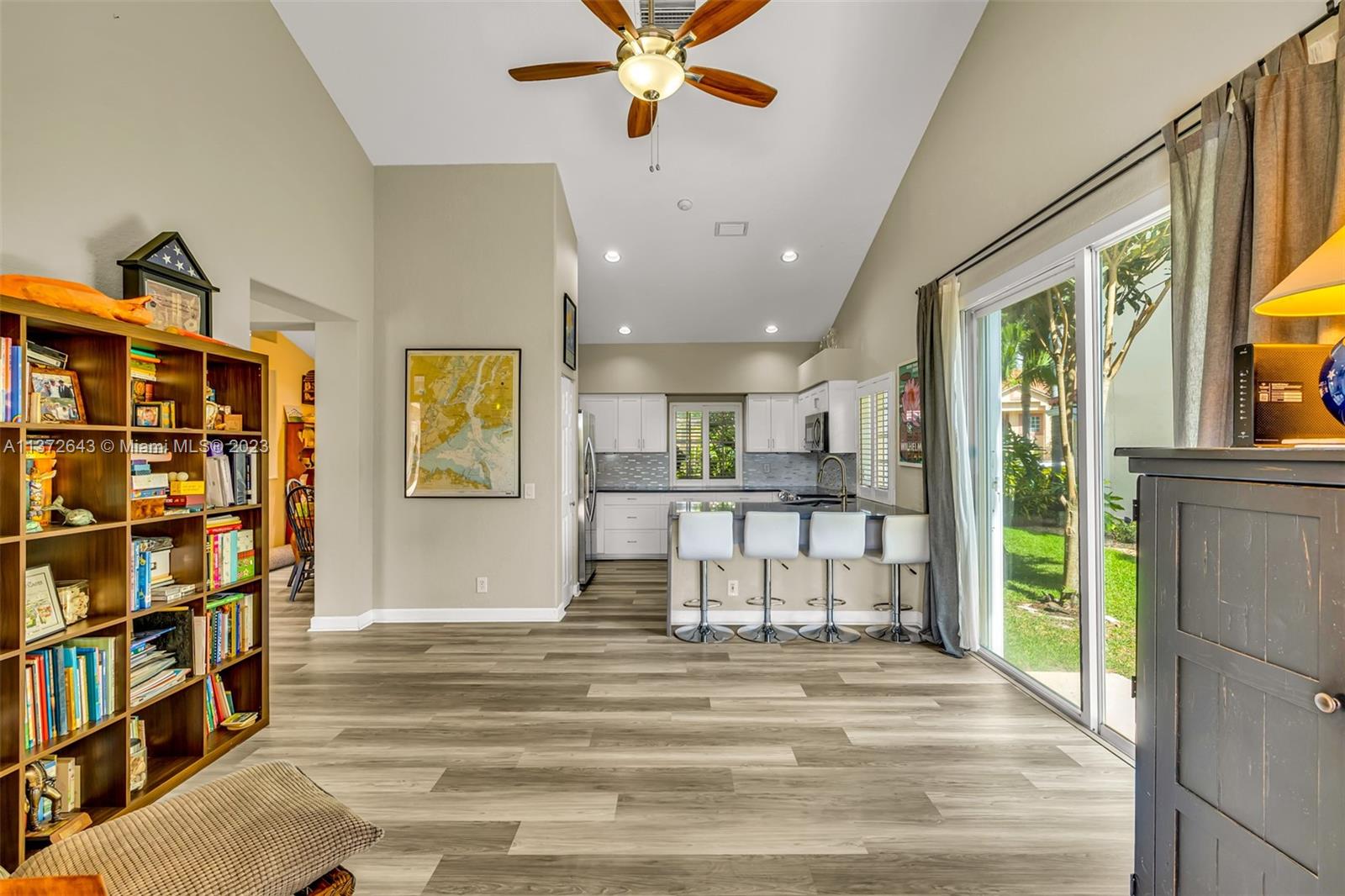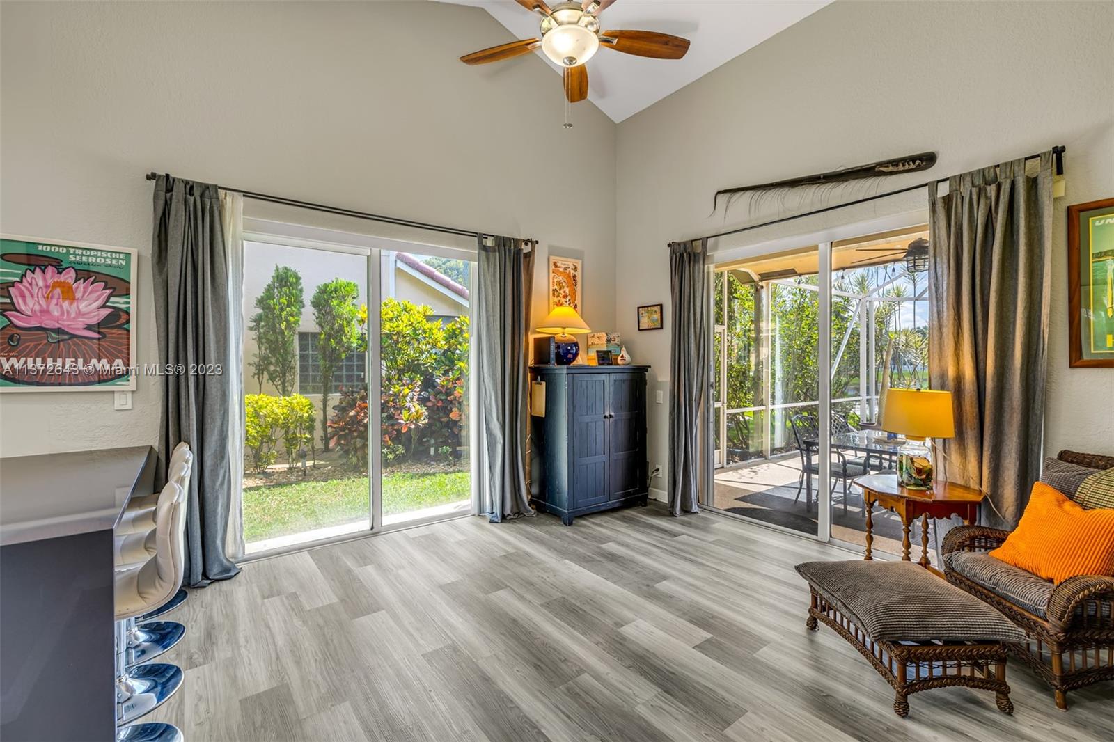 This distinctly cozy home welcomes you with a sizable & homey environment in a beautiful setting. Offering an excellent layout with high ceilings & wrap-around sliding patio doors in the lower level, incorporating light & the outdoors. New lower level flooring, formal dining with access to courtyard, comfortable kitchen w/ beautiful cabinetry, quartz counters & plenty of storage options. Primary suite w/ ample closet space. The large en-suite bathroom also serves as cabana bath. Upstairs features real hardwood flooring, 3 Br's + bath. Updated A/C & electric panel, garage door & accordion shutters. Relax in the privacy of your screened lanai & heated pool/spa w gorgeous views. Laguna Springs is a hidden gem of just 106 homes, ideally situated, steps from schools, parks & places of worship.