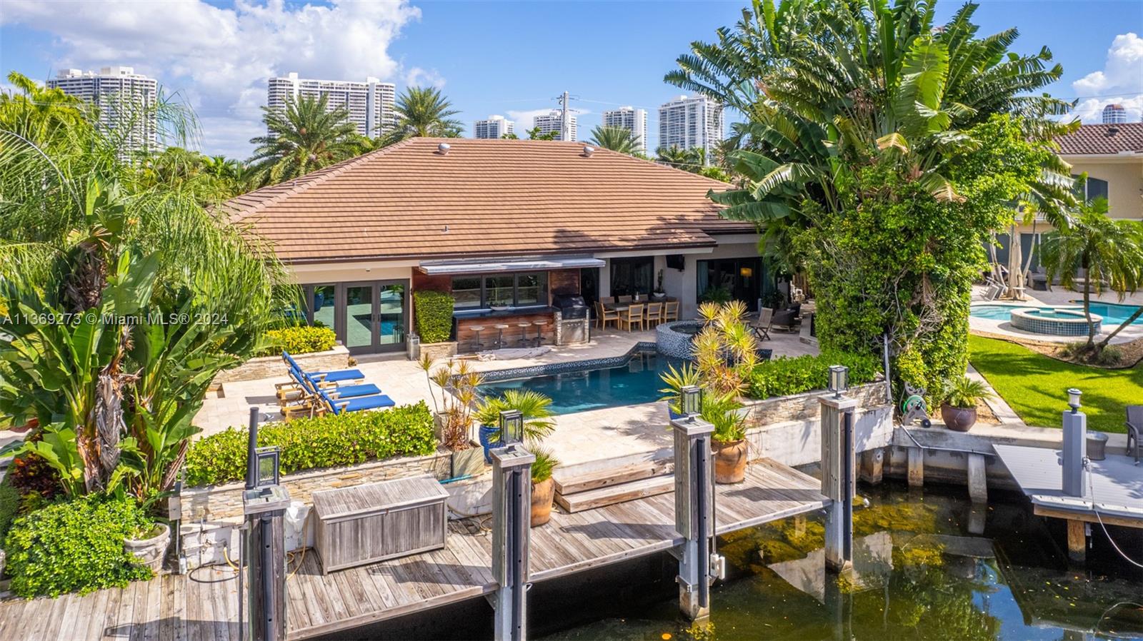 This stunning one-story custom-built home is a dream come true for yacht owners, offering 50ft of waterfront property. The home boasts high ceilings. Perfect for boat enthusiasts. Professionally decorated with the finest quality finishes throughout, including custom-built wall units, impact windows and doors, wood plank floors, and a newer (1 year) flat tile roof. The home features a built-in bar, a huge great room, and a newer remodeled spacious eat-in kitchen with marble countertops and backsplash, a Miele gas stove, Miele oven, microwave, espresso, and wine cooler, built-in Subzero refrigerator and freezer, tall cabinets, and pull-out pantries. A must see opportunity.