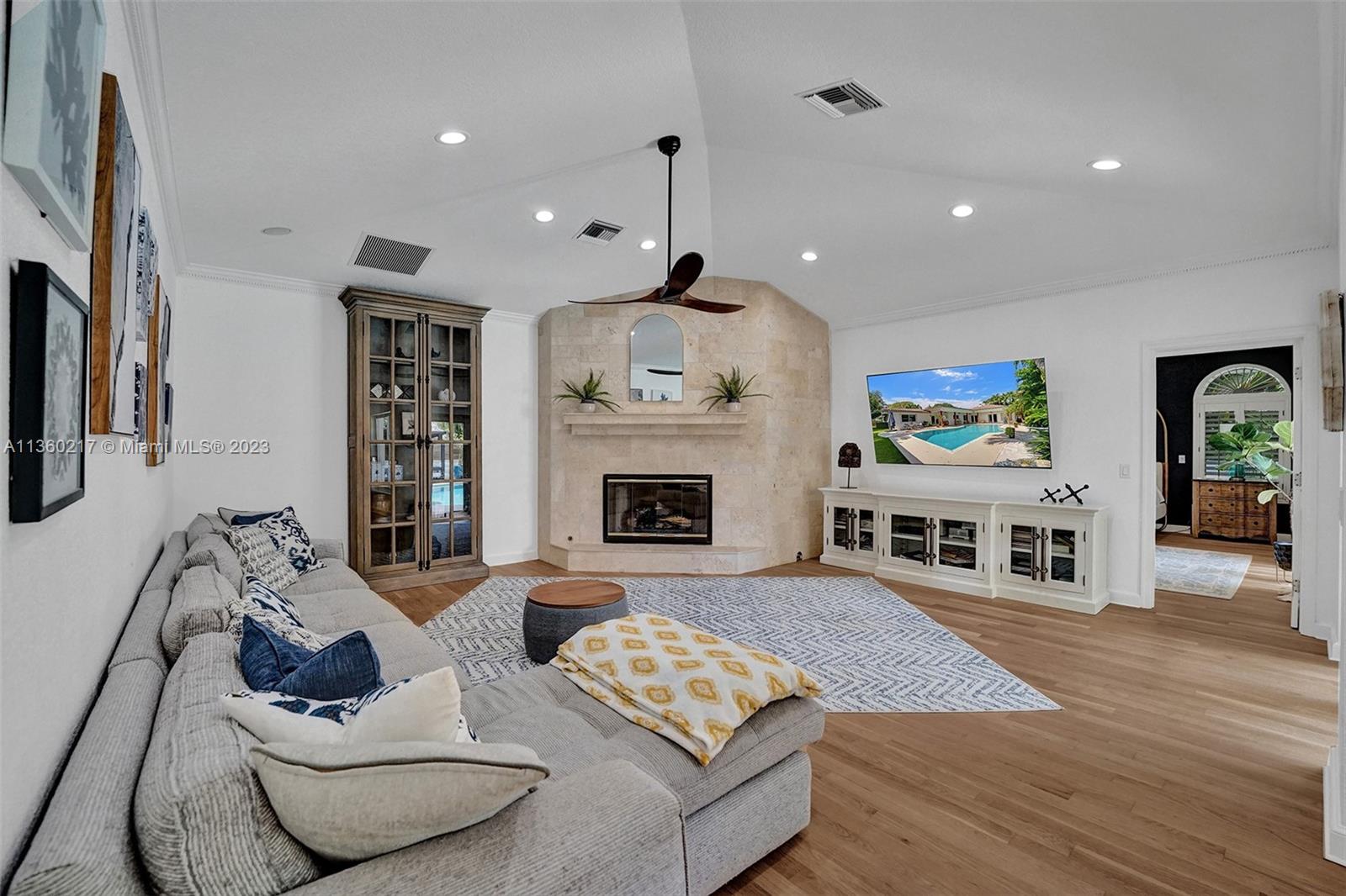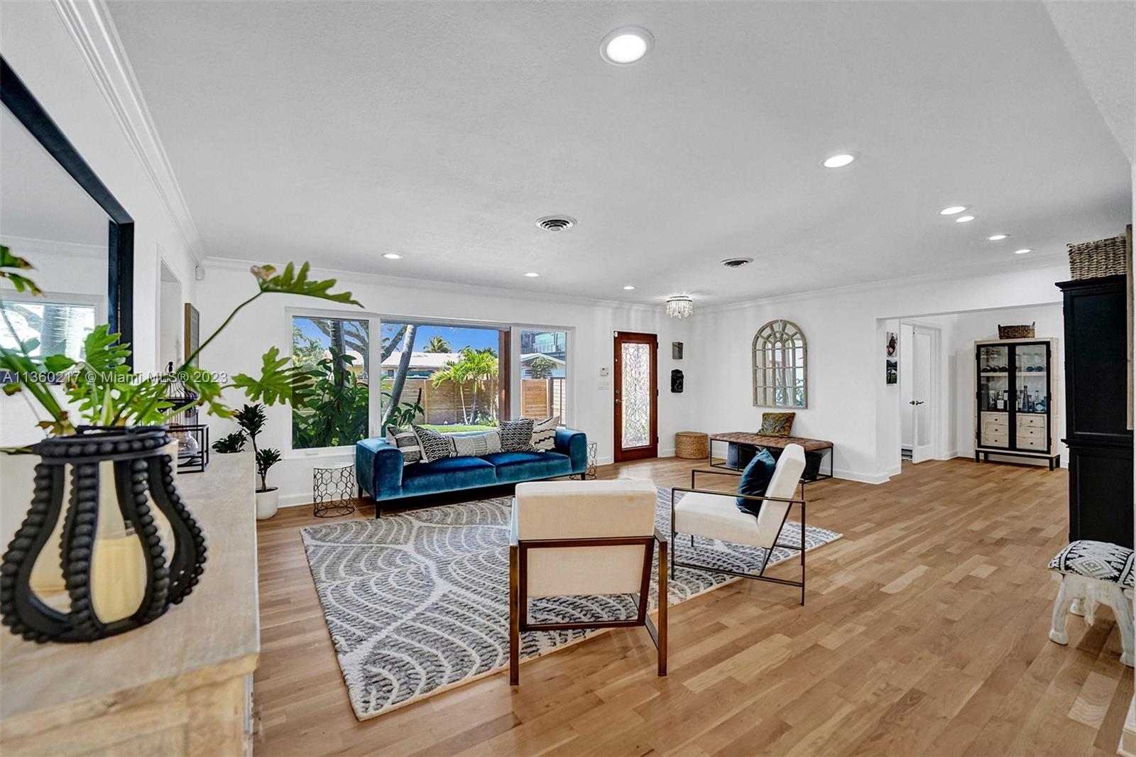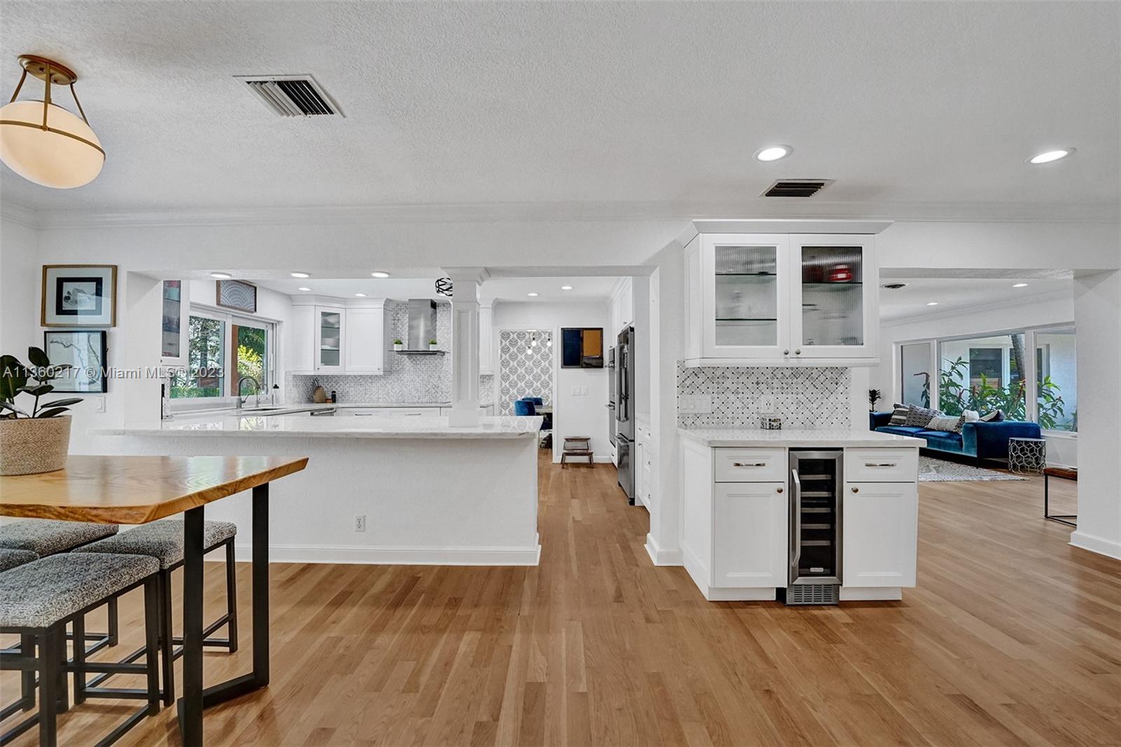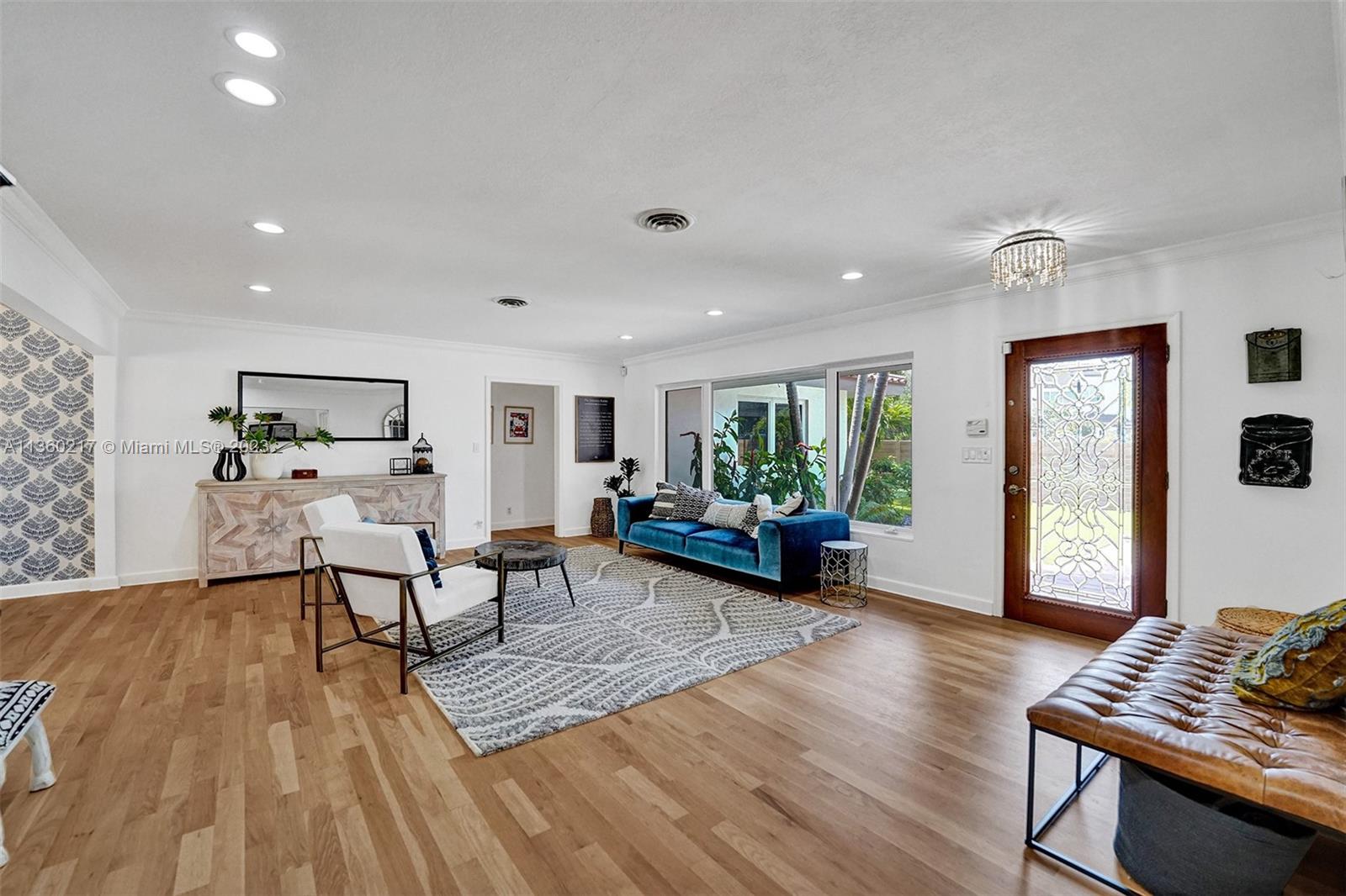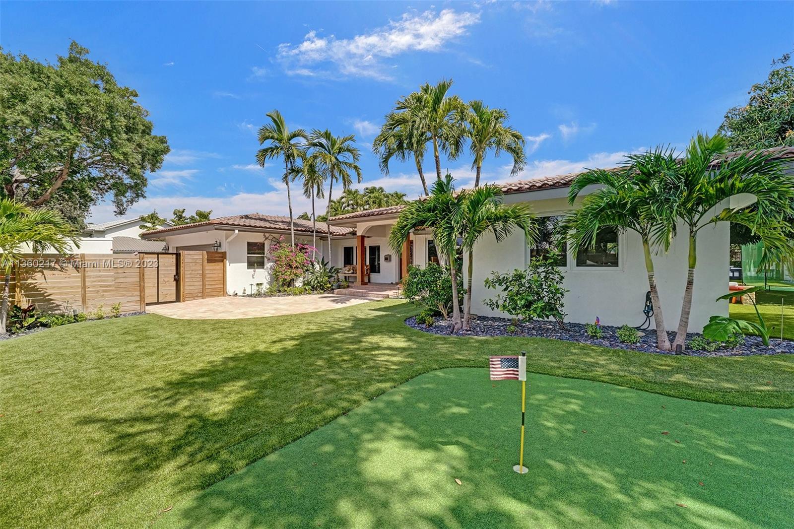 A pristinely located estate w/large private paradise wraps entire property. Interior boasts refinished white oak wood floors and recessed lighting throughout. Chef’s kitchen w/slow-close Italian cabinets, quartzite counters, JennAir appliances + bar. Family room w/travertine marble gas fireplace! Master bed w/pool access, walk-in + en suite w/steam shower + expansive vanity. 2 large guest bedrooms, 4th bed is office! Massive bonus playroom/den w/volume ceiling. 2 new HVACs, new electric panel (’21), whole-house generator and H2O filtration system. Tropical landscaping, heated saltwater pool, covered patio, cabana, putting green and expansive artificial turf, Impact windows & doors. Walk to Ocean, Publix, Galleria Mall, Capital Grille, Starbucks, George English Park and Birch State Park.