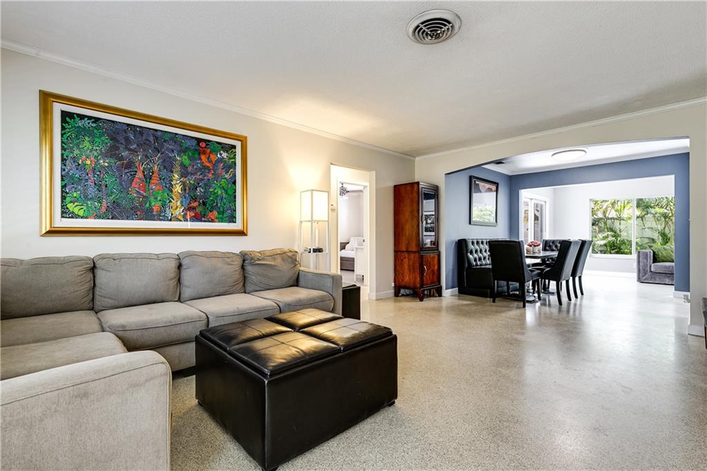 Move-in Ready 3 bed/ 2 bath home in Coral Ridge Isles. This charming home greets you with classic terrazzo floors that continue throughout the house. Beautiful kitchen updated in 2022 with quartz counters, large island with under-mount sink, stainless appliances and even a wine fridge. The split floor plan gives privacy while the open living area makes the home great for entertaining. Covered patio is perfect for the outdoor living we enjoy yearlong in South Florida. Large 1.5 car tandem garage with plenty of storage. Yard is fully enclosed with new PVC fence and room for boat storage. Impact windows and doors throughout and new roof in 2016! Great location right by Pine Crest School. Easy access to major highways and just minutes to the beach!