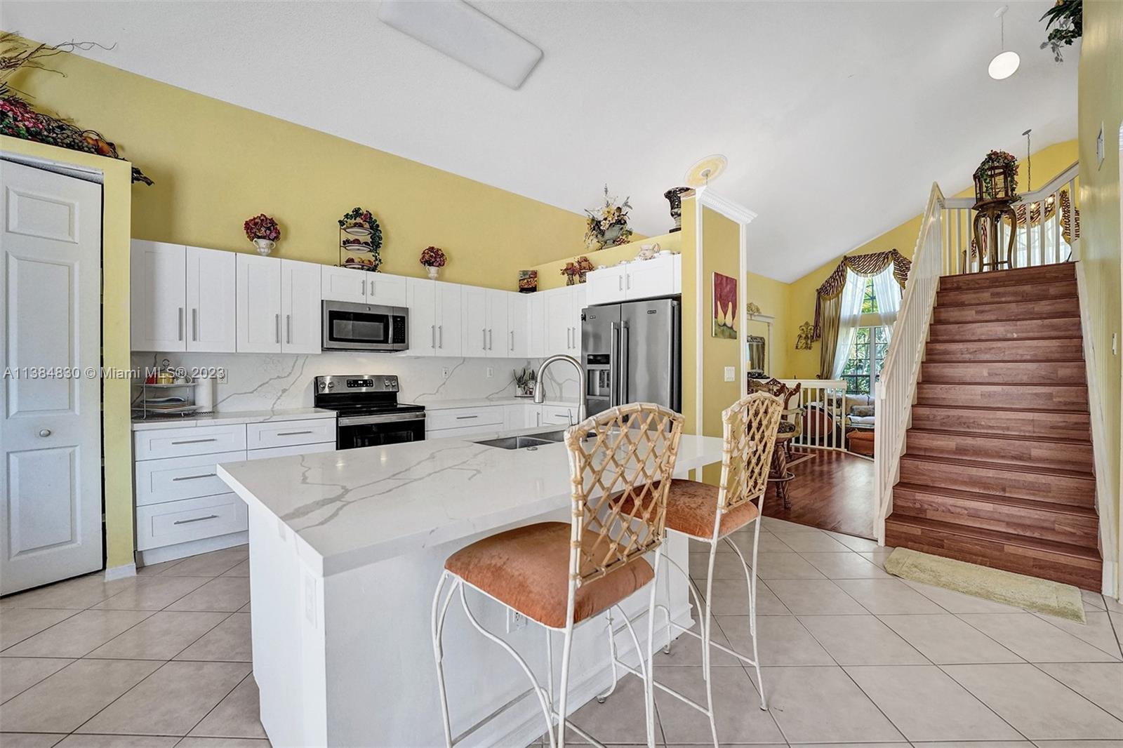 Spacious, bright, beautiful 2 story, high ceiling 4B/4b home ready for new family! Brand new kitchen with quartz countertops island. One full bedroom/bathroom downstairs. Master Bedroom Suite offers sitting area, 2 complete Master Bathrooms with separate soaking tub, dual door shower, and walk in closets. Spacious family room, separate laundry room. Two car garage. Panels on the 1st floor and accordion shutters on the 2nd Floor. Fenced backyard with fruit trees. Gated community with security, amenities include, 2 pools, tennis courts, basketball court, gym, playground, and much more! Close to Schools, Shopping, Dining and Highways! Price to sell! Easy to show.