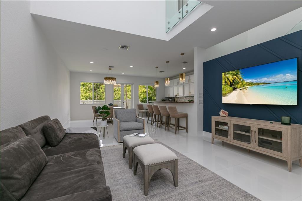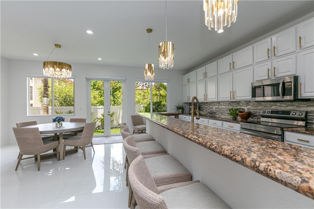 Beautifully, sophisticated 1st & 2nd floor townhome in the heart of happenings in Pompano Beach. Stunning open floor plan, great room with high volume ceilings, large kitchen w/ granite counters, lots of cabinet space, brass accent handles/lighting, SS appl, white porcelain 24x24 tile throughout main floor, high-quality water resistant laminate on the 2nd floor. Stylish modern glass/steel staircase & catwalk railing. Full size washer/dryer, 1 garage, 1 covered carport. Bathrooms are light & bright w/ glossy white vanities, mosaic tile flooring, walk-in shower & soaker tub in the primary bath. Ample closets throughout w/ double walk-in closets in the primary bdrm. Impact windows & doors, small back patio/yard space that's so lovely off the dining & kitchen. Community pool. Gated community.
