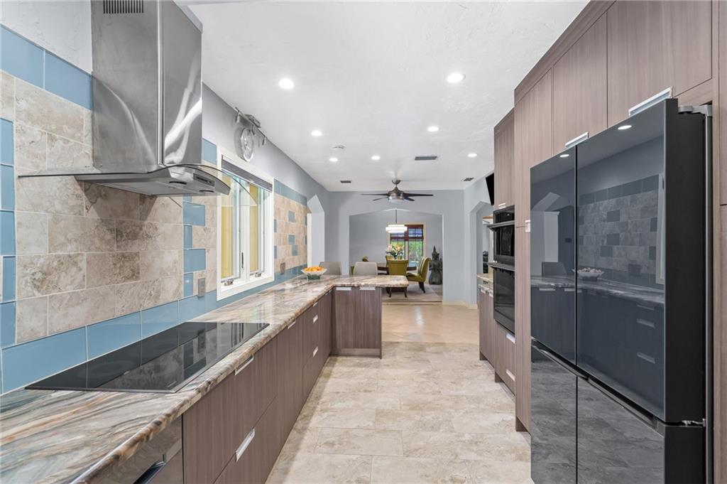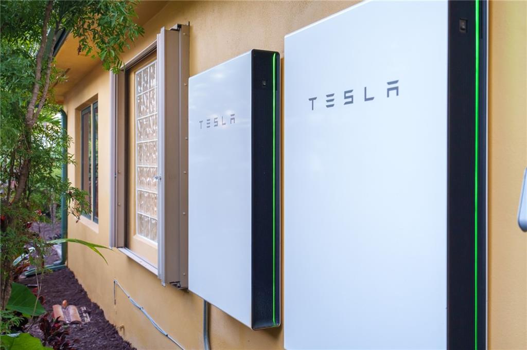 The Poinsettia Heights Home, Reimagined. Powered by Tesla, this eco-conscious home teems with energy-efficient upgrades and healthy home must-haves. Designer kitchen with quartzite countertops and premium Samsung appliance package. Custom addition with 9-foot ceilings adds two bedrooms and a covered patio area. The generously sized primary bedroom (20x18) has cove lighting, an oversized ensuite bathroom with walk-in shower, a Grohe shower system, and a masseur soaking tub. Renovated hall bathroom with step-down shower, premium Jeldwin impact windows, and a hurricane-rated garage door. Thirty-six solar panels with 2 Tesla Powerwall battery backups, dual-zoned HVAC (20 & 14 SEER rating), plus UV light cleaner. Upgraded electric with surge protection and newer PVC sewer pipes.