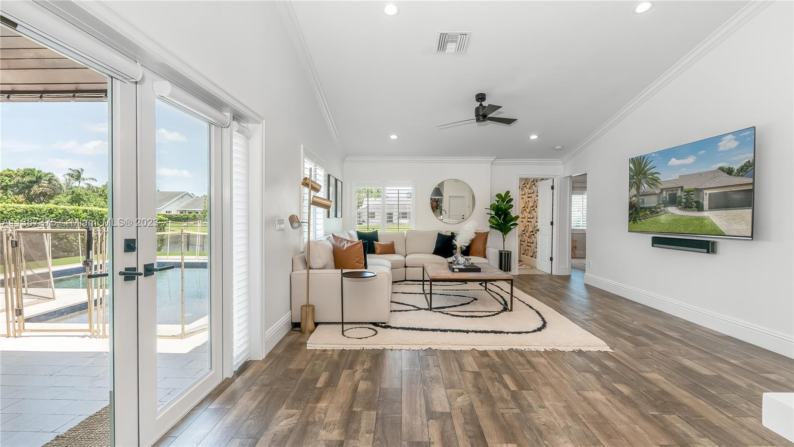 Marvelously Stylish and Upgraded Home with Heated Swimming Pool! Situated in a coveted community only ½ mile from excellent schools, this 4BR/3BA, 2,300+sqft property dazzles with lush tropical greenery and a custom paver driveway. Only updated by licensed contractors with appropriate permits, the interior features an open concept floorplan, plantation shutters, automatic blinds, and a gourmet kitchen with highly-rated GE Monogram appliances. Gather outdoors in the fenced-in and fully-turfed backyard, which has a heated PebbleTec pool with LED lights (controlled by app) and a covered lanai. Find tranquility in the primary bedroom with a California closet and chic en suite. Other features: insulated 2-car garage w/built-ins, newer roof (2018), near shops, and more! Call now for your tour!