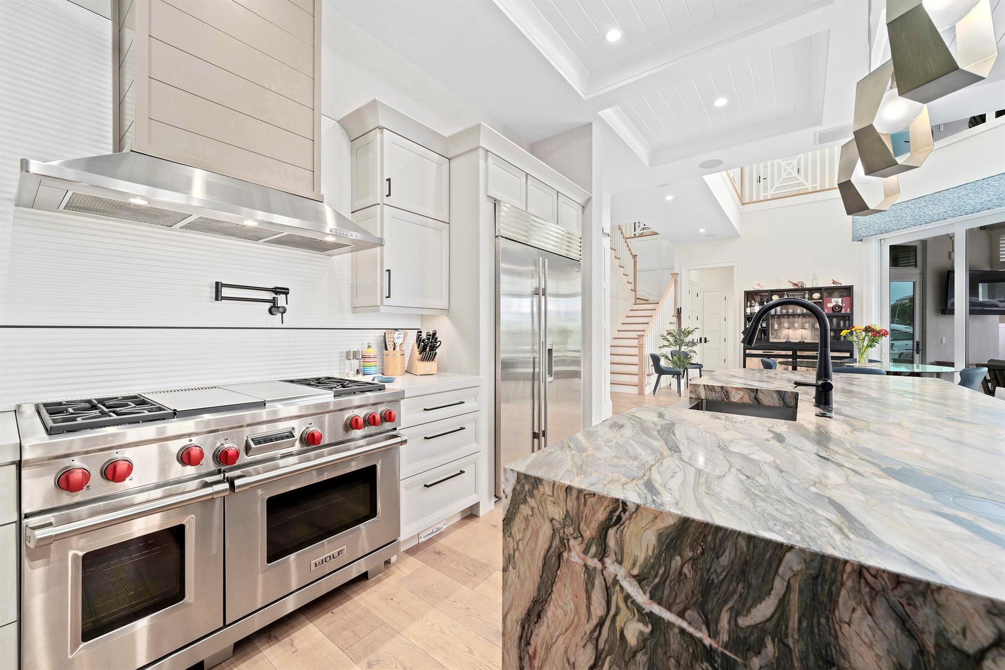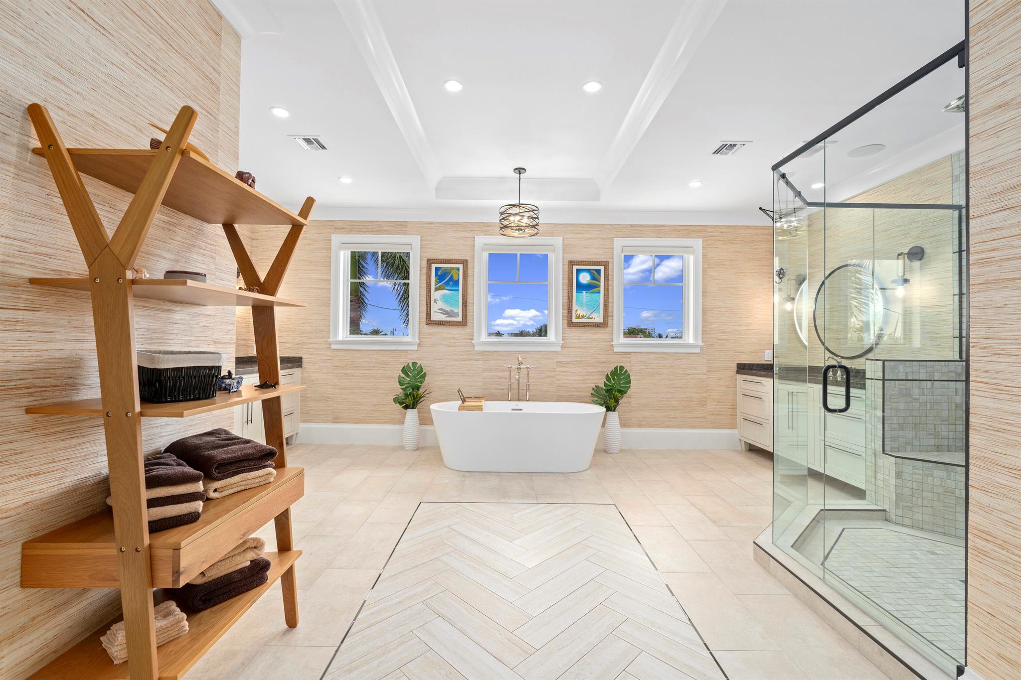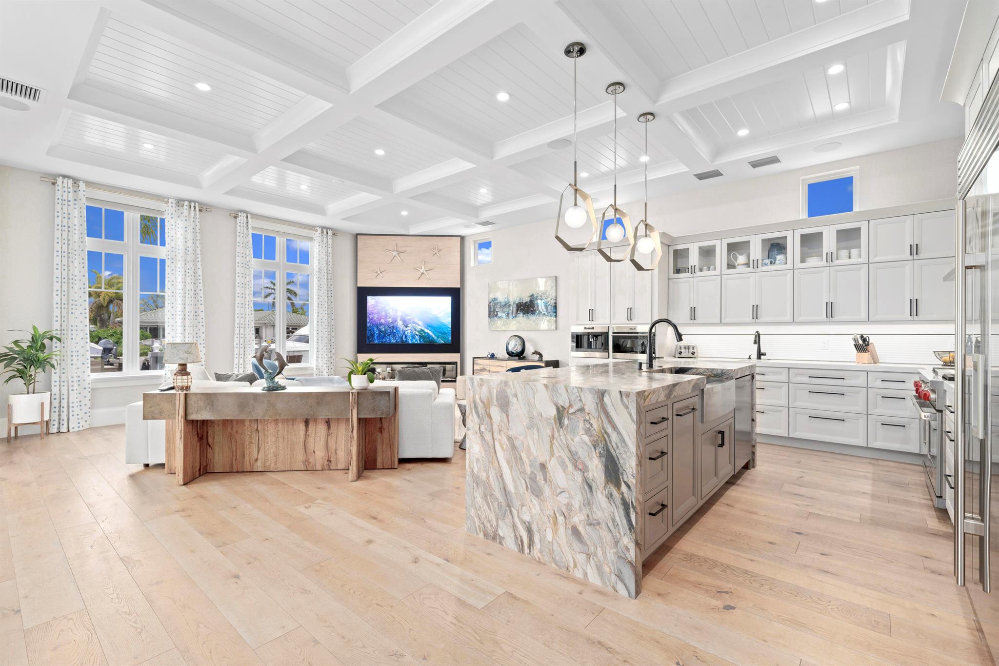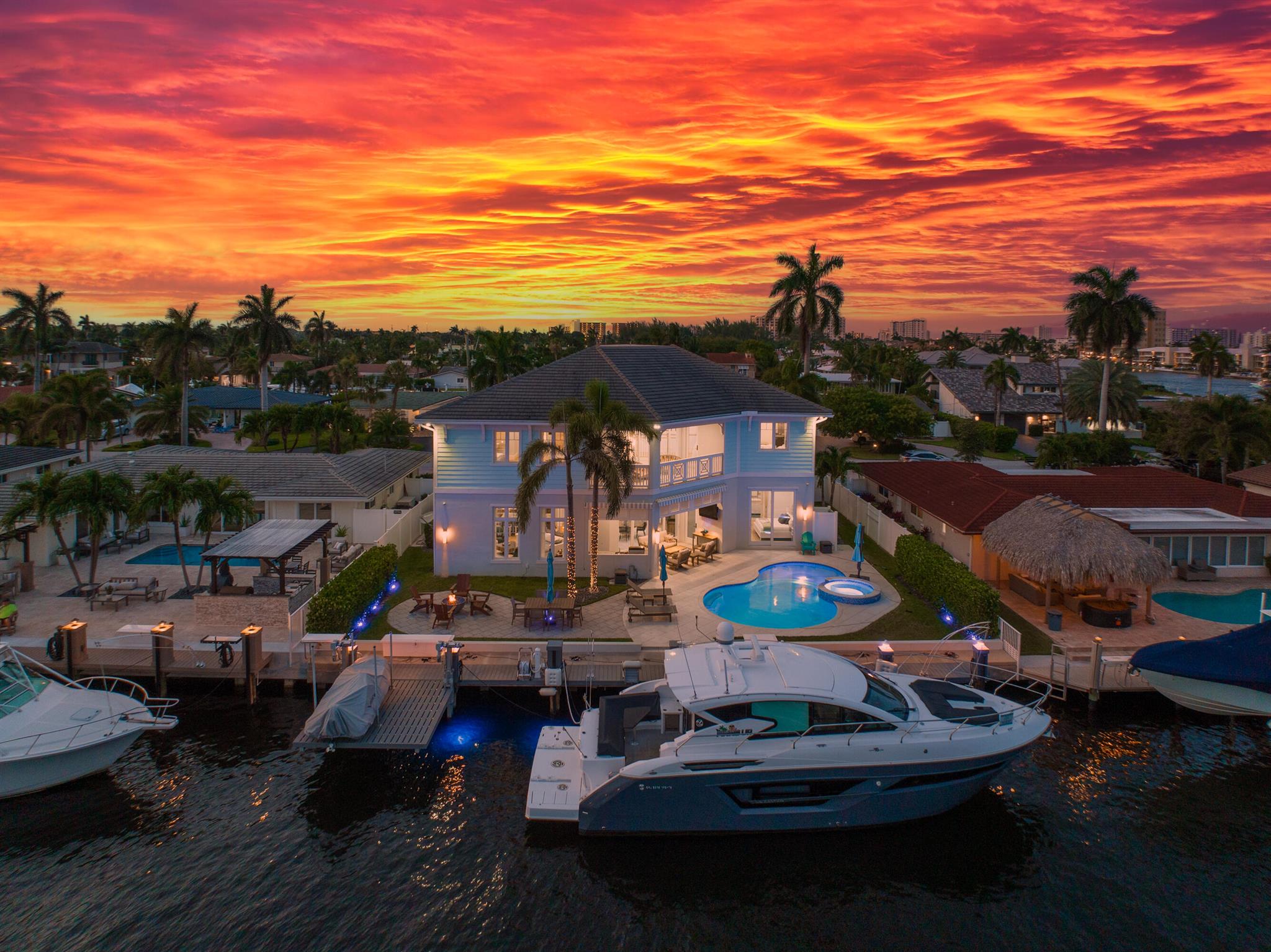 Stunning British West Indies-inspired deepwater estate in the exclusive enclave of Pompano Beach, Florida. Overlooking the Capri Canal, this estate features more than 80 feet of water frontage, offering direct Intracoastal and ocean access, and is only minutes from the Hillsboro Inlet. This home is an epitome of luxury living, encased in luminous glass rooms with breathtaking views of the waterway and a resort-style pool. Engineered with smart home automation, this estate extends its intelligent features to all corners, including the garages. The Chef's Kitchen is a classic blend of chic design and modern amenities, boasting Sub-Zero and Wolf appliances, a gas range with natural gas hookup, and an island breakfast bar. The quartz countertops, full tile backsplash, and