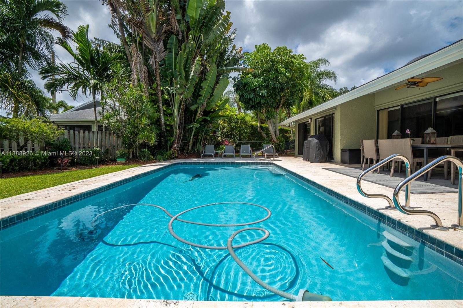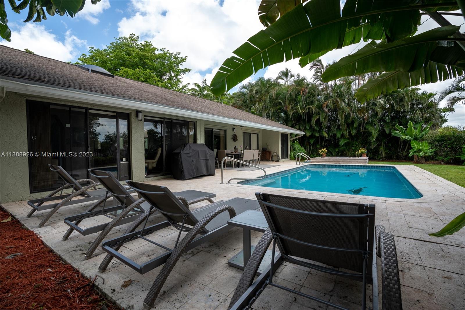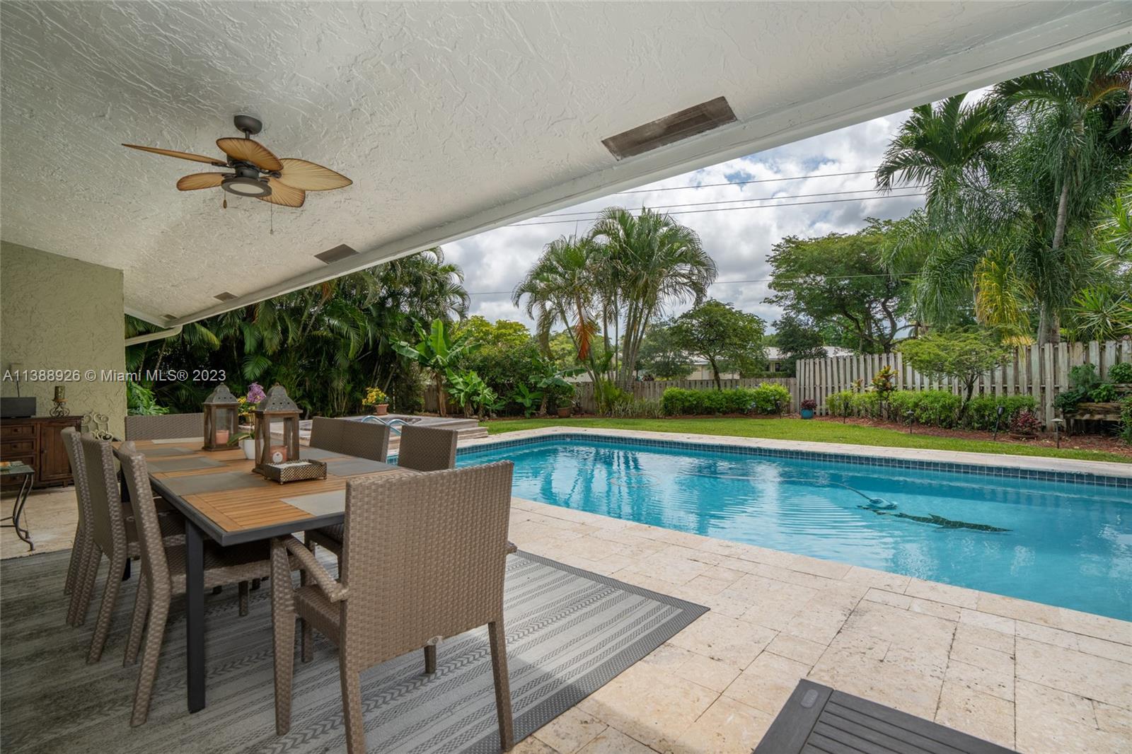 This stunning property has indirect light front and back yard, with a fully functional irrigation system to keep your lawn looking lush and green. With a spacious 2 car garage and attic storage, you'll have plenty of room to store your belongings and vehicles. Newer upgrades include a new roof (2 years old), air conditioning (1-year-old) water heater (2 years old), a new stove, freshly painted exterior, updated electric control panel, central vacuum, new diamond bright surface pool (1 year and 1/2 old), newly renovated bathrooms which exude luxury with modern finishes and fixtures creating a spa-like atmosphere. Nestled on a corner lot beside a cul-de-sac, you'll enjoy a tranquil setting while still being close to local shops, restaurants, and parks.