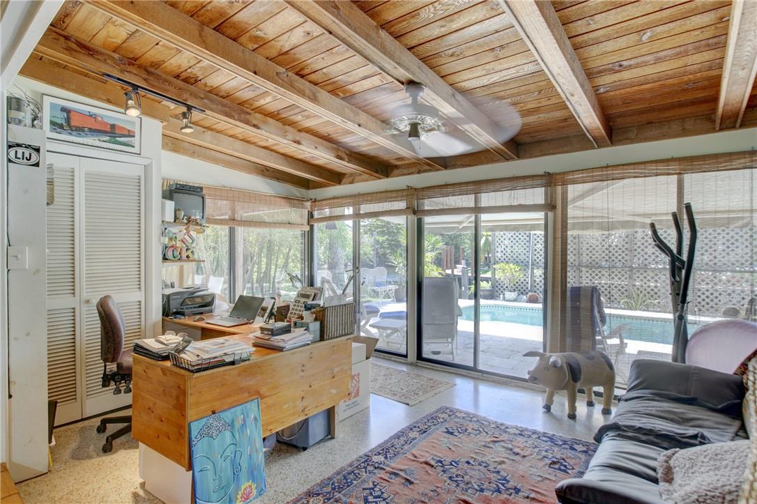 Welcome to the highly sought after Lauderdale Isles. This 2-bed, 2-bath gem is a coastal paradise, highlighting 95 feet of waterfront ocean access without any fixed bridges and a stunning river view. Its open, bright, and airy interior creates a welcoming atmosphere. The pool area features a bar and seating area, ideal for entertaining, south side yard sports a bocce court, while the private dock invites you to explore the waterways at your leisure. Inside features charming terrazzo floors and cedar ceilings. Conveniently located close to major highways, roads, shopping, entertainment, and much more, this home offers convenience and elegance in one. Any / all measurements are estimates and should be verified by the buyer. SURVEY ATTACHED.