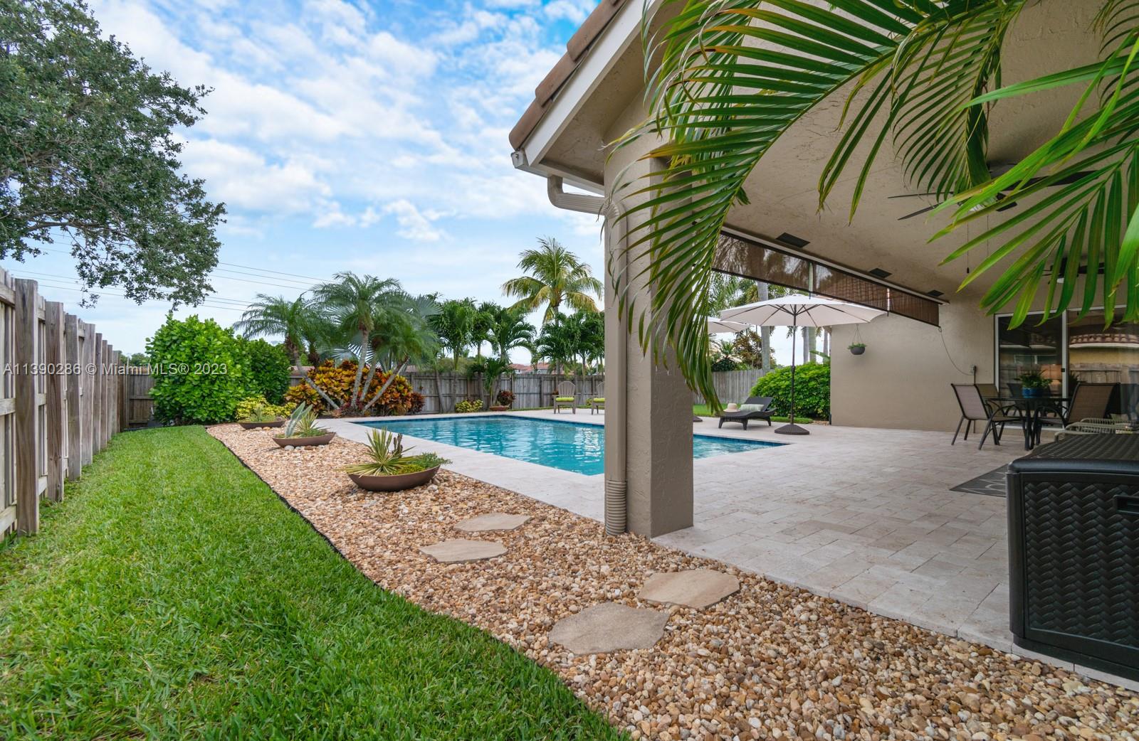 Your future home awaits in this tastefully renovated 3bed 2bath home. A fully remodeled kitchen welcomes you as you walk into this impeccable property. White shaker cabinets, granite tops, modern backsplash, stunning island, deep sink, Whirlpool appl, pull-outs, BONUS pantry, passthrough window. Master w/high, sloped ceilings, view to pool & garden, walk-in closet. Renovated bath, double sinks, separate shower & tub. Tile & laminate floors. Window treatments add elegance & warmth to every space! Remodeled 2nd bath. Laundry w/Whirlpool W&D. Modern style pool, gorgeous backyard, travertine deck. Porch offers shaded area great for relaxing & entertaining. Private fully fenced. 2 sheds. 2-car garage, side door for access. Impact garage door, panels. Tile roof 2009. HOA $370/yr Superb location!