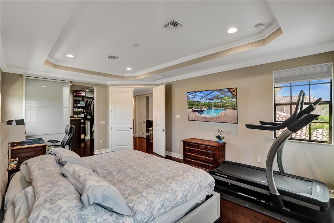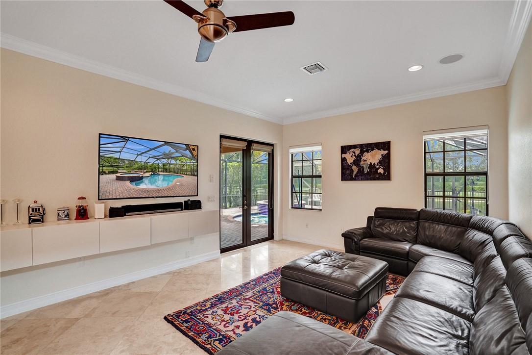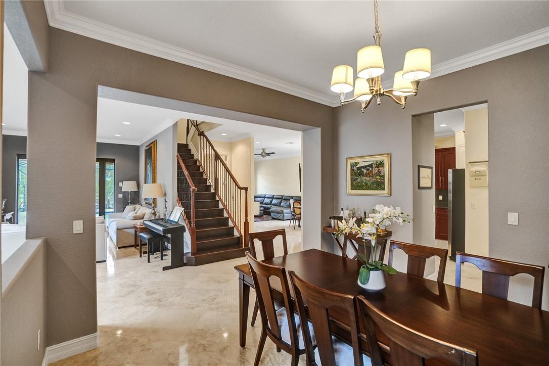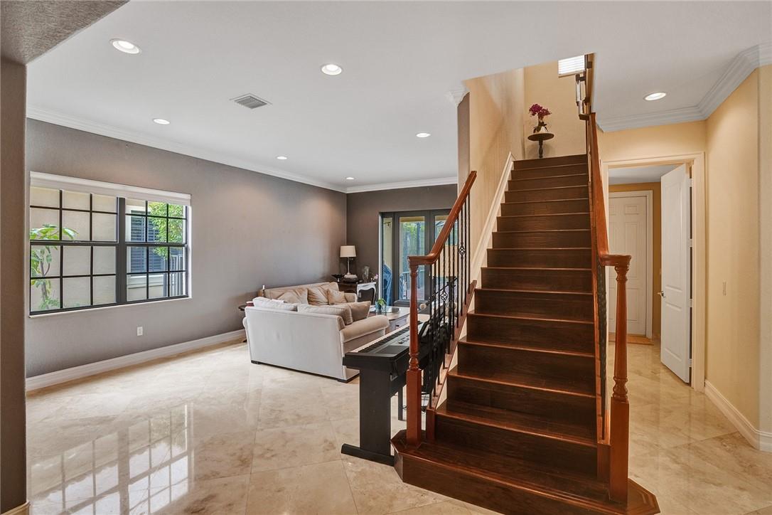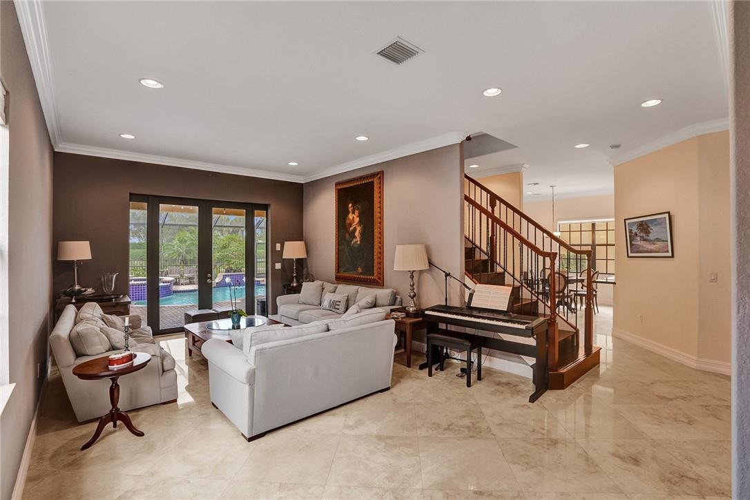 This exquisite 5-bed, 4-bath home w/ 3-car garage spans over 3300 sq ft. Luxury marble flooring 1st flr, 2 newer A/C units, upgraded kitchen, wired for ceiling speakers, dark wood flooring on the stairs & entire 2nd floor. Discover the crowning jewel within the primary bedroom: a sprawling custom "closet room", the perfect sanctuary for your wardrobe. This home features large bedrooms, plus an oversized 2nd master w/ movie theater, large closet & bath. Impact glass & doors for safety & tranquility. Outside, the landscape envelopes a luxurious heated salt system pool & spa. Embrace a vibrant lifestyle: convenient walking access to the A+ schools, an amphitheater, sports fields, basketball courts, & playgrounds. Discover luxury and affordability, with a low monthly HOA fee of just $185.