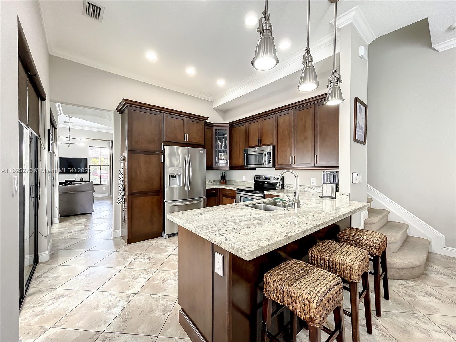 Beautiful open and airy 3 Bedroom 2 1/2 Bath Laguna model in the safe, secure and family-friendly Moneterra gated community. This ready to move-in home features impact windows and doors upstairs. Enjoy cool evenings relaxing on your second floor tiled balcony just off the master bedroom. Custom built in breakfast nook with seating and additional storage right off the kitchen is both architecturally beautiful and functional. Gourmet kitchen includes stainless steel appliances, large 42" dark wood cabinets with built-in's galore, beautiful granite counter tops and illuminated by restoration hardware lighting.All bedrooms feature closets with finished built-in closets. Master suite includes walk-in closet with built-ins and the large glass shower enclosure and sunken tub. This is a must see!