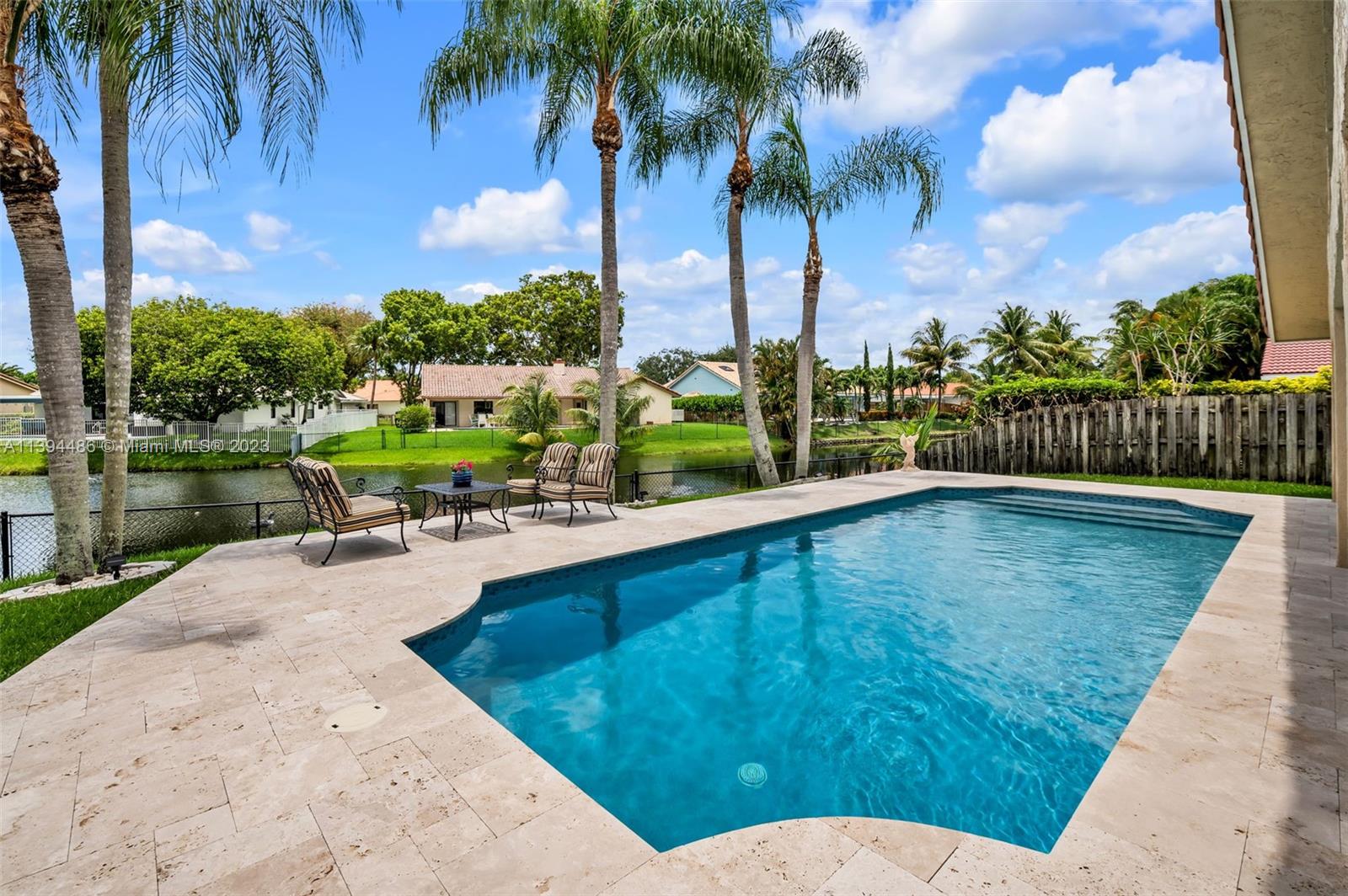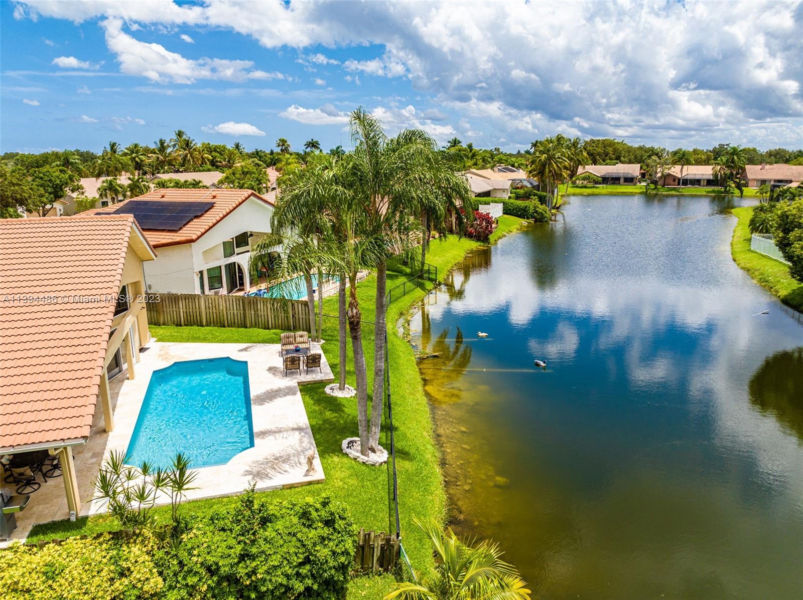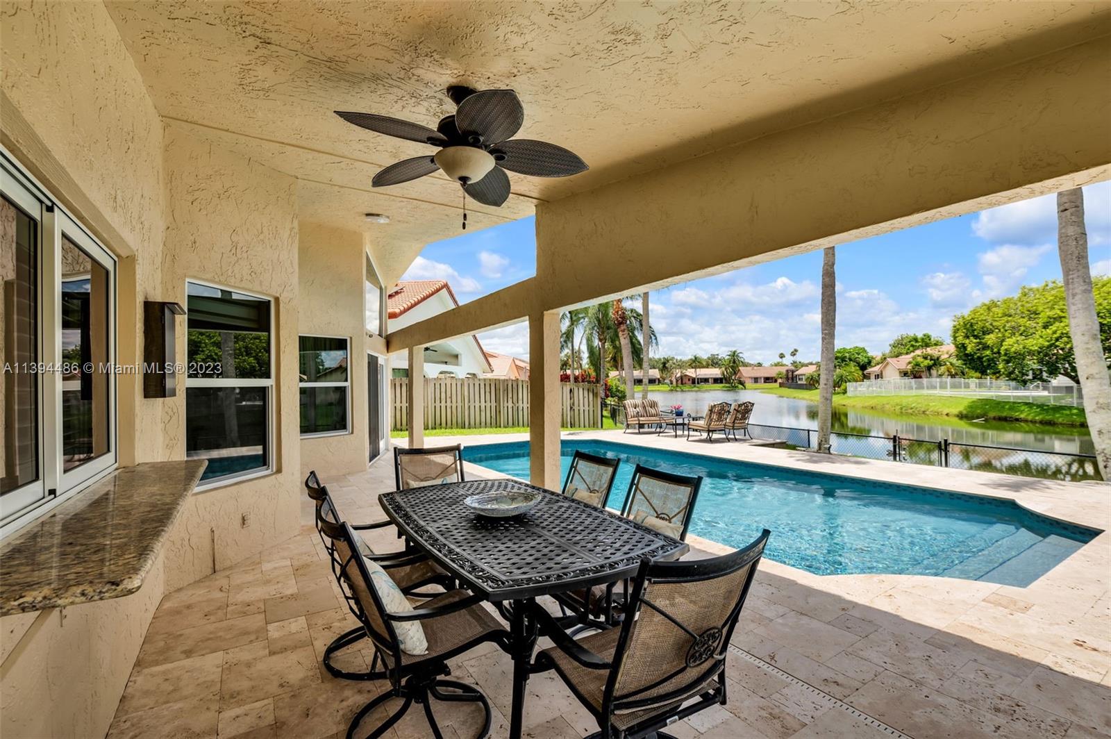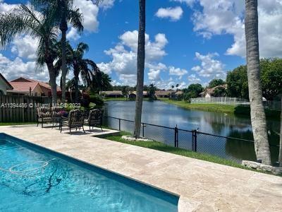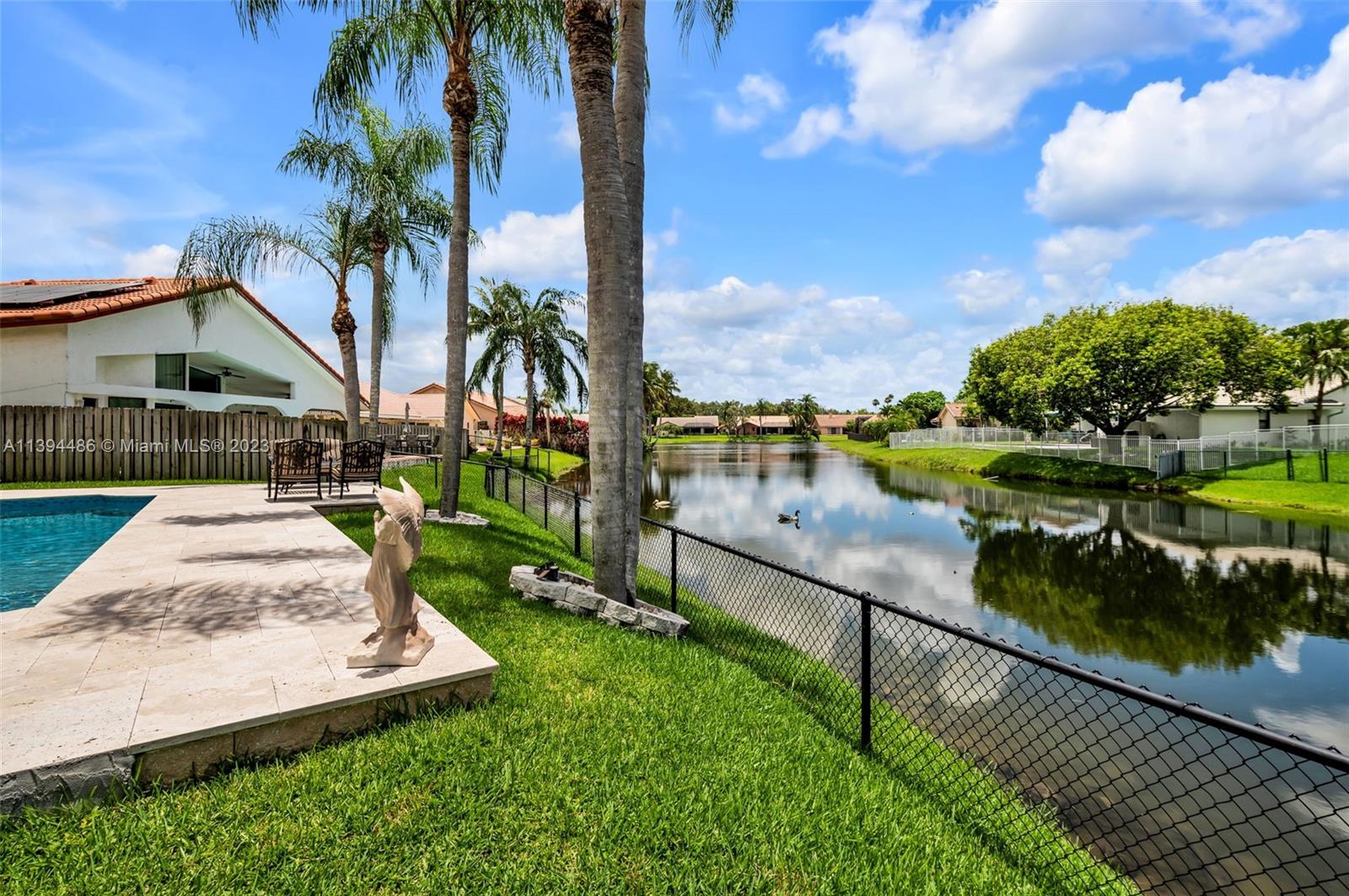 BEAUTIFUL & SPACIOUS WATERFRONT HOME. 4 BEDROOM W/ OFFICE/DEN & 3 FULL BATHS. TOTALLY & IMPRESSIVELY UPDATED. FEATURES ALL HURRICANE IMPACT GLASS AND DOORS EXCEPT FOR FRONT DOOR WHICH HAS HURRICANE PROTECTION, HURRICANE IMPACT GARAGE DOOR, GORGEOUS KITCHEN W ISLAND & LARGE PANTRY, 3 BATHROOMS NEWLY UPDATED, NEUTRAL TILE FLOORING, VOLUME CEILINGS & PLANTATION SHUTTERS THROUGHOUT. LARGE MASTER SUITE WITH SITTING & EXERCISE AREA & TWO LARGE BUILT OUT WALK IN CLOSETS. NEWER WASHER & DRYER. ENJOY SOUTH FLORIDA LIVING WITH FABULOUS & UPDATED POOL WITH NEWLY EXTENDED TRAVERTINE MARBLE PATIO OVERLOOKING LAKE. SPRINKLER WATER FROM LAKE. ROOF REPLACED IN 2008. LOW HOA. LOCATED ON A PICTURESQUE TREE LINED STREET IN DESIRABLE JACARANDA LAKES.