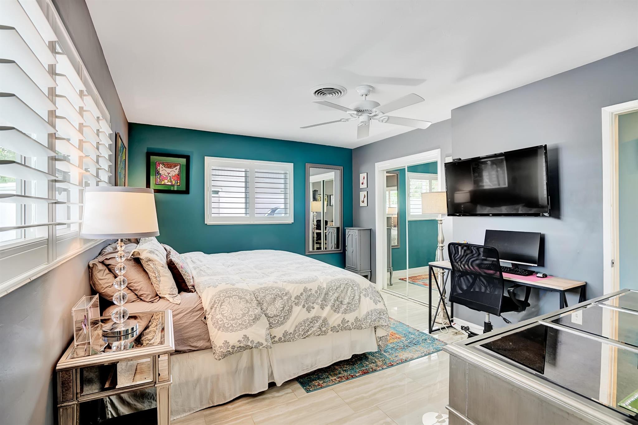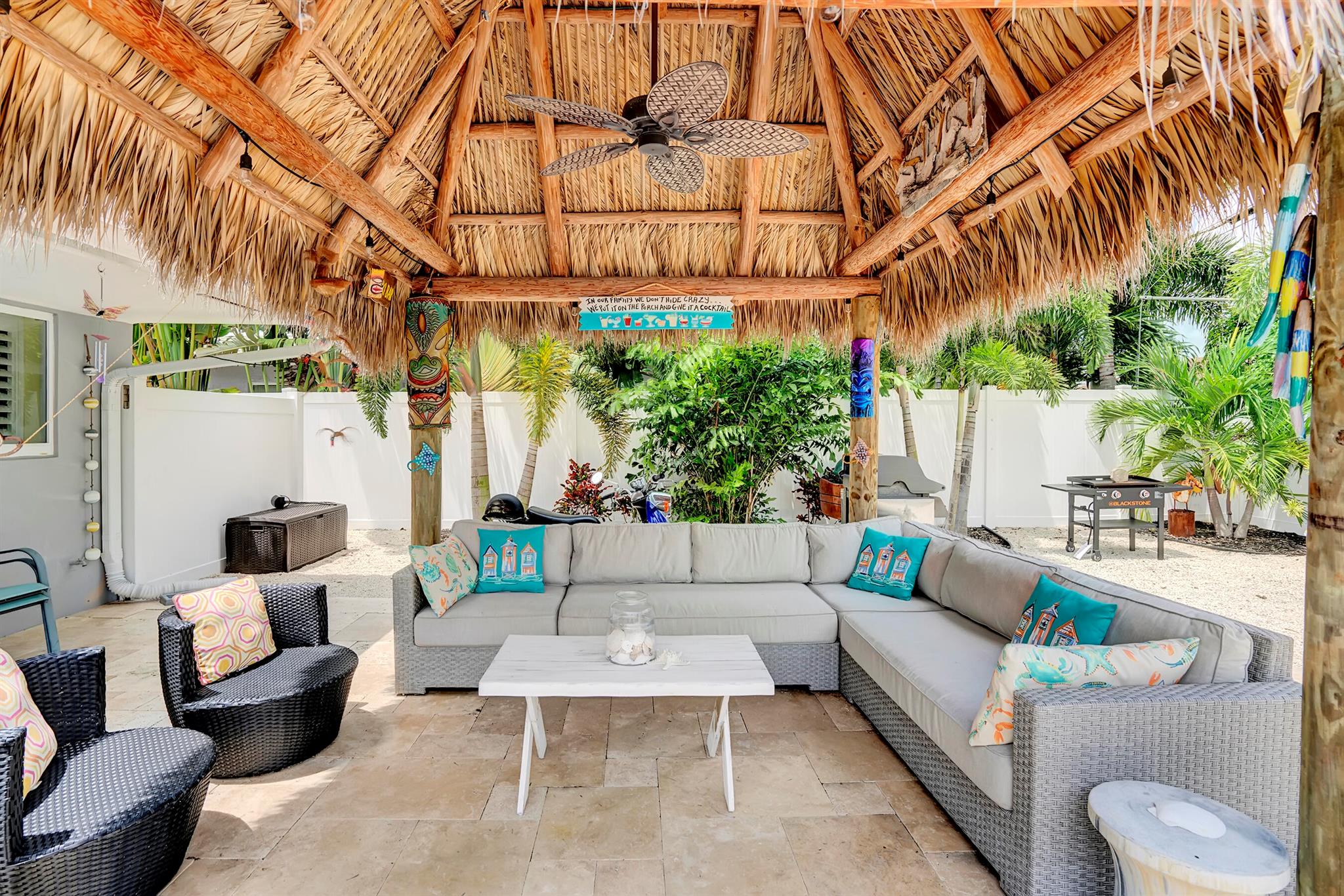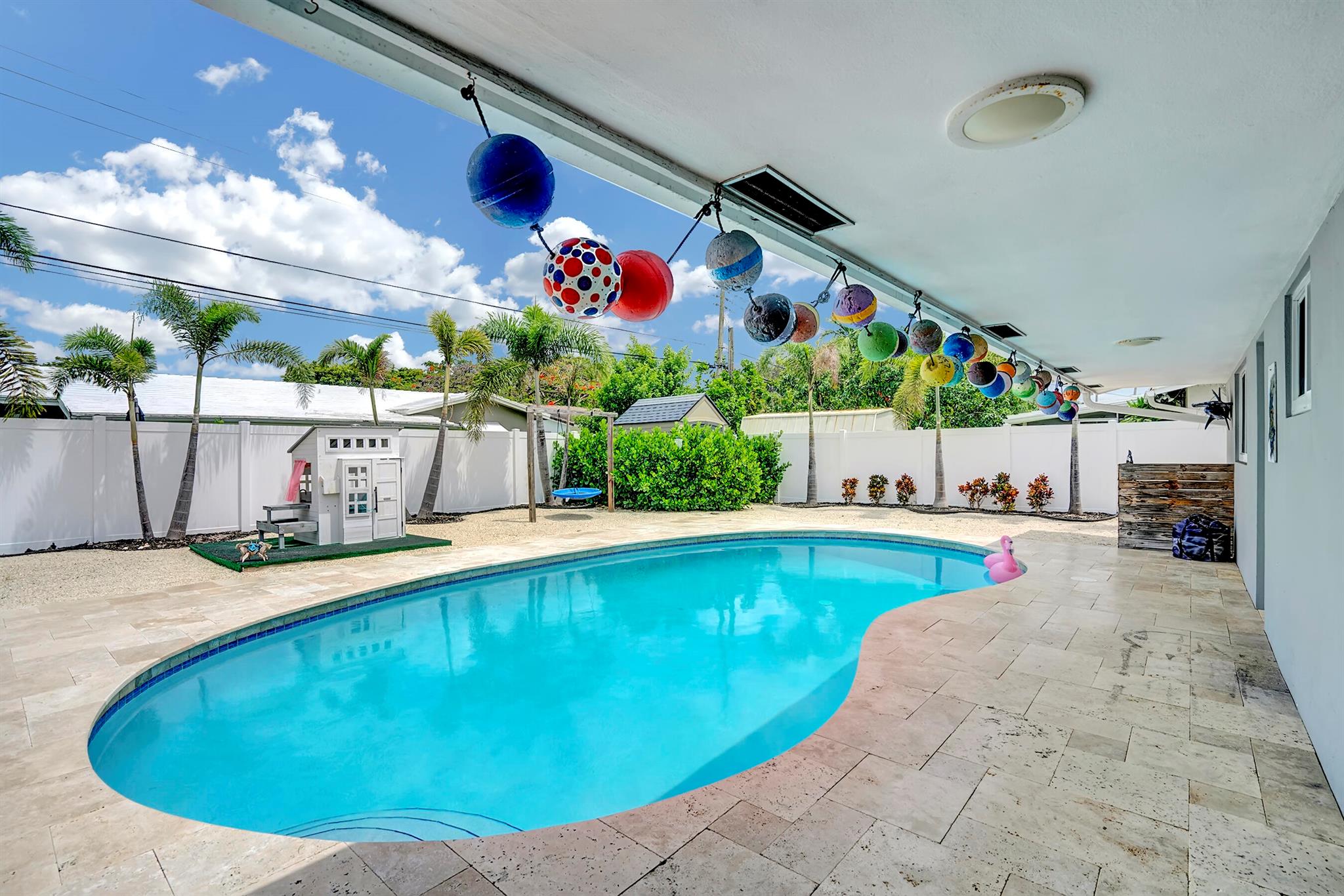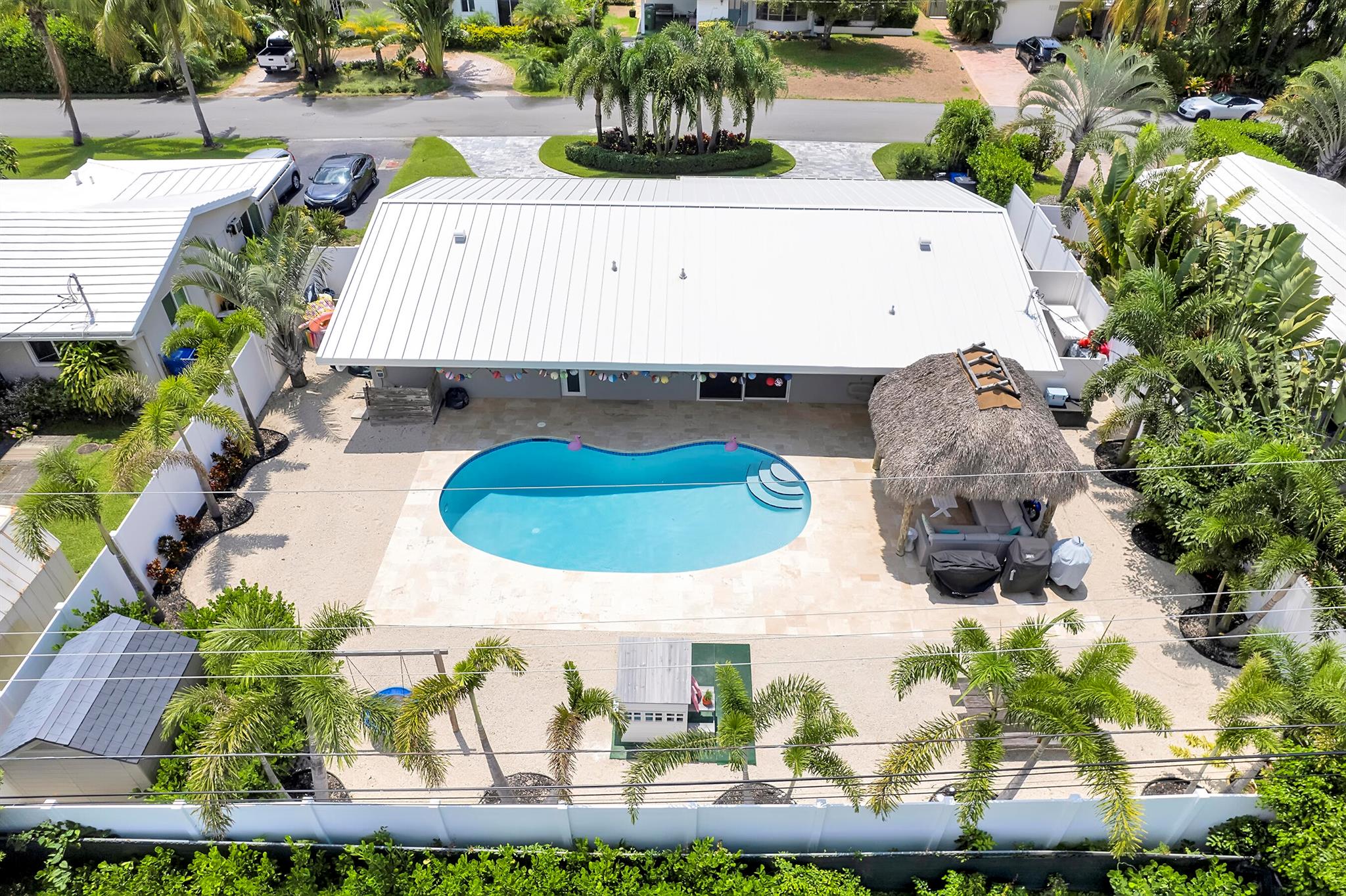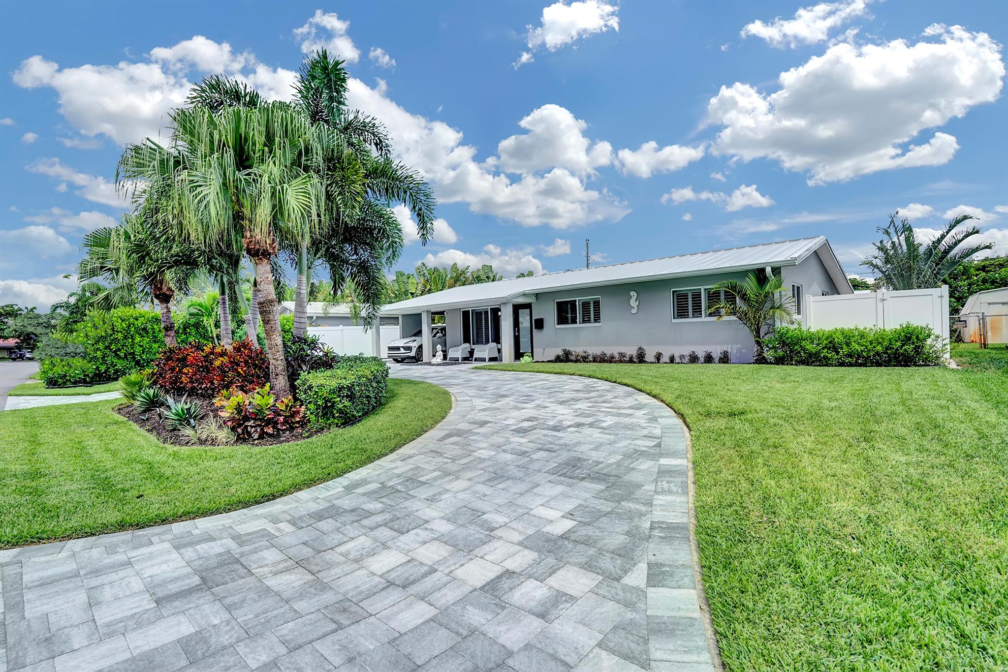 Modern 3/2 Coral Ridge Isles home with lush landscaping welcomes you into its bright, open floor-plan and secluded, resort-style backyard, perfect for entertaining in the sun year-round. Relax by the salt water pool, newer travertine pool deck & Tiki Hut (2018). Aluminum roof (2021) & contemporary impact windows/doors offer security; privacy with custom plantation shutters. Renovated kitchen invites with warm cabinetry, stainless appliances & granite countertops - with easy access for poolside celebrations & grilling. The master bedroom and updated cabana bath provide the welcome solitude you seek. Cheerful, Florida-style second bath and larger bedrooms. Spacious interior laundry room. Upgrades include circular paved drive (2022) with side parking and room for a boat, Ring doorbell