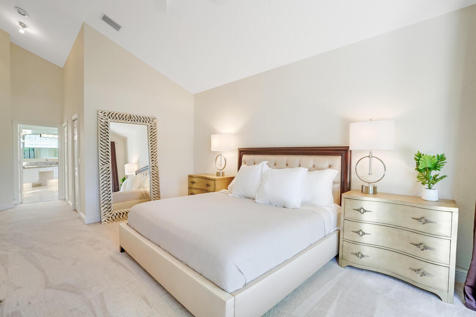 Bright and spacious 3 bedr 3 bath single story in beautiful, amenity filled Woodfield Country Club. This home greets you with high ceilings and walls of windows for fantastic light. The kitchen has white cabinetry and stainless steel appliances, an eat-in dining area, granite counters with a tiled backsplash and a raised bar style seating that opens into the living room. Two spacious living areas and a dining area provide great flowing versatile space for entertainment. Three bedrooms with no shared walls, their own en-suite bathrooms and can fit king size bed sets. The primary suite includes a dual entry closet and a spacious en suite with separate walk in shower and large soaking tub. Covered patio with turf in the backyard and side yard. HOA pool redone in 2022 - 4 minute walk.