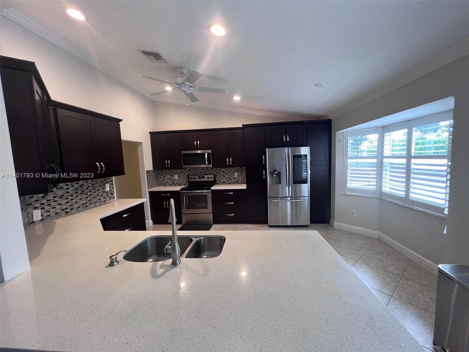 ABSOLUTELY BEAUTIFUL & MOVE-IN READY 3/2 CORNER LOT IN NOB HILL PALMS. Updated Kitchen has a grandiose quartz counter top, counter seating, wood cabinets & with new stainless steel appliances. Large master bedroom, with walk-in closet, master bath that has large shower, vanity space & built-in cabinet. Open floor living/dining room area. Crown molding, tile, plantation shutters. Hurricane impact windows, doors and garage door. Roof is approximate 4 years old. The pool is surrounded by lush landscaping for privacy. Great schools, nearby shopping, highway and parks.
