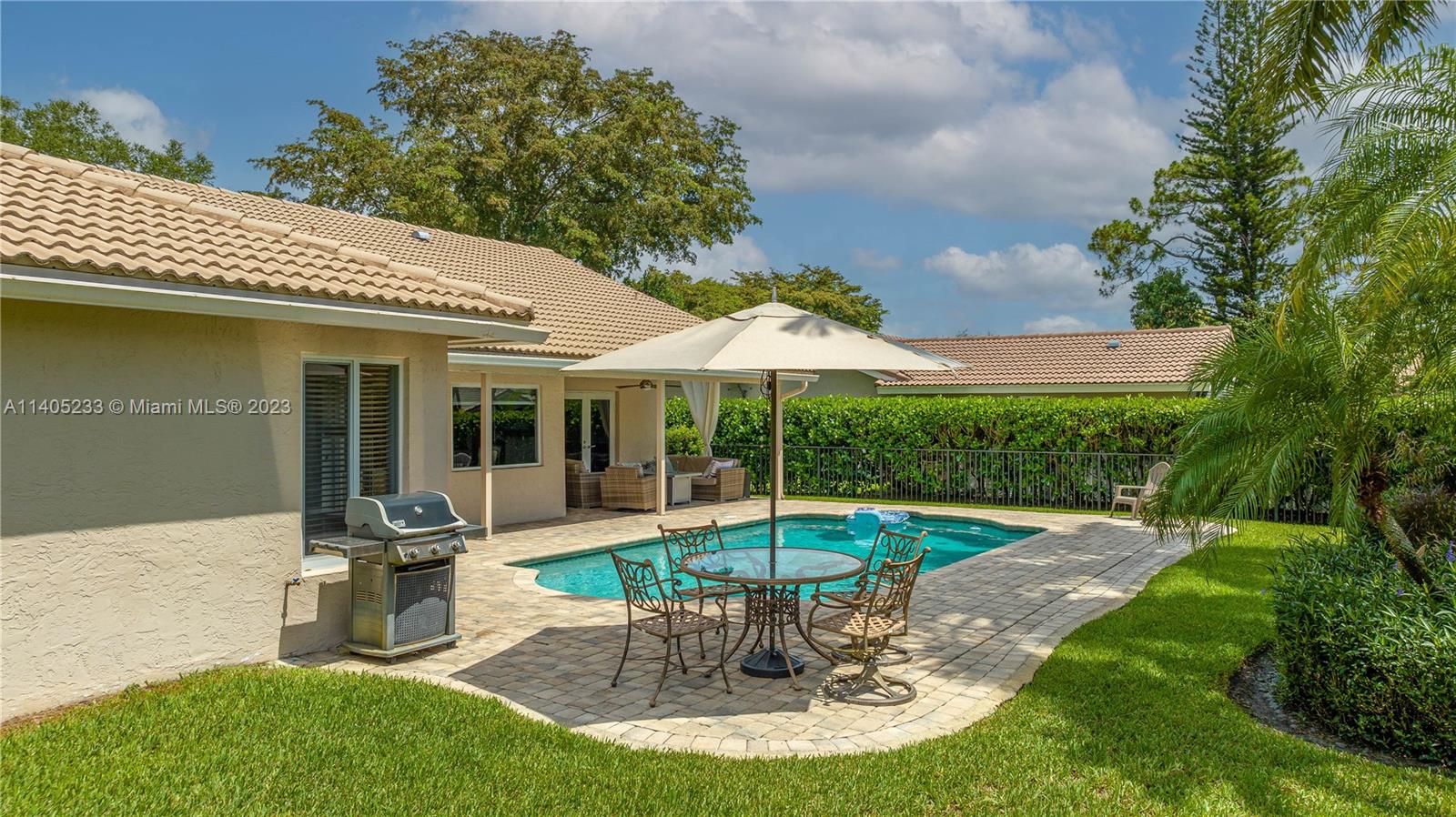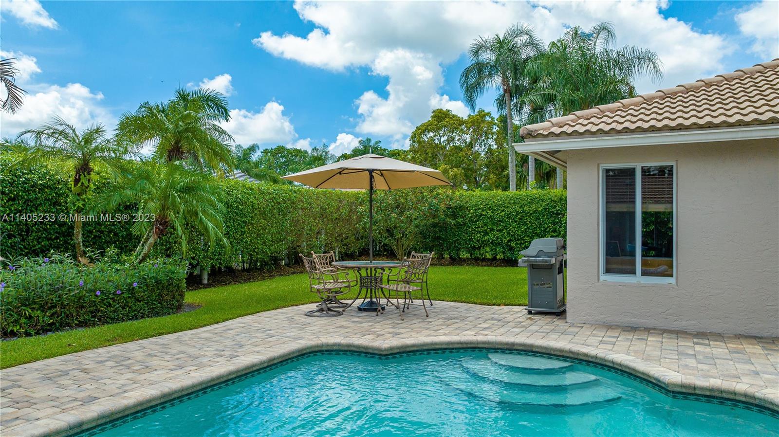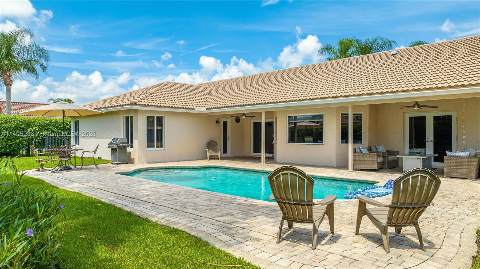 Beautiful 5/2.5 pool home located in the coveted Pine Ridge Community of Coral Springs. This immaculate home features an upgraded, modern kitchen with shaker cabinets, built-in refrigerator, stainless steel appliances and granite counter tops. There are *impact windows and doors* throughout for your protection. The home boasts Jerusalem stone and wood floors throughout, upgraded bathrooms, closet built-ins and neutral colors throughout. Enjoy your own private oasis in the backyard with a large heated pool, spacious patio and tropical landscaping. Air conditioner is 2014, hot water heater heater 2021, roof 2005. This home is move in ready!