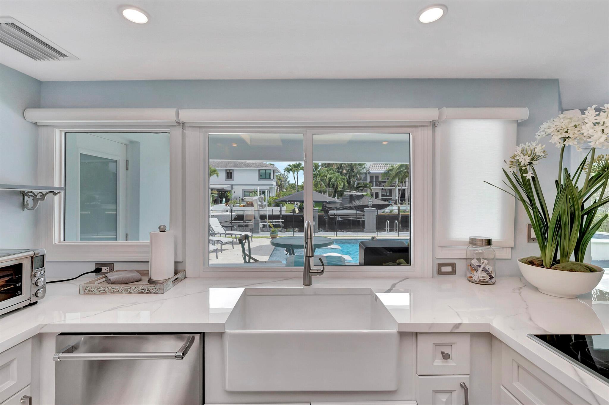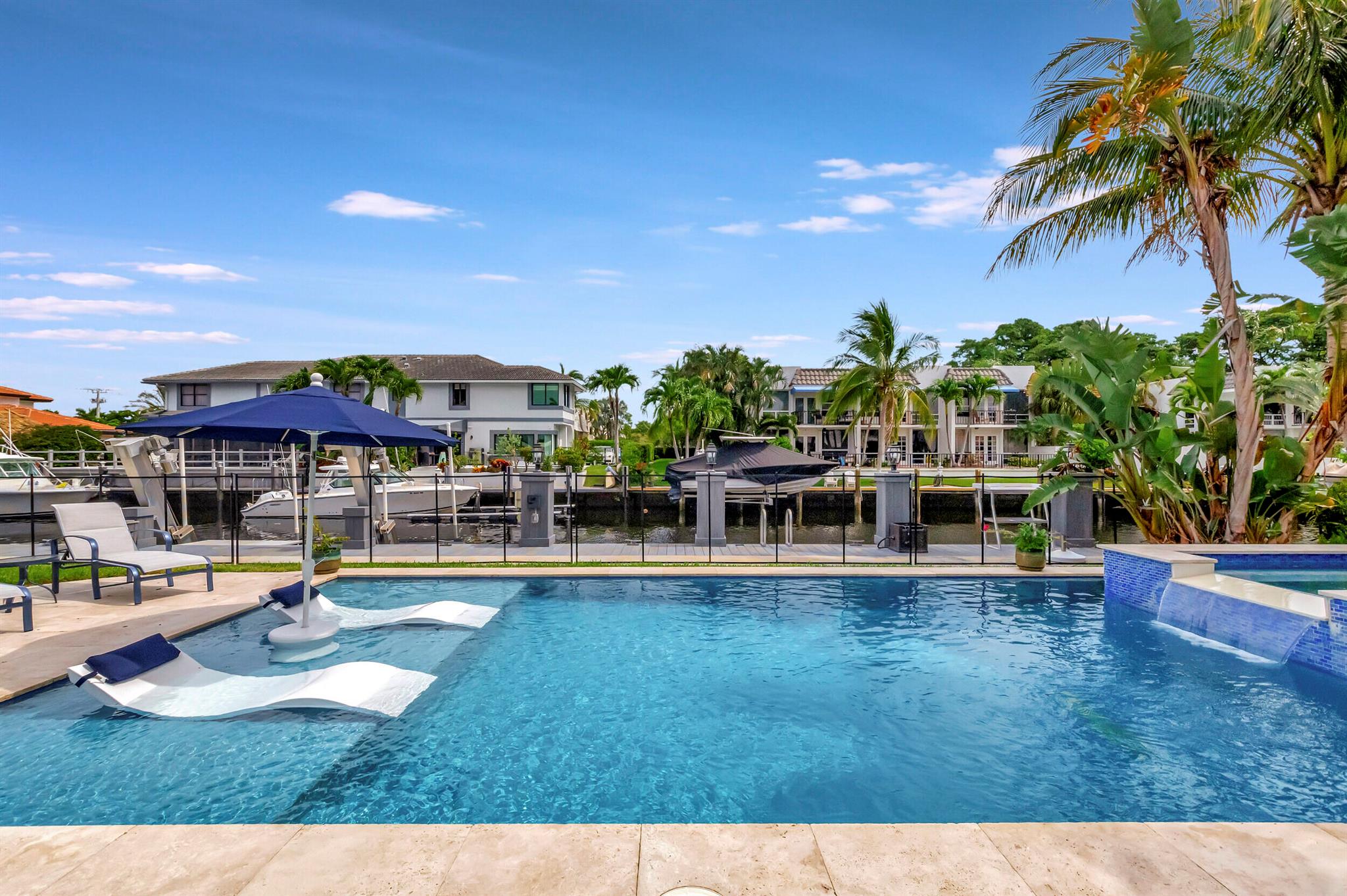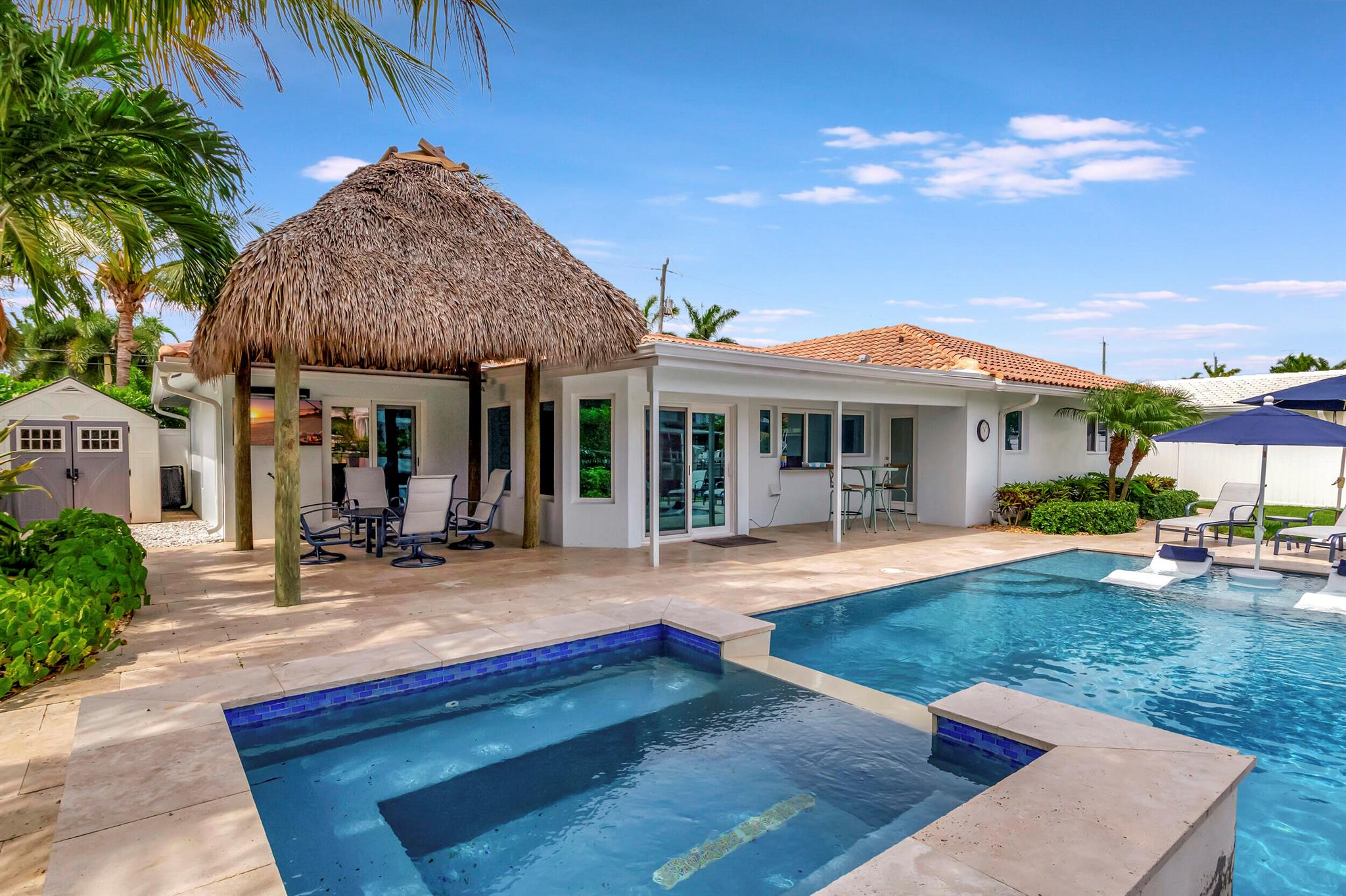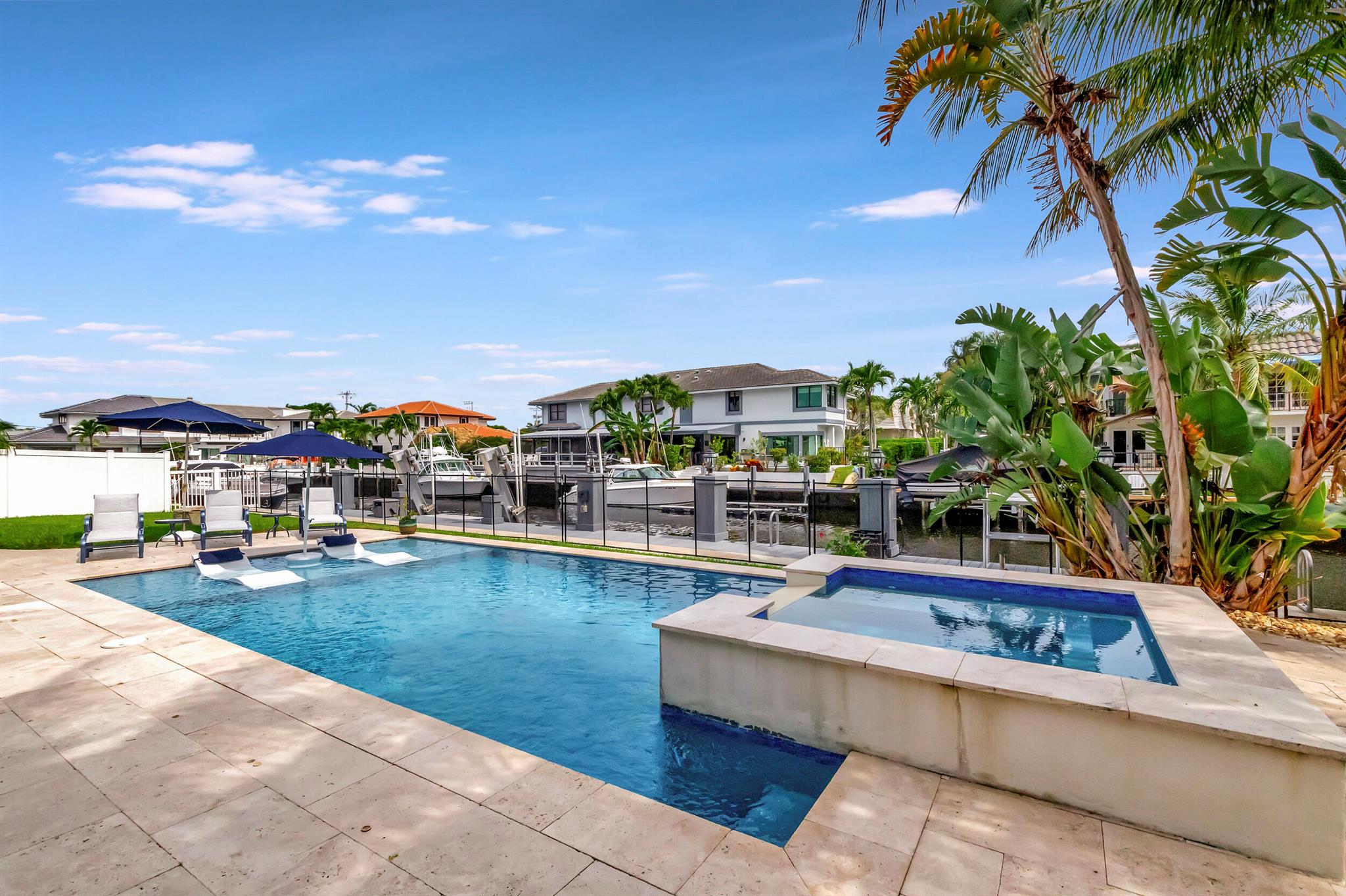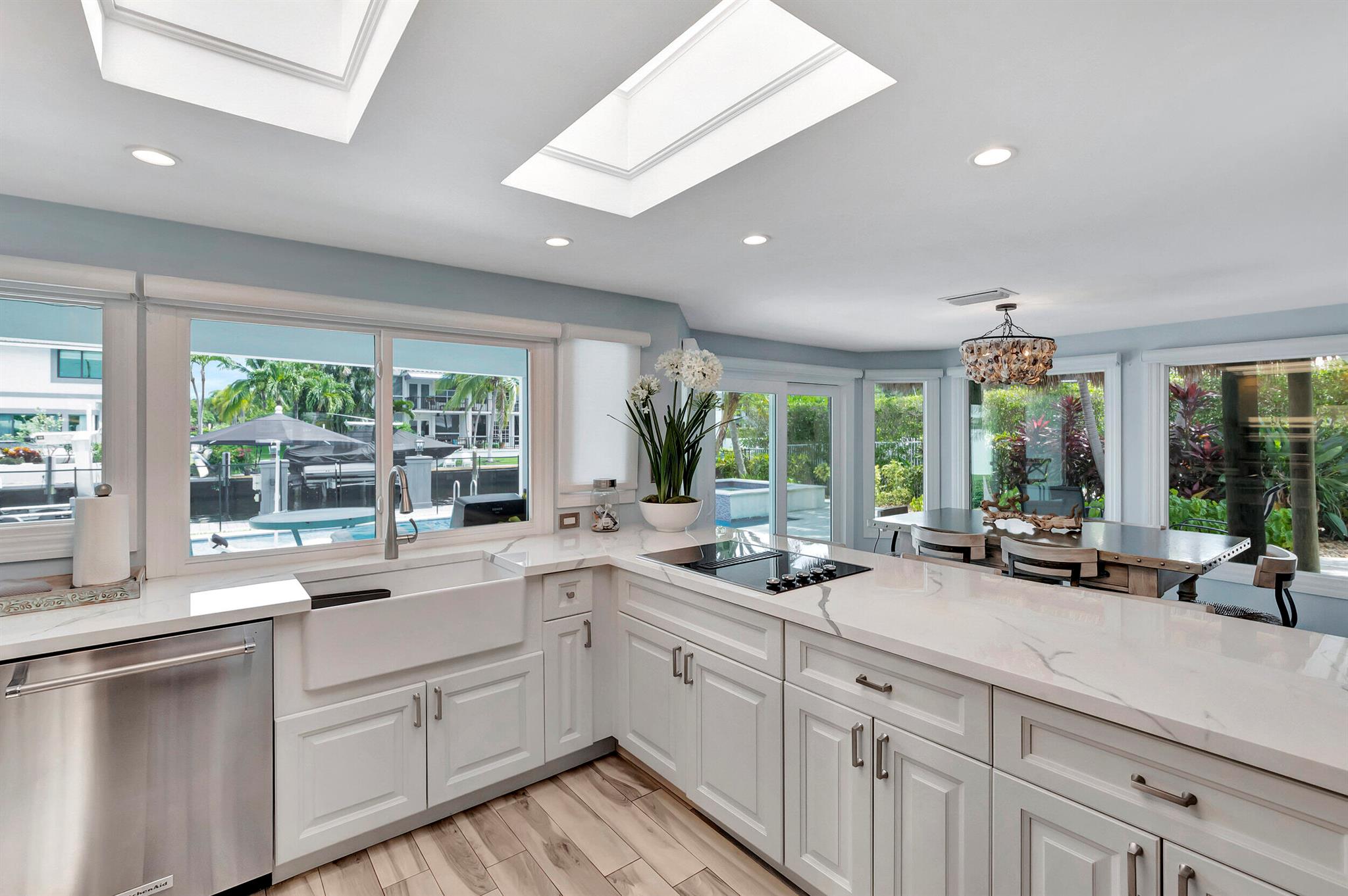 PRICE IMPROVEMENT on this stunning, east Boca Raton, waterfront home with 83 ft of water frontage, no fixed bridges and ocean access. It has been beautifully updated with wide plank tile flooring throughout, bright and open kitchen with a passthrough bar to outside.The appliances are all top-of-the-line Kitchen Aid ,Wine refrigerator, farmers sink and Quartz counters. There are also two kitchen skylights that bring the outside in. 3-bedroom Split floor plan PLUS a separate office/ den. Open formal living room, dining / eat in area. Vacation every day in the heated pool and spa, Tiki hut w/ TV dock, deck. The pool was built 2017 and has LED pool light automation. Both pool and dock have child safety fence. and over 2,000 sf of Ivory Travertine patio decking.