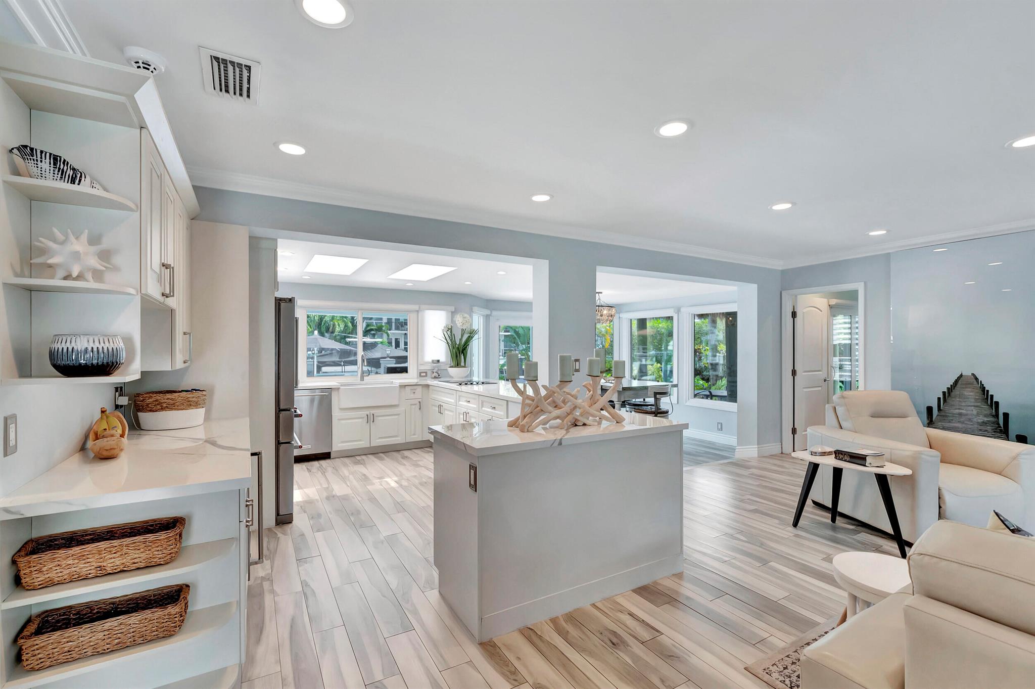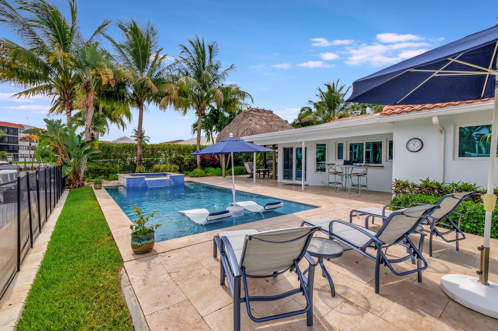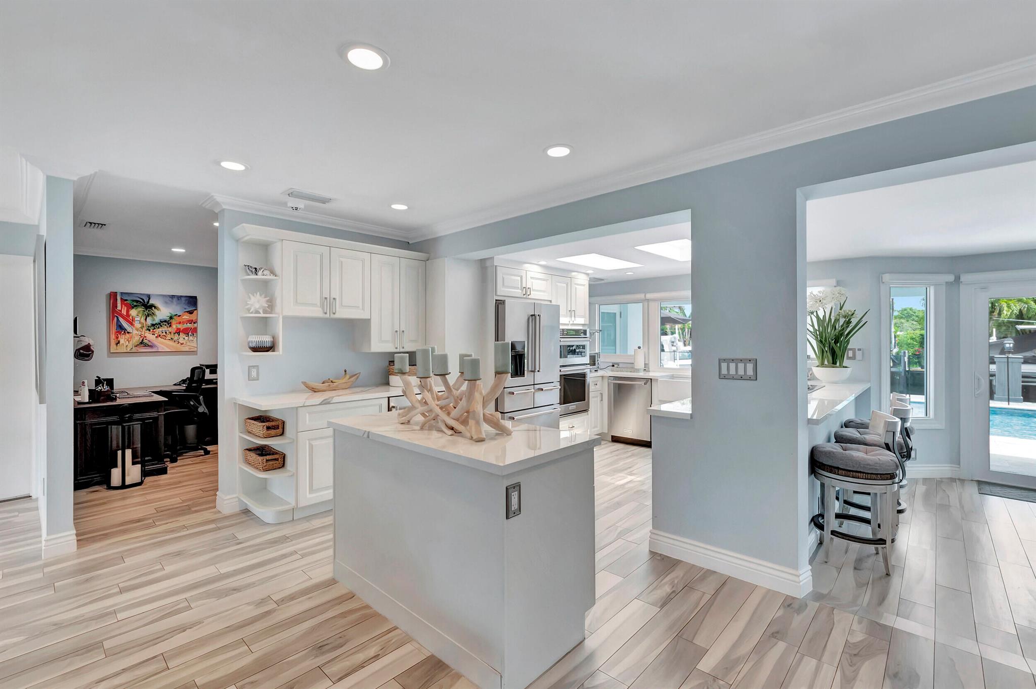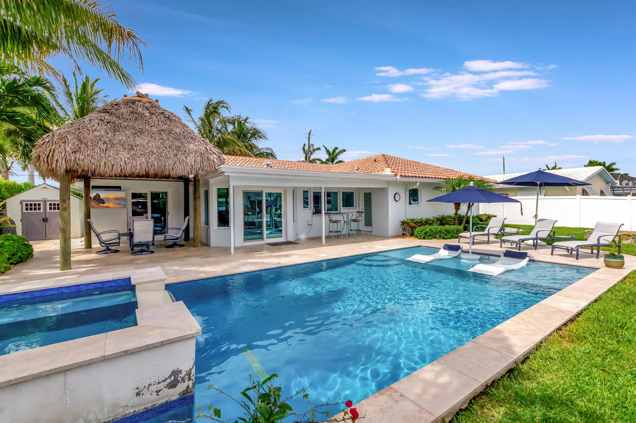 PRICE IMPROVEMENT on this stunning, east Boca Raton, waterfront home with 83 ft of water frontage, no fixed bridges and ocean access. It has been beautifully updated with wide plank tile flooring throughout, bright and open kitchen with a passthrough bar to outside.The appliances are all top-of-the-line Kitchen Aid ,Wine refrigerator, farmers sink and Quartz counters. There are also two kitchen skylights that bring the outside in. 3-bedroom Split floor plan PLUS a separate office/ den. Open formal living room, dining / eat in area. Vacation every day in the heated pool and spa, Tiki hut w/ TV dock, deck. The pool was built 2017 and has LED pool light automation. Both pool and dock have child safety fence. and over 2,000 sf of Ivory Travertine patio decking.