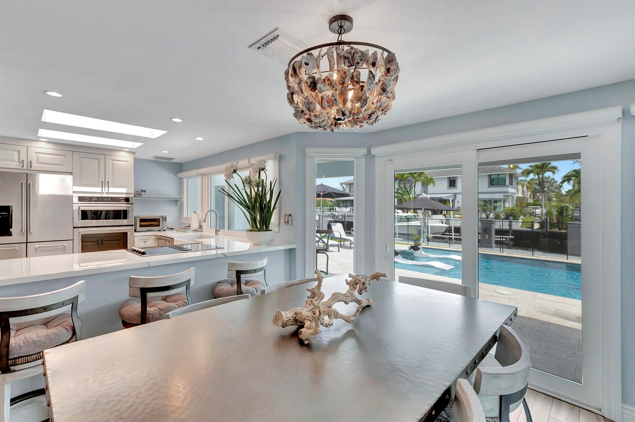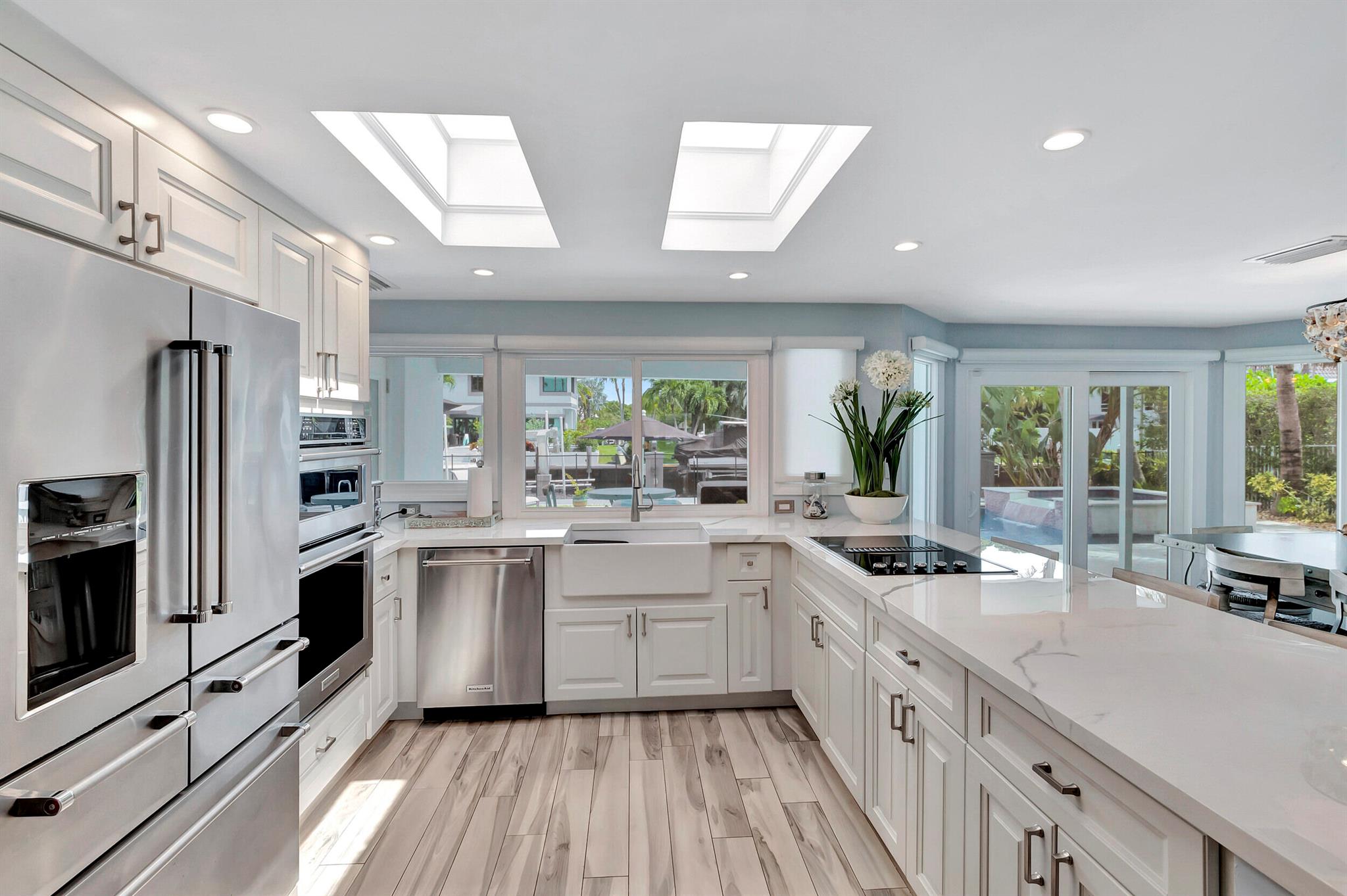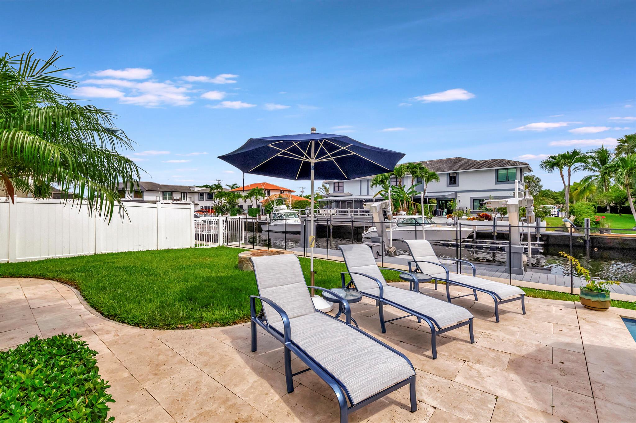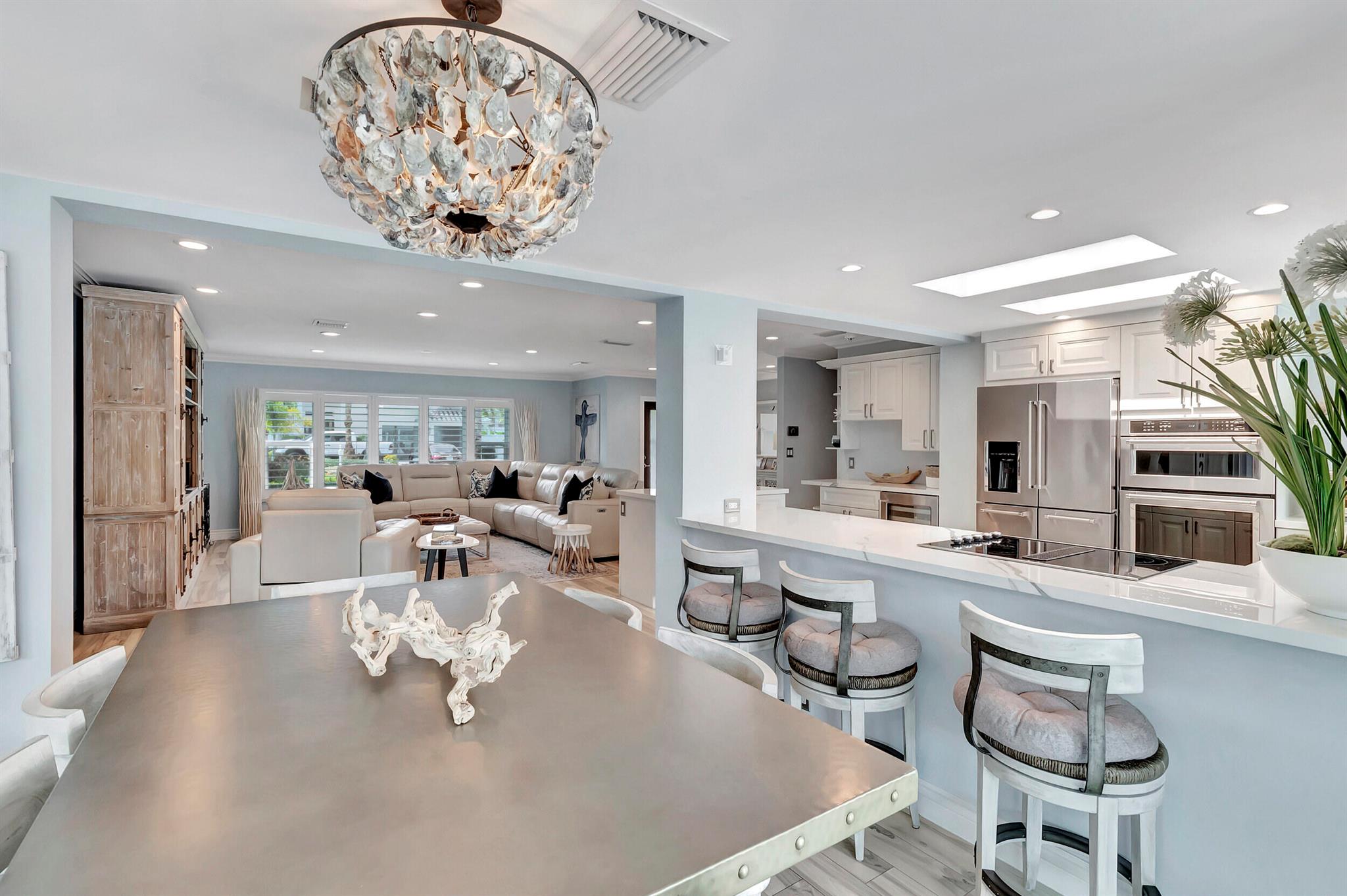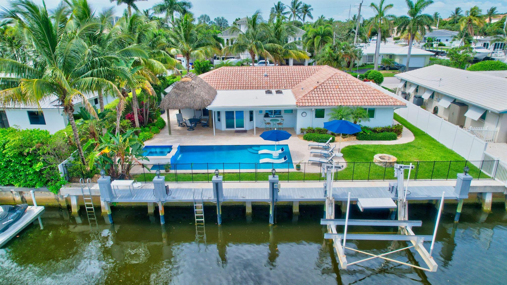 PRICE IMPROVEMENT on this stunning, east Boca Raton, waterfront home with 83 ft of water frontage, no fixed bridges and ocean access. It has been beautifully updated with wide plank tile flooring throughout, bright and open kitchen with a passthrough bar to outside.The appliances are all top-of-the-line Kitchen Aid ,Wine refrigerator, farmers sink and Quartz counters. There are also two kitchen skylights that bring the outside in. 3-bedroom Split floor plan PLUS a separate office/ den. Open formal living room, dining / eat in area. Vacation every day in the heated pool and spa, Tiki hut w/ TV dock, deck. The pool was built 2017 and has LED pool light automation. Both pool and dock have child safety fence. and over 2,000 sf of Ivory Travertine patio decking.